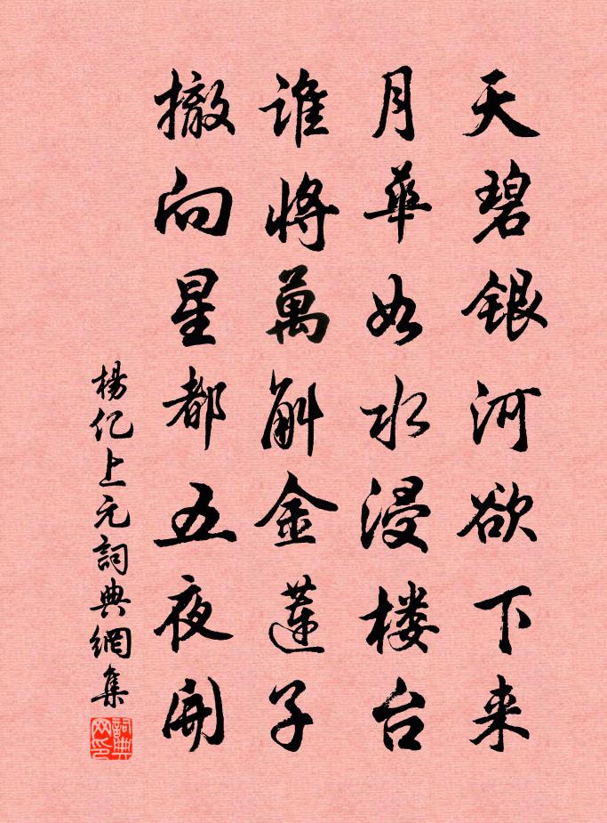 詩詞名句歷史字典書法欣賞書法字典國語詞典說文解字康熙字典古漢語字典標 題 作 者 詩 句 上元作者:楊億 朝代:宋代上元原文天碧銀河欲下來,月華如水浸樓台。誰將萬斛金蓮子,撤向星都五夜開。詩詞問答問:上元的作者是誰?答:楊億問:上元寫於哪個朝代?答:宋代楊億上元書法欣賞上元書法作品詩詞推薦四山任鼓院傅夢得〔宋代〕曾向西風把別杯,知君黃色上眉催。浙江莫道音書隔,一日潮聲兩度來。秋日西望宋祁〔宋代〕晚襟清曠屬層樓,搖落乾坤共作秋。正為中山存闕意,得無平子側知愁。琢玉丁居晦〔唐代〕卞玉何時獻,初疑尚在荊。琢來聞制器,價衒勝連城。虹氣沖天白,雲浮入信貞。珮為廉節德,杯作侈奢名。露璞長沙陪裴大夫登北樓李群玉〔唐代〕岩嶂隨高步,琴尊奉勝游。金風吹綠簟,湘水入朱樓。朗抱雲開月,高情鶴見秋。登臨多暇日,非為賦消憂。浣溪沙辛棄疾〔宋代〕妙手都無斧鑿瘢。飽參佳處卻成顰。恰如春入浣花村。筆墨今宵光有艷,管弦從此悄無言。主人席次兩眉軒。雜曲歌辭。行路難翁綬〔唐代〕行路艱難不復歌,故人榮達我蹉跎。雙輪晚上銅梁雪,一葉春浮瘴海波。自古要津皆若此,方今失路欲如何。君看九吟詩飛玉吳昌裔〔宋代〕誰擘岩扉石竇開,中流玉水潄蒼苔。有時卷雪從天下,端是源頭蓄得來。舟趙葵〔宋代〕櫓聲伊軋下漓來,驚起沙鷗去又回。小艇暫停曲江游,推篷和雪看寒梅。南園新舟成呈同游諸友陳宓〔宋代〕虛舟當畫橋,解纜綠楊腰。月白天相近,風清水不搖。浮圖明突兀,略彴夸虛遙。解逅成真賞,初晴第一宵。送趙都督赴代州得青字王維〔唐代〕天官動將星,漢上柳條青。萬里鳴刁斗,三軍出井陘。忘身辭鳳闕,報國取龍庭。豈學書生輩,窗間老一經。游寶雨寺李復〔宋代〕信步出江{左舟右龍},庭松立兩龍。晨僧自汲水,高閣忽鳴鐘。淨飯多山蜜,新羹供野葑。傳聞初祖錫,猶掛最李堅甫淨居雜題一十三首琴室文同〔宋代〕將何寫幽意,有此古桐聲。為問好彈處,誰來聽蟹行。霜夜陸游〔宋代〕黃甘磊落圍三寸,赤蟹輪囷可一斤。更喚東陽麴道士,與君霜夜策奇勳。疏黑白無從釋重顯〔宋代〕天地不仁,萬化蠢蠢。若謂非緣,竹何從筍。發兮發兮,黑白是準。翌日阻雨次前韻黃庭堅〔宋代〕愁雲垂垂雨淫淫,野館重賦思歸吟。老農那問客心苦,但喜粟粒如黃金。浣溪沙趙可〔元代〕抬轉爐熏自換香。錦衾收拾卻遮藏。二年塵暗小鴛鴦。落木蕭蕭風似雨,疏欞皎皎月如霜。此時此夜最淒涼。江城梅花引佚名〔宋代〕逋仙千載獨知心。別無人。淚痕深。長是自開自落自成陰。白石後來疏影句,饒綺麗,總輸他、清淺吟。傷情。傷挽吳君謀少卿二首劉克莊〔宋代〕立德尤高似立言,常嗟此語欠精論。鄴侯架冷惟書在,董子陵荒有策存。太息晚猶條世務,大招未易返騷魂。薤歌題杜子美書室趙抃〔宋代〕直將騷雅鎮澆淫,瓊貝千章照古今。天地不能籠大句,鬼神無處避幽吟。幾逃兵火羈危極,欲厚民生意思深。茅屋游建康碧瑤洞万俟紹之〔宋代〕洞口篔簹幾百竿,洞深襟袂易生寒。鹿眠桃塢春常在,鶴唳松梢夜未闌。瓦鼎香騰秋霧薄,石盤棋撒曉星殘。道人名句推薦春秋代序,陰陽慘舒,物色之動,心亦搖焉。劉勰《文心雕龍·物色》 烈士暮年,壯心不已。曹操《龜雖壽》 一樹春風千萬枝,嫩於金色軟於絲。白居易《楊柳枝詞》 可有梅花寄一枝?雪來翠羽飛。吳錫麒《長相思·以書寄西泠諸友即題其後》 衣貴潔,不貴華。上循分,下稱家。李毓秀《弟子規·謹》 勸君莫惜金縷衣,勸君惜取少年時。杜秋娘《金縷衣》 相思記取,愁絕西窗夜雨。韓元吉《薄倖·送安伯弟》 上善若水,水善利萬物而不爭。老子《老子·道經·第八章》 見梨花初帶夜月,海棠半含朝雨。万俟詠《三台·清明應制》 天秋月又滿,城闕夜千重。戴叔倫《客夜與故人偶集 / 江鄉故人偶集客舍》