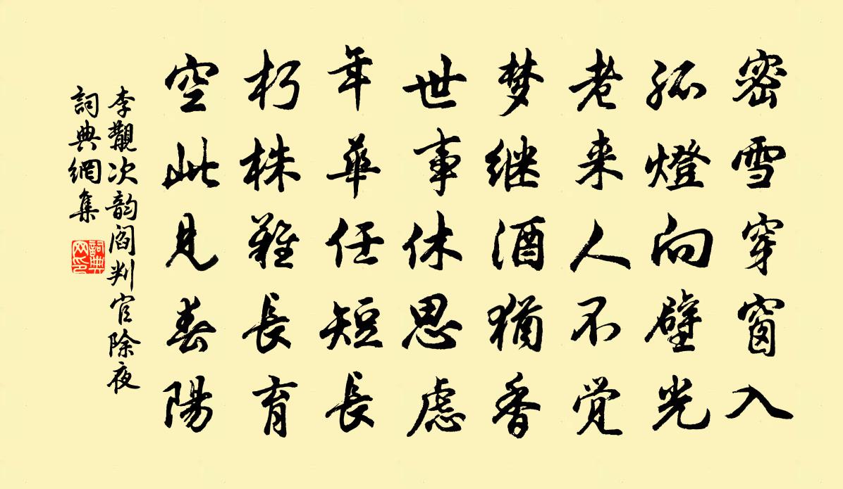 詩詞名句歷史字典書法欣賞書法字典國語詞典說文解字康熙字典古漢語字典標 題 作 者 詩 句 次韻閻判官除夜作者:李覯 朝代:宋代次韻閻判官除夜原文密雪穿窗入,孤燈向壁光。老來人不覺,夢繼酒猶香。世事休思慮,年華任短長。朽株難長育,空此見春陽。詩詞問答問:次韻閻判官除夜的作者是誰?答:李覯問:次韻閻判官除夜寫於哪個朝代?答:宋代李覯次韻閻判官除夜書法欣賞次韻閻判官除夜書法作品詩詞推薦送少卿張學士知洪州梅堯臣〔宋代〕朱旗畫舸一百尺,五月長江水拍天。穩去先應望廬岳,暫來誰復見龍泉。閣經吏部重為記,山識吳天舊鑄錢。往跡送省玄上人歸江東許棠〔唐代〕釋律周儒禮,嚴持用戒身。安禪思剡石,留偈別都人。雨合吳江黑,潮移海路新。瓶盂自此去,應不更還秦。又書畫船五首孫嵩〔宋代〕不聽{怒心換斤}音分外閒,穩裝書畫一蓬間。今朝風雨苕川上,撲灑沙鷗第幾灣。句李良臣〔宋代〕侯家榮經山水縣,勝致絕出西南州。漁家傲周紫芝〔宋代〕遇坎乘流隨分了。雞蟲得失能多少。兒輩雌黃堪一笑。堪一笑。鶴長鳧短從他道。幾度秋風吹夢到。花姑溪上人空唐昌文輓詩魏了翁〔宋代〕重葩殗葉露華濃,不忝家聲得似公。休息生靈牙頰里,轉移事變笑譚中。卻將仕宦四千石,換取寬閒五百弓。歲路贈劉方處士呂岩〔唐代〕六國愁看沉與浮,攜琴長嘯出神州。擬向煙霞煮白石,偶來城市見丹丘。受得金華出世術,期於紫府駕雲遊。年來煮茶晏殊〔宋代〕稽山新茗綠如煙,靜挈都藍煮惠泉。未向人間殺風景,更持醪醑醉花前。次韻竹溪題達卿後坡劉克莊〔宋代〕歲計無餘逢谷貴,晚餐有味覺蔬嘉。賒鄰人酒堪留客,藏善和書尚滿家。稍喜熊兒理精熟,常嫌犬子賦虛誇。魯論初入峽山效孟東野范成大〔宋代〕峽山逼而峻,峽泉湍以碕。峽草如毨毛,峽樹多樛枝。峽禽惟杜鵑,血吻日夜啼。峽馬類黃狗,不能長鳴嘶。峽曉柳梢青韓淲〔宋代〕雲淡秋空。一江流水,煙雨濛濛。岸轉溪回,野平山遠,幾點征鴻。行人獨倚孤篷。算此景、如圖畫中。莫問功名和陶弼思柳亭韻韋旻〔宋代〕白雲靉靉結相緣,半夜鏌鏘舞醉仙。五百年來得書記,羅洪溪畔浴沂年。越裳獻白翟(一作丁仙芝詩)佚名〔唐代〕聖哲符休運,伊皋列上台。覃恩丹徼遠,入貢素翬來。北闕欣初見,南枝顧未回。斂容殘雪淨,矯翼片雲開。馴擾送僧歸天寧萬年禪院楊億〔宋代〕暫別雲山幾度瓜,方袍初日耀蘭芽。吟詩池上生春草,說法庭中散寶華。桂檝去依隨岸柳,松軒歸賞赤城霞。御書頌古十一首釋鹹傑〔宋代〕天高地厚人難見,海闊山遙只自知。勘破卻回休借部,得便宜是落便宜。仁宗皇帝輓辭四首王安石〔宋代〕去序三朝聖,行崩萬國天。憂勤無曠古,治洽最長年。仁育齊高厚,哀思罄幅員。欲知千載美,道德冠遺編。寄沅州新守謝麟陶弼〔宋代〕險盡開開溪路平,詩書新將典新城。三千戍卒今無幾,十萬屯田古未耕。屬縣乞除防虎檻,生蠻願獻采砂坑。從茲和曾谹父見寄二首曹勛〔宋代〕小庵雲雨上,朝檻俯晴雷。客子得幽勝,道人時往來。閒情聊自喜,昔事只堪哀。沖牆從茲老,何能敘玉台。謝純甫惠筆強至〔宋代〕管勁毫尖匠制宜,故人珍贈我何為。分殊定遠初投日,得似文通舊夢時。大手愧無才翰用,正心惟見友朋規。紛紛和危府教劉過〔宋代〕先生場屋文之虎,氣懾狐狸自不知。老去莫嫌官尚冷,灞橋風朋要新詩。名句推薦遨歡任落風前帽,促飲爭吹酒上花。宋祁《九日置酒》 陰晴圓缺都休說,且喜人間好時節。徐有貞《中秋月·中秋月》 禮尚往來。往而不來,非禮也;來而不往,亦非禮也。戴聖《禮記·曲禮上》 蕭條亭障遠,悽慘風塵多庾信《擬詠懷二十七首·其二十六》 荊溪白石出,天寒紅葉稀。王維《山中》 人行明鏡中,鳥度屏風裡。李白《清溪行 / 宣州清溪》 吾任天下之智力,以道御之,無所不可。陳壽《三國志·魏書·武帝紀》 山川蕭條極邊土,胡騎憑陵雜風雨。高適《燕歌行》 遊絲冉冉花枝靜,青壁迢迢白鳥過。王守仁《春晴》 昨日屋頭堪炙手,今朝門外好張羅白居易《放言五首·其四》