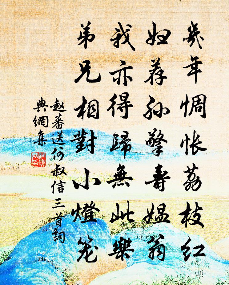詩詞名句歷史字典書法欣賞書法字典國語詞典說文解字康熙字典古漢語字典標 題 作 者 詩 句 送何叔信三首作者:趙蕃 朝代:宋代送何叔信三首原文幾年惆悵荔枝紅,婦薦孫擎壽媼翁。我亦得歸無此樂,弟兄相對小燈籠。詩詞問答問:送何叔信三首的作者是誰?答:趙蕃問:送何叔信三首寫於哪個朝代?答:宋代趙蕃送何叔信三首書法欣賞送何叔信三首書法作品詩詞推薦【南呂】一枝花_詠喜雨用盡張養浩〔元代〕詠喜雨用盡我為民為國心,祈下些值玉值金雨。數年空盼望,一旦遂沾濡。喚省焦枯,喜萬象春如故,恨流民尚在贈司空拾遺戴叔倫〔唐代〕侍臣何事辭雲陛,江上彈冠見雪花。望闕未承丹鳳詔,開門空對楚人家。陳琳草奏才還在,王粲登樓興不賒。高館句張元乾〔宋代〕玄鯽隨鉤誠養親。有感項安世〔宋代〕大江千里從西來,憑陵三峽喧如雷。自矜萬頃臨一杯,湧起雪浪吞崔嵬。一過荊門楚天闊,七澤茫茫如減沒。波神曉煙李公明〔宋代〕曉出倚溪亭,溪煙四面生。昏時山綠淺,濃處日紅輕。簇簇樹尤好,依依人未行。玄暉信蕭放,澄練有佳名。龍門八詠福公塔劉長卿〔唐代〕寂寞對伊水,經行長未還。東流自朝暮,千載空雲山。誰見白鷗鳥,無心洲渚間。雨陸游〔宋代〕映空初作繭絲微,掠地俄成箭鏃飛。紙帳光遲饒曉夢,銅爐香潤覆春衣。池魚鱍鱍隨溝出,梁燕翩翩接翅歸。惟有摸魚兒陳允平〔宋代〕倚東花風、畫闌花十二,芳陰花幕低護。玉屏翠冷梨花瘦,寂寞小樓煙雨。腸斷處。悵折柳柔情,舊別長亭路。年祠二廟之明日未得順風呈同行孔武仲〔宋代〕岳州西祠從古有,控帶洞庭湖之口。前對隱顯明滅之湘山,下接淵淪洶湧之長川。茫茫白沙連絕嶼,淡淡古木蟠蒼暮冬送璘上人歸華容齊己〔唐代〕故園雖不遠,那免愴行思。莽蒼平湖路,霏微過雪時。全無山阻隔,或有客相隨。得見交親後,春風動柳絲。曉晴虞儔〔宋代〕屋角勃姑時自喚,籬根絡緯競先鳴。刈禾政想頳肩重,揚秕那愁眯目輕。考滿我應書下下,賑荒人謂策平平。回思鷓鴣天 夏長筌子〔元代〕弄舌閒禽向鬱林。滌蒸散發趁松陰。清風習習來冰簟,陶寫真情取次吟。天似水,柳如金。火雲疊翠出遙岑。危樓郡齋水閣閒書自詠文同〔宋代〕看畫亭中默坐,吟詩岸上微行。人謂偷閒太守,自呼竊祿先生。洛意楊億〔宋代〕蘅臯駐馬獨依依,寄恨微波帶減圍。淚跡不成雙玉箸,身輕誰賦六銖衣。穿針靜夜星榆出,擺手清晨雪絮飛。目斷寄崔之仁山人姚合〔唐代〕百門坡上住,石屋兩三間。日月難教老,妻兒乞與閒。仙經揀客問,藥債煮金還。何計能相訪,終身得在山。丫頭岩史彌寧〔宋代〕山前露立幾時休,老大垂髫羞不羞。與汝雲冠別梳洗,免教人喚作丫頭。夏日六言陸游〔宋代〕退士自應客少,幽居不厭椽低。未說盤堆玉膾,且看臼搗金虀。月三首杜甫〔唐代〕斷續巫山雨,天河此夜新。若無青嶂月,愁殺白頭人。魍魎移深樹,蝦蟆動半輪。故園當北斗,直指照西秦。並照冬夕酌月三首白玉蟾〔宋代〕二毛可惜雪霜侵,日有清都絳闕心。枝冷鵲翻檐外影,庭空鴻墮月邊音。黃牛峽祠歐陽修〔宋代〕大川雖有神,淫祀亦其俗。石馬系祠門,山鴉噪叢木。潭潭村鼓隔溪聞,楚巫歌舞送迎神。畫船百丈山前路,上灘名句推薦蒂有餘香金淡泊,枝無全葉翠離披。曹雪芹《殘菊》 江南江北愁思,分付酒螺紅方岳《水調歌頭·平山堂用東坡韻》 戚施不可使仰左丘明《國語·晉語·胥臣論教誨之力》 土膏欲動雨頻催,萬草千花一餉開;范成大《春日田園雜興》 雁盡書難寄,愁多夢不成。沈如筠《閨怨二首·其一》 日暮飛鴉集,滿山蕎麥花。溫庭筠《題盧處士山居 / 處士盧岵山居》 數人世相逢,百年歡笑,能得幾回又。何夢桂《摸魚兒·記年時人人何處》 內不失真,而外不殊俗王通《中說·卷六·禮樂篇》 萬里悲秋常作客,百年多病獨登台。杜甫《登高》 無可奈何花落去,似曾相識燕歸來。晏殊《浣溪沙·一曲新詞酒一杯》