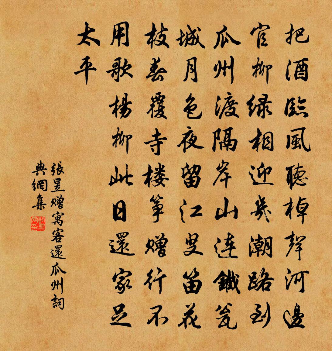 詩詞名句歷史字典書法欣賞書法字典國語詞典說文解字康熙字典古漢語字典標 題 作 者 詩 句 贈寓客還瓜州作者:張昱 朝代:元代贈寓客還瓜州原文把酒臨風聽棹聲,河邊官柳綠相迎。幾潮路到瓜州渡,隔岸山連鐵瓮城。月色夜留江叟笛,花枝春覆寺樓箏。贈行不用歌《楊柳》,此日還家足太平。詩詞問答問:贈寓客還瓜州的作者是誰?答:張昱問:贈寓客還瓜州寫於哪個朝代?答:元代問:贈寓客還瓜州是什麼體裁?答:七律張昱贈寓客還瓜州書法欣賞贈寓客還瓜州書法作品注釋元詩別裁集詩詞推薦自玉山歸竹隱投宿廣平院趙蕃〔宋代〕久客倦城市,薄言歸田廬。秣馬待日斂,顛風忽來俱。橫策徑成去,撲撲埃滿須。晴雷隱虛空,數雨如投珠。渴甚失題三道蘇軾〔宋代〕公子只應見畫,此中我獨知津。寫到水窮天杪,定非塵土間人。和何元章鄭剛中〔宋代〕持此樽中酒,試共評韓柳。高才鳴道奧,俱是希世有。宗元失所依,論者微謂醜。退這甘窮約,名字全不朽。至今游禁苑幸臨渭亭遇雪應制徐彥伯〔唐代〕玉律藏冰候,彤階飛雪時。日寒消不盡,風定舞還遲。瓊樹留宸矚,璇花入睿詞。懸知穆天子,黃竹謾言詩。瀟湘夜雨/滿庭芳周紫芝〔宋代〕曉色凝暾,霜痕猶淺,九天春意將回。隔年花信,先已到江梅。瀋水煙濃如霧,金波滿、紅袖雙垂。仙翁醉,問春少年游 次韻善住〔元代〕頂中玄發已成絲。回首不如歸。浪宕人間,蹉跎歲月,清夢繞西池。百年光景無多日,七十古來稀。物外閒身,眼高潔堂來見因次前韻三首陳著〔宋代〕君家文獻日爭光,聲價如今重上方。我老尚知師古學,為搜古集到渠陽。答方俊甫投贈二首劉克莊〔宋代〕李杜壇高未易扳,鯨波浩渺鶴天寬。潮音堂上頻升座,日過寮中暫掛單。顏子向來曾父孔,李翱未可便兄韓。內丹嘉會裡閒居韋莊〔唐代〕豈知城闕內,有地出紅塵。草占一方綠,樹藏千古春。馬嘶游寺客,犬吠探花人。寂寂無鐘鼓,槐行接紫宸。新秋盛熱楊萬里〔宋代〕度夏今年未覺難,那知秋熱政無端。晚林不動蟬聲若,蟬亦無風可得餐。遣騎迎家久稽來訊楊萬里〔宋代〕還家家尚緬,迎家家未來。去住兩不知,安否更相猜。偶思十年事,誰謂今歲乖。始我離高安,述職朝天街。中外悲憤詩蔡琰〔魏晉〕嗟薄祜兮遭世患。宗族殄兮門戶單。身執略兮入西關。歷險阻兮之羗蠻。山谷眇兮路漫漫。眷東顧兮但悲嘆。{冥潯陽歲晚寄元八郎中庾三十二員外白居易〔唐代〕閱水年將暮,燒金道未成。丹砂不肯死,白髮自鬚生。病肺慚杯滿,衰顏忌鏡明。春深舊鄉夢,歲晚故交情。一別再答並簡康國兄弟四首黃庭堅〔宋代〕須彌椎打虛空鼓,撼得毗盧海月昏。四海無波安樂住,陳家松下小柴門。古意劉克莊〔宋代〕吾夫子喜稱遺逸,太史公亦傳滑稽。堯帝杯曾遜巢許,武王粟不飽夷齊。拾來穗即萬鍾祿,採下薇堪百甕虀。不是高宗皇帝輓詞二首黃倫〔宋代〕湖鼎丹成日,中天瑞鶴迎。愁雲迷帝幄,淚雨灑都城。黼翣增摧割,龍輴忽啟行。千官陪素仗,九殞欲無聲。早秋陸游〔宋代〕秋入房櫳夜漸長,紗廚笛簟怯新涼。螢光得意穿簾隙,桐葉知時拂井床。世事本來誰得鹿?人生何處不亡羊?燈前古意二首(擬陳拾遺)孫郃〔唐代〕屈子生楚國,七雄知其材。介潔世不容,跡合藏蒿萊。道廢固命也,瓢飲亦賢哉!何事葬江水,空使後人哀。魏禮南城懷古 其二王冕〔元代〕青山連壁是居庸,古北漁陽一線通。人物盡隨風土變,川原須是古今同。淡煙著柳金溝暗,小雨飛花玉殿空。昨夜四和二首劉克莊〔宋代〕朱門畫鼓舞宮靴,應笑狂歌似采和。露坐一生無步障,春遊是處有行窩。紹興讜議誰當續,元祐全人本不多。辦取名句推薦梓匠輪輿,能與人規矩,不能使人巧。孟子《孟子·盡心章句下·第五節》 惟將終夜常開眼,報答平生未展眉。元稹《遣悲懷三首·其三》 閨中少婦不知愁,春日凝妝上翠樓。王昌齡《閨怨》 幾度東風吹世換,千年往事隨潮去。戴復古《滿江紅·赤壁懷古》 人學始知道,不學非自然。孟郊《勸學》 柔條紛冉冉,葉落何翩翩。曹植《美女篇》 洛陽城東桃李花,飛來飛去落誰家?劉希夷《代悲白頭翁 / 白頭吟 / 有所思》 北風利如劍,布絮不蔽身。白居易《村居苦寒》 殘霞夕照西湖好,花塢苹汀,十頃波平,野岸無人舟自橫。歐陽修《採桑子·殘霞夕照西湖好》 早知潮有信,嫁與弄潮兒。李益《江南曲》