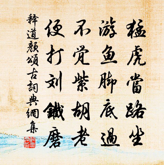詩詞名句歷史字典書法欣賞書法字典國語詞典說文解字康熙字典古漢語字典標 題 作 者 詩 句 頌古作者:釋道顏 朝代:宋代頌古原文猛虎當路坐,游魚腳底過。不覺紫胡老,便打劉鐵磨。詩詞問答問:頌古的作者是誰?答:釋道顏問:頌古寫於哪個朝代?答:宋代釋道顏頌古書法欣賞頌古書法作品詩詞推薦均陽舟中夜賦陳與義〔宋代〕遊子不能寐,船頭語輕波。開窗望兩律,煙樹何其多。晴江涵萬象,夜半光盪摩。客愁彌世路,秋氣入天河。汝洛送侍御帥夔府喻良能〔宋代〕諸葛仍祠廟,公孫只故基。棟樑酣夕照,雉堞蔓秋葵。耿耿登臨意,悠悠今古思。烹鮮不勞力,餘事杜陵詩。和岩桂趙希逢〔宋代〕嫦娥羞澀隱閨房,曾記當年竅藥囊。奔入月中知幾載,卻於秋後噴幽房。枝頭遺落兼金屑,坐上濃薰沉水香。恍惚侍郎宅泛池徐凝〔唐代〕蓮子花邊回竹岸,雞頭葉上盪蘭舟。誰知洛北朱門裡,便到江南綠水游。發吉州文天祥〔宋代〕己卯六月初一日,蒼然亭下楚囚立,山河顛倒紛雨泣。乙亥七夕此何夕,煌煌鬥牛劍光濕,戈鋋彗雲雷電擊。三百獻壽辭王涯〔唐代〕宮殿參差列九重,祥雲瑞氣捧階濃。微臣欲獻唐堯壽,遙指南山對袞龍。尚書尤公輓詞樓鑰〔宋代〕憂國言多切,回天力有餘。眾推真學士,上念老尚書。直道終難進,高懷只遂初。梁溪釣游處,此意竟何如。仙水廟林雲〔宋代〕天風吹我上瑤台,滿眼煙霞掃不開。藥灶無丹人已去,洞霄有樹鶴還來。溪聲晴帶三秋雨,山色青無半點埃。更愛出師表 / 前出師表諸葛亮〔兩漢〕先帝創業未半而中道崩殂,今天下三分,益州疲弊,此誠危急存亡之秋也。然侍衛之臣不懈於內,忠志之士忘身於送僧游西域處默〔唐代〕一盂兼一錫,只此度流沙。野性雖為客,禪心即是家。寺披雲嶠雪,路入曉天霞。自說游諸國,回應歲月賒。永壽縣太君周氏輓辭二首王安石〔宋代〕子引金閨籍,身開石窮封。露輴悲吉路,象服儼虛容。楚挽雖多相,萊衣不更縫。誰知逝川底,劍自喜相逢。題東坡畫像陳必復〔宋代〕東坡先生謫仙人,騎鯨海宇幾十春。麾呵日月斥八極,笑觸豐缺天不嗔。萬里歸來故無恙,諸公非復先朝臣。空令沈憲敏公輓詞樓鑰〔宋代〕晚出荷公知,登門未覺遲。通班依漢橐,試郡守蕭規。藻翰猶頻寄,宮牆不再窺。新阡何處是,西望不勝悲。舞李嶠〔唐代〕妙伎游金谷,佳人滿石城。霞衣席上轉,花岫雪前朝。儀鳳諧清曲,回鸞應雅聲。非君一願重,誰賞素腰輕。第六游空山王灼〔宋代〕閱遍平川至山足,投鞭下馬緣山腹。古柏屹如蒼龍起,絕磴盤作長蛇曲。氣力已憊意未歇,市聲不到境尤肅。款門再用前韻贈高司理共八首陳造〔宋代〕帝旅曾觀武事揚,如君文勢整堂堂。了知一筆無前古,坐遣諸生喪所長。丹桂高攀霄漢迥,捷書西下姓名香。貝宮逍遙陸游〔宋代〕台省諸公日造朝,放慵別駕媿逍遙。州如斗大真無事,日抵年長未易消。午坐焚香常寂寂,晨興署字亦寥寥。時平送張仲良二首韓元吉〔宋代〕客里親朋別,詩成僧黯然。春風動花柳,歸路繞雲煙。共絕過門盜,俱無使鬼錢。生涯知底許,訊息幸頻傳。和三二兄西莊書懷潘良貴〔宋代〕賢愚狂聖等為人,要是天君自策勛。舉世紛紛誰得妙,韓公惟許孟軻醇。雜曲歌辭自君之出矣辛弘智〔唐代〕自君之出矣,梁塵靜不飛。思君如滿月,夜夜減容暉。名句推薦斷送一生憔悴,只銷幾個黃昏。趙令畤《清平樂·春風依舊》 正見空江明月來,雲水蒼茫失江路。歐陽修《晚泊岳陽》 但看三五日,相見不如初。佚名《增廣賢文·上集》 西園何限相思樹,辛苦梅花候海棠。元好問《鷓鴣天·候館燈昏雨送涼》 言以足志,文以足言。左丘明《左傳·襄公·襄公二十五年》 聚散匆匆,此恨年年有。魏夫人《點絳唇·波上清風》 可能無意傳雙蝶,盡付芳心與蜜房。宋祁《落花》 故人何不返,春華復應晚。柳惲《江南曲》 綠桑高下映平川,賽罷田神笑語喧。歐陽修《田家》 少壯不努力,老大徒傷悲!佚名《長歌行》
