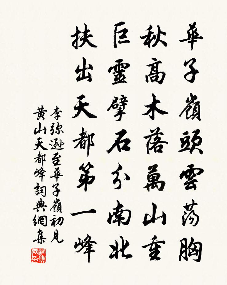 詩詞名句歷史字典書法欣賞書法字典國語詞典說文解字康熙字典古漢語字典標 題 作 者 詩 句 至華子嶺初見黃山天都峰作者:李彌遜 朝代:宋代至華子嶺初見黃山天都峰原文華子嶺頭雲盪胸,秋高木落萬山重,巨靈擘石分南北,扶出天都第一峰。詩詞問答問:至華子嶺初見黃山天都峰的作者是誰?答:李彌遜問:至華子嶺初見黃山天都峰寫於哪個朝代?答:宋代李彌遜至華子嶺初見黃山天都峰書法欣賞至華子嶺初見黃山天都峰書法作品詩詞推薦和傅寺丞竹穩之什暖紅陳宓〔宋代〕勁節歲寒碧,芳枝春暖紅。清和夷惠德,千載尚聞風。和菊潭玉泉韻施樞〔宋代〕不是靈源透碧虛,可容六六化龍魚。講經人去前湖暝,翻手為霖自有餘。南歌子(暮春)蘇軾〔宋代〕紫陌尋春去,紅塵拂面來。無人不道看花回。惟見石榴新蕊、一枝開。冰簟堆雲髻,金尊灩玉醅。綠陰青子莫相催送李登少府賈島〔唐代〕伊陽耽酒尉,朗詠醉醒新。應見嵩山里,明年躑躅春。一千尋樹直,三十六峰鄰。流水潺潺處,堅貞玉澗珉。公肅在東南三有書來未報聞其除司直以詩寄賀史堯弼〔宋代〕江北江南罷戰塵,兩階乾舞作昇平。河東五色真毛羽,九奏簫韶看一鳴。紫薇岩於石〔宋代〕靈岩舊是先生宅,拈筆新題郡守名。月落空山人語寂,澗泉猶作讀書聲。春日游張提舉園池徐璣〔宋代〕西野芳菲路,春風正可尋。山城依曲渚,古渡入修林。長日多飛絮,遊人愛綠陰。晚來歌吹起,惟覺畫堂深。減字木蘭花譚處端〔元代〕塵心起處。隔了逍遙雲水路。不起塵心。色相還空猿馬擒。而今勘破。保守天真閒里過。欲識天真。白玉黃金鑄就題花光梅十首平地回春王柏〔宋代〕見說前村破雪開,我來雪影浸蒼苔。平生不識春風面,卻道春從花底來。九月二日陳造〔宋代〕燈火一樽酒,笑語亦固然。如何棘圍夜,憶歸不成眠。衰懷動多感,妻兒須眼前。人生四方誌,誰遣霜覆顛。丹陽苦寒再賦方回〔宋代〕凍雪猶凝滯,陰風欲怒號。樹梢棲鳥墮,船底積冰膠。孰匪焦先室,誰能范叔袍。竟無沾醉策,足與苦寒鏖。太上皇后合端午帖子詞汪應辰〔宋代〕仁心均動植,風化正邦家。福慶方駢集,靈符尚辟邪。皇帝合春帖子六首蘇頌〔宋代〕五時讀令王春禮,大駕臨朝晉室儀。東作西成皆有序,欲民敦本使前知。楊柳枝劉禹錫〔唐代〕楊子江頭煙景迷,隋家宮樹拂金堤。嵯峨猶有當時色,半蘸波中水鳥栖。游溧陽北湖亭望瓦屋山懷古贈同旅李白〔唐代〕朝登瓦北湖亭,瓦遙望瓦屋山瓦。天清白瓦露下,始覺秋風還。遊子托主人,仰觀眉睫間。目色送飛鴻,邈然不可詠練川王子昭〔宋代〕吳淞江上流來水,鴨綠粼粼漾清泚。東風無力藹清光,一片縠紋吹不起。夜來雨漲三尺深,鵁鶄鸂鶒爭浮沉。芹芽慈恩寺南池秋荷詠韋應物〔唐代〕對殿含涼氣,裁規覆清沼。衰紅受露多,餘馥依人少。蕭蕭遠塵跡,颯颯凌秋曉。節謝客來稀,回塘方獨繞。和王安之少卿雨後邵雍〔宋代〕焦勞九夏余,一雨物皆蘇。蛙鼓不足聽,蚊雷未易驅。非唯仰歲給,抑亦了官輸。林下閒遊客,何妨儘自愉。岳上作修睦〔唐代〕始好步青苔,蟬聲且莫催。辛勤來到此,容易便言回。遠水月未上,四方雲正開。更堪逢道侶,特地話天台。楊德逢送米與法雲二老作此詩王安石〔宋代〕盧仝不出憎流俗,我卜郊居避俗憎。仝有鄰僧來乞米,我今送米乞鄰僧。名句推薦三百年間同曉夢,鐘山何處有龍盤。李商隱《詠史二首·其一》 餘霞散成綺,澄江靜如練。謝朓《晚登三山還望京邑》 醉臥沙場君莫笑,古來征戰幾人回?王翰《涼州詞二首·其一》 夢斷刀頭,書開蠆尾,別有相思隨定。史達祖《齊天樂·中秋宿真定驛》 淮南皓月冷千山,冥冥歸去無人管。姜夔《踏莎行·自沔東來》 漸紅濕杏泥,愁燕無語。吳文英《掃花游·西湖寒食》 惆悵孤帆連夜發,送行淡月微雲。蘇軾《臨江仙·送錢穆父》 九衢雪小,千門月淡,元宵燈近。晁端禮《水龍吟·詠月》 金絡青驄白玉鞍,長鞭紫陌野遊盤。萬楚《驄馬》 東風灑雨露,會入天地春。李白《送郄昂謫巴中》