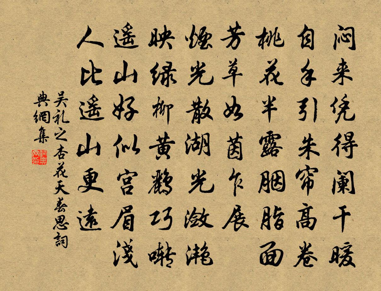 詩詞名句歷史字典書法欣賞書法字典國語詞典說文解字康熙字典古漢語字典標 題 作 者 詩 句 杏花天(春思)作者:吳禮之 朝代:宋代杏花天(春思)原文悶來憑得闌乾暖。自手引、朱簾高卷。桃花半露胭脂面。芳草如茵乍展。煙光散、湖光瀲灩。映綠柳、黃鸝巧囀。遙山好似宮眉淺。人比遙山更遠。詩詞問答問:杏花天(春思)的作者是誰?答:吳禮之問:杏花天(春思)寫於哪個朝代?答:宋代問:杏花天(春思)是什麼體裁?答:詞吳禮之杏花天(春思)書法欣賞杏花天(春思)書法作品詩詞推薦玉華寺張道宗〔宋代〕殿閣依山古,尋春閒客行。誰知唐帝館,今在梵王城。禾黍傷時變,松篁入夜清。惟余碧岩溜,依舊昔年聲。新秋晚歸陸游〔宋代〕玉粒嘗新稻,金風作好秋。鴈回沙漠信,蟬噪夕陽愁。立久雲生岫,歸遲月滿樓。吟余露華冷,砧杵起江頭。自題像周信庵〔宋代〕信庵年生七十二,經過庚子乙亥春。自權自力承家業,榮辱無驚樂太真。吾歸去,別鄉親,平生樸直坦夷人。今朝題順寧窗王遂〔宋代〕雲從西去又還東,不逐天回卻逐風。春日豈無晴晝永,掃除陰翳出長空。金陵夏竦〔宋代〕虎踞龍盤委薜蘿,台城春雨長寒莎。梁家不覺市朝改,蕭寺祇聞鐘磬多。雲樹暮堤攢劍戟,風篁虛谷轉笙歌。須知滿庭芳佚名〔宋代〕標格清高,性姿雅淡,群芳獨步惟梅。當年秀氣,付作此奇材。不逐東風桃李俗,冰霜里、彈壓春回。還應是,崧吳執中有兩鵝為余烹之戲贈黃庭堅〔宋代〕學書池上一雙鵝,宛頸相追筆意多。皆為涪翁赴湯鼎,主人言汝不能歌。異鵲蘇軾〔宋代〕昔我先君子,仁孝行於家。家有五畝園,么鳳集桐花。是時烏與鵲,巢*可俯拏。憶我與諸兒,飼食觀群呀。里人送郭正字歸郢上耿湋〔唐代〕濟江篇已出,書府俸猶貧。積雪商山道,全家楚塞人。大堤逢落日,廣漢望通津。卻別漁潭下,驚鷗那可親。舟中別武金壇儲光羲〔唐代〕曰予輕皎潔,坦率賓混元。忽乃異群萃,高歌信陵門。信陵好賓客,清夜開華軒。月光麗池閣,野氣浮林園。偶坐小園宋庠〔宋代〕節物過芳苞,幽奇勝近郊。先秋蟬棄甲,背歲鵲營巢。池小萍周岸,筠低露泣梢。摽梅資宴豆,賜臛佐晨庖。夕塢醉蓬萊(壽史帥)黃機〔宋代〕政槐雲濃翠,榴火殷紅,暑風涼細。紫府神仙,向人間遊戲。瑞節珠幢,瓊纓寶佩,炯冰壺標緻。經濟規模,登庸秋懷十首趙蕃〔宋代〕寒溫問虛名,杜老厭束書。半百無一行,又似計數疏。儻非奉子公,不妨問何如。因聲遇齋叟,簿領想多餘。郴江百詠並序坦山岩阮閱〔宋代〕空山夜雨鬼神愁,怪石層崖虎豹憂。鳥道不通車馬到,只供衲子羽人游。和徐季功舒蘄道中二十首王之道〔宋代〕欲識吾君聖與仁,澤流寰海眾熙春。兩淮饑饉方移粟,六轡馳驅不憚勤。九日戴復古〔宋代〕今日知何日,他鄉憶故鄉。黃花一杯酒,白髮幾重陽。日晚鴉爭宿,天寒雁叫霜。客中無此醉,何以敵淒涼。洞仙歌段宏章〔宋代〕一庭晴雪,了東風孤注。睡起濃香占窗戶。對翠蛟盤雨,白鳳迎風,知誰見、愁與飛紅流處。想飛瓊弄玉,共駕蒼過武陵溪二首張詠〔宋代〕生平苦愛山兼水,南國晴凝侭可攜。即問世間誰見我,扁舟初下武陵溪。牡丹開已數日方盛麗未艾也成二絕錢時〔宋代〕晚春庭院牡丹香,誰道花開恨不長。寒食到今幾十日,依然夭艷壓群芳。游山陽十首陳造〔宋代〕熙台楚觀小開樽,老去登臨易斷魂。蹀血龍荒平昔志,即今搔首望中原。名句推薦孤雁不飲啄,飛鳴聲念群。杜甫《孤雁 / 後飛雁》 我報路長嗟日暮,學詩謾有驚人句。李清照《漁家傲·天接雲濤連曉霧》 砧面瑩,杵聲齊。搗就征衣淚墨題。賀鑄《杵聲齊·砧面瑩》 台在山腰,一峰突起,離水十餘丈。沈復《浮生六記·浪遊記快》 佳人彩雲里,欲贈隔遠天。李白《折荷有贈》 靡不有初,鮮克有終。佚名《盪》 憶共錦衾無半縫,郎似桐花,妾似桐花鳳。王士禎《蝶戀花·和漱玉詞》 大天而思之,孰與物畜而制之!從天而頌之,孰與制天命而用之荀子《荀子·天論》 已是懸崖百丈冰,猶有花枝俏。 * 《卜運算元·詠梅》 最傷情、送客鹹陽,佩結西風怨。吳文英《瑣窗寒·玉蘭》
