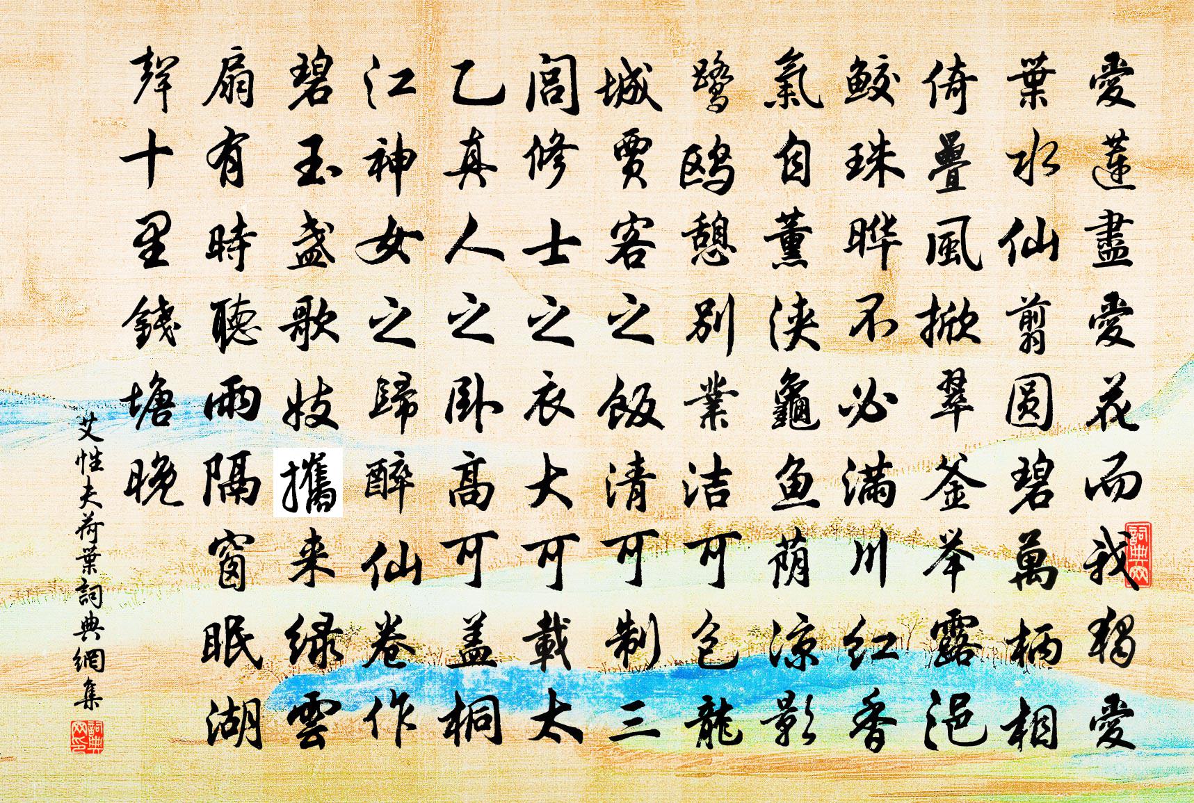 詩詞名句歷史字典書法欣賞書法字典國語詞典說文解字康熙字典古漢語字典標 題 作 者 詩 句 荷葉作者:艾性夫 朝代:宋代荷葉原文愛蓮盡愛花,而我獨愛葉。水仙翦圓碧,萬柄相倚疊。風掀翠釜舉,露浥鮫珠曄。不必滿川紅,香氣自薰浹。龜魚蔭涼影,鷺鷗憩別業。潔可包龍城賈客之飯,清可制三閭修士之衣。大可載太乙真人之臥,高可蓋桐江神女之歸。醉仙卷作碧玉盞,歌妓攜來綠雲扇。有時聽雨隔窗眠,湖聲十里錢塘晚。詩詞問答問:荷葉的作者是誰?答:艾性夫問:荷葉寫於哪個朝代?答:宋代問:荷葉是什麼體裁?答:雜言艾性夫荷葉書法欣賞荷葉書法作品詩詞推薦苦雨嘆陸游〔宋代〕九淵龍公出忘還,瓦溝垂溜聲淙潺;茫茫大澤北際海,瀲瀲平湖南浸山。吾廬四望路俱斷,蛙黽爭雄亂昏旦。漏床無題馮伯規〔宋代〕暇時結客小舂容,路直重岩紫翠峰。雲閣翬飛翼鸞鳳,石楠盤屈老虬龍。林扉雨過便秋菊,山寺風清度晚鐘。快展放舟戲書釋紹嵩〔宋代〕再岸蕭蕭蘆荻秋,斜風細雨轉船頭。年來頻作江湖夢,須向山陰上小舟。縱筆六言二首劉克莊〔宋代〕蒯酈提趨沸湯,信越狗烹弓藏。向來猛士盡矣,與誰共守四方。題四清枕屏葛紹體〔宋代〕橫梅枝上蘭為伴,瘦石拳邊竹更長。月上小窗人慾靜,睡來清入夢魂香。十月九日同公美踐上林之紀回紀實陳文蔚〔宋代〕景入小春方嫩寒,緩行不覺鳥間關。倚空疊嶂何崷崒,帶石清溪屢繞環。政擬徘徊檀木嶺,且先點檢上林山。杖藜懷可齋簡林鄭二從事鄭清之〔宋代〕可齋嚴冷如古書,莊語敢下鉛與朱。讀之不厭味有餘,簫韶聞奏愁爰居。文墨政事同機樞,照人炯炯懸冰壺。昆弟航海朱繼芳〔宋代〕地角與開倪,茫茫何處期。星回析木次,日掛扶桑枝。沉石尋孤嶼,浮針辨四維。飄然一桴意,持此欲安之。太寒早行石介〔宋代〕萬動皆休跡,五更獨鳴鞭。星霜結淒色,風霰過長川。草暖犬猶睡,河冰馬不前。城牆多有穴,村屋半無煙。餓虎偈三首釋本逸〔宋代〕菜園牆倒晴方築,房店籬穿雨過修。院宇漏時隨分整,兒孫大小盡風流。投老陸游〔宋代〕投老百無成,山林送此生。薄才元易盡,古道竟難行。陋巷牛羊跡,衡門鳥雀聲。新年幸差健,作意事春耕。挽程淳老史堯弼〔宋代〕戒定通前念,蘇黃早見期。源流知袞袞,金印漫累累。白首風塵外,丹砂歲月遲。泉台無復恨,喬木有餘悲。病起五首劉克莊〔宋代〕躬圭寶箑俱藏起,出入惟消笠與簑。農說雨暘差有準,客談間諜易傳訛。豐年海熟田尤熟,新地朝和野亦和。縱使再和元禮春懷十首黃庭堅〔宋代〕紅紫欲疏啼百勞,洞宮春色醉蟠桃。虛窗酒病扶頭起,強取金釵癢處搔。渡江張耒〔宋代〕白髮人驚老阿童,橫江聊借半帆風。卻嗟縛得窮孫皓,未似高歌醉閉篷。舟中雜紀 其八王冕〔元代〕落日照船窗,殘霞映碧江。樹低蒼翠濕,人雜語言哤。貰酒青衣獨,歸山白鳥雙。驅馳吾未已,慚愧鹿門龐。拜星月慢陳允平〔宋代〕漏閣閒簽,琴窗倦譜,露濕宵螢欲暗。雁咽涼聲,寂寞芙蓉院。畫檐外,樹色驚霜漸改,澹碧雲疏星爛。舊約桐陰汎錦池霞川呈張以道二首張鎡〔宋代〕戲選嬋娟結伴來,畫橋低處側鸞釵。媧簧靜試醒忪響,魯酒聊傾曠盪懷。萬事亦須從使便,百年無過任天排。憐君答隆慶李守洪咨夔〔宋代〕萬里一天碧,百懷雙鬢秋。淒其占後會,展也企前修。風露昂藏鶴,煙波浩蕩鷗。書來如覿面,香滿藕花洲。次韻韓川奉祠西太乙宮四首黃庭堅〔宋代〕萬靈未對甘泉,五福問祀迎年。旍旂三斿半偃,風馬雲車闖然。名句推薦東山老,可堪歲晚,獨聽桓箏。葉夢得《八聲甘州·壽陽樓八公山作》 機中錦字論長恨,樓上花枝笑獨眠。皇甫冉《春思》 七夕今宵看碧霄,牽牛織女渡河橋。林傑《乞巧》 辛苦遭逢起一經,干戈寥落四周星。文天祥《過零丁洋》 舉杯互敬屠蘇酒,散席分嘗勝利茶。 * 《元旦口占用柳亞子懷人韻》 十年種木,一年種穀,都付兒童。元好問《人月圓·重岡已隔紅塵斷》 夫師,以身為正儀而貴自安者也。荀子《荀子·修身》 弟妹蕭條各何在,干戈衰謝兩相催!杜甫《九日五首·其一》 慊慊思歸戀故鄉,君為淹留寄他方。曹丕《燕歌行》 見兔而顧犬,未為晚也;亡羊而補牢,未為遲也。劉向《戰國策·楚四·莊辛謂楚襄王》