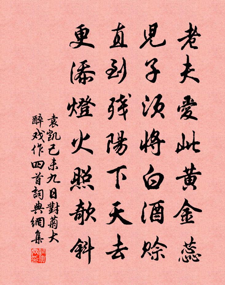 詩詞名句歷史字典書法欣賞書法字典國語詞典說文解字康熙字典古漢語字典標 題 作 者 詩 句 己未九日,對菊大醉,戲作四首作者:袁凱 朝代:明代原文老夫愛此黃金蕊,兒子須將白酒賒。直到殘陽下天去,更添燈火照欹斜。詩詞問答問:《己未九日,對菊大醉,戲作四首》的作者是誰?答:袁凱問:該詩寫於哪個朝代?答:明代問:該詩是什麼體裁?答:七絕書法欣賞己未九日,對菊大醉,戲作四首書法作品詩詞推薦【仙呂】點絳唇_道妙玄微,佚名〔元代〕道妙玄微,先須要悟明心地,非容易。見放著古聖文書,內隱著真訊息。 【混江龍】若說著胎元根蒂,只除是獨鵠吟李鹹用〔唐代〕碧玉喙長丹頂圓,亭亭危立風松間。啄萍吞鱗意已闌,舉頭咫尺輕重天。黑翎白本排雲煙,離群脫侶孤如仙。披霜【雙調】殿前歡 自樂景元啟〔元代〕自由仙,對西風籬下醉金船。葛巾漉酒從吾願,富貴由天。與淵明和一篇,君休羨,省部選烏台薦。好覷桐江釣叟句龐季子〔唐代〕冥雲生易滿,秋草長難高。寄元孚道人陳陶〔唐代〕梵宇章句客,佩蘭三十年。長乘碧雲馬,時策翰林鞭。曩事五嶽游,金衣曳祥煙。高攀桐君手,左倚鸑鷟肩。哭玉為黃仲宣賦山中四章章四句方回〔宋代〕山中之暮,豈不風雨。心與一燈,耿耿千古。喜陸侍御破石埭草寇東峰亭賦詩王緯〔唐代〕蜂蠆聚吳州,推賢奉聖憂。忠誠資上策,仁勇佐前籌。草木成鵝鸛,戈鋋復鬥牛。戎車一戰後,殘壘五兵收。野靜挽孫少卿四首陳淳〔宋代〕聖主更新大化年,趨朝正預拔茅連。青華上廁郎星列,近密光陪卿月聯。垂躡從班提從橐,遽萌歸興乞歸田。至今玉樓春歐陽修〔宋代〕池塘水綠春微暖。記得玉真初見面。從頭歌韻響錚鏦,入破舞腰紅亂旋。玉鉤簾下香階畔。醉後不知紅日晚。當時學無學頌一十五首釋印肅〔宋代〕奪下生機不作聲,耳聾眼瞎妙明生。隨流口欲傳心印,豈是緣情粥飯僧。後江行十絕岳珂〔宋代〕日日征帆上水風,掀天雪浪駭魚龍。不須檢校江行歷,知過雲山幾萬重。送李秀才游嵩山顧況〔唐代〕嵩山石壁掛飛流,無限神仙在上頭。採得新詩題石壁,老人惆悵不同游。奉和詠舞詩徐陵〔南北朝〕十五屬平陽。因來入建章。主家能教舞。城中巧畫妝。低鬟向綺席。舉袖拂花黃。燭送空回影。衫傳篋里香。當由麟中寓居寄蒲中友人薛能〔唐代〕蕭條秋雨地,獨院阻同群。一夜驚為客,多年不見君。邊心生落日,鄉思羨歸雲。更在相思處,子規燈下聞。二月二日白居易〔唐代〕二月二日新雨晴,草芽菜甲一時生。輕衫細馬春年少,十字津頭一字行。中秋前夕三首方回〔宋代〕山頭月到天心小,林下秋生夜半寒。不待明朝已三五,四更仍續五更看。過馬嵬山(一作李益詩)李遠〔唐代〕金甲雲旗盡日回,倉皇羅袖滿塵埃。濃香猶自飄鑾輅,恨魄無因離馬嵬。南內宮人悲帳殿,東溟方士問蓬萊。唯余春過賀遂員外藥園王維〔唐代〕前年槿籬故,新作藥欄成。香草為君子,名花是長卿。水穿盤石透,藤系古松生。畫畏開廚走,來蒙倒屣迎。蔗漿羽山蕭穎士〔唐代〕九山方盪潏,三考佇良材。夏祖何屯圮,遷殛此山隈。空餘下泉客,誰復辨黃能。赴南中留別褚七少府湖上林亭(一作劉長卿詩)李嘉祐〔唐代〕種田東郭傍春陂,萬事無情把釣絲。綠竹放侵行徑里,青山常對捲簾時。紛紛花發門空閉,寂寂鶯啼日更遲。從此名句推薦不戚戚於貧賤,不汲汲於富貴。陶淵明《五柳先生傳》 君子多知而擇焉,博學而算焉,多言而慎焉。戴聖《大戴禮記·曾子立事第四十九》 細看茱萸一笑,詩翁健似常年。張可久《風入松·九日》 鄉思不堪悲橘柚,旅遊誰肯重王孫。譚用之《秋宿湘江遇雨》 勿自暴,勿自棄。聖與賢,可馴致。李毓秀《弟子規·餘力學文》 馬嘶人散後,秋風換、故園夢裡。吳文英《丁香結·夷則商秋日海棠》 軍歌應唱大刀環,誓滅胡奴出玉關。徐錫麟《出塞》 隔水氈鄉,落日牛羊下,區脫縱橫。張孝祥《六州歌頭·長淮望斷》 雪岸叢梅發,春泥百草生。杜甫《陪裴使君登岳陽樓》 語言多矯飾,則人品心術,盡屬可疑。王永彬《圍爐夜話·第四十則》