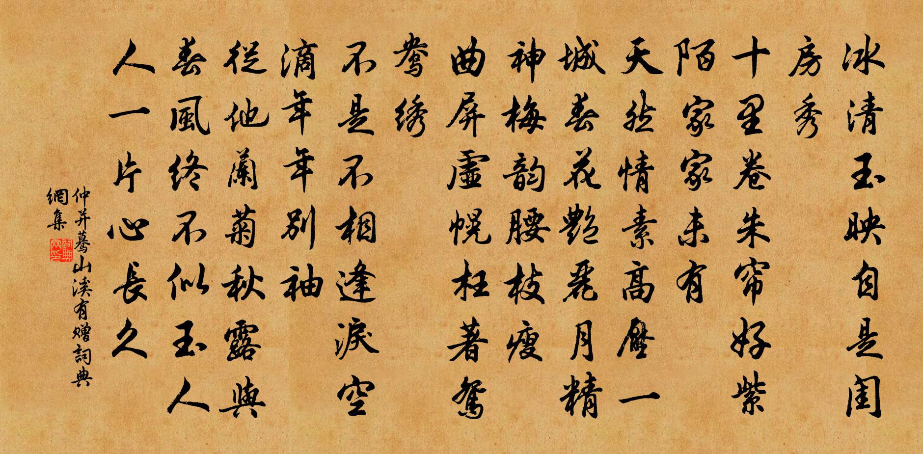 詩詞名句歷史字典書法欣賞書法字典國語詞典說文解字康熙字典古漢語字典標 題 作 者 詩 句 驀山溪(有贈)作者:仲並 朝代:宋代驀山溪(有贈)原文冰清玉映,自是閨房秀。十里卷朱簾,好紫陌、家家未有。天然情素,高壓一城春,花艷麗,月精神,梅韻腰枝瘦。曲屏虛幌,枉著鴛鴦繡。不是不相逢,淚空滴、年年別袖。從他蘭菊,秋露與春風,終不似,玉人人,一片心長久。詩詞問答問:驀山溪(有贈)的作者是誰?答:仲並問:驀山溪(有贈)寫於哪個朝代?答:宋代問:驀山溪(有贈)是什麼體裁?答:詞仲並驀山溪(有贈)書法欣賞驀山溪(有贈)書法作品詩詞推薦夏日二首張耒〔宋代〕詩書老去信無功,偷得閒宮許養慵。山影當庭初轉日,水聲穿竹自來風。晚催萱蕊昏還斂,日射榴房午更紅。覽物偈頌一百四十一首釋師範〔宋代〕擬即差,動即隔。忘伎倆,絕聲色。兩手揶揄懡?休,東村有個王大伯。望野詩庾信〔南北朝〕試策千金馬。來登五丈原。有城仍舊縣。無樹即新村。水向蘭池泊。日斜細柳園。涸渚通沙路。寒渠塞水門。但得望海潮鄱陽護戎〔宋代〕雲收飛腳,日祛怒暑,新蟬高柳鳴時。蘭佩紫囊,蒲抽碧劍,吳絲兩腕雙垂。聞道五陵兒。蛟龍吼波面,沖碎琉璃秋日西湖閒泛葛天民〔宋代〕雨洗千峰曉,波涵萬頃秋。菱花開古鏡,蓮葉度輕舟。思遠人誰識,身閒世不收。望中時得句,倚櫂雜吳謳。臨江仙(趙端禮重陽後一日置酒,坐上賦)張元乾〔宋代〕十日籬邊猶袖手,天教冷地藏香。王孫風味最難忘。逃禪留坐客,度曲出宮妝。判卻為花今夜醉,大家且泛鵝黃。空山釋文珦〔宋代〕深山一敝廬,今是幾年居。舉世皆嫌拙,吾心獨有餘。寒苴珍芥醬,嘉核愛梅諸。樵父時同賦,多將槁葉書。曉發富陽縣方回〔宋代〕長山礲石片帆斜,小雨初晴日眩沙。回首遙看富陽縣,青煙低罩一叢花。和毛秀才江墅幽居好十首穆修〔宋代〕江墅幽居好,賓來定不愁。酒醲新出榨,魚活旋離鉤。移席追松影,調琴和澗流。陶然方外樂,名教縶何由。是日宿水陸寺寄北山清順僧二首蘇軾〔宋代〕草沒河堤雨暗村,寺藏修竹不知門。拾薪煮藥憐僧病,掃地焚香淨客魂。農事未休侵小雪,佛燈初上報黃昏。年來燕戴復古〔宋代〕聞說烏衣國,低連海上樹。春來避霜雪,秋去長兒孫。華屋語如訴,故巢多不存。雙飛惱幽獨,紅袖有啼痕。懷梅水村十絕用張小山韻趙必象〔宋代〕暮秋已誤張郎約,冬暮歸期又未成。趁取歲前到家好,春來怕有杜鵑聲。到任後作夏竦〔宋代〕功兼文武帝師臣,久厭崇高樂退身。任是東山無限好,謝公爭忍負生民。送趙郎二首張嵲〔宋代〕亂離何處托浮生,羨子今為劍外行。異縣頻年多送遠,中原何日見承平。雲開壠首河山迥,月出巴江閣道橫。此別享文恭太子廟樂章許孟容〔唐代〕觴牢具品,管弦有節。祝道寅恭,神儀昭晰。桐珪早貴,象輅追設。磬達樂成,降歆豐潔。穀雨朱槔〔宋代〕天點紛林際,虛檐寫夢中。明朝知穀雨,無策禁花風。石渚收機巧,煙蓑建事功。越禽牢閉口,吾道寄天公。中夜投宿修覺寺陸游〔宋代〕陸走崔嵬水下瀧,客中更復客它邦。晚離方井雲藏市,夜渡新津火照江。人語紛紛投野寺,床敷草草寄僧窗。五更沖雪送陸子靜楊萬里〔宋代〕猛落還中歇,疏飛忽驟繁。平欺蘆屋脊,偏護竹籬根。對面看童子,低頭印手痕。銷魂送行客,行客更銷魂。和虞滄江梅花四絕句程公許〔宋代〕園林春到杳無蹤,恰似靈犀一點通。勝著新題問花信,從頭二十四番風。晚鷗梅堯臣〔宋代〕晴川帶微陽,鷗鳥雙飛去。雙飛如有歸,並宿向何處。汀寒霧冪歷,永落沙沮洳。不避近行舟,應知心寡慮。名句推薦積雪覆平皋,飢鷹捉寒兔。孟浩然《南歸阻雪》 枕前何事最傷情?梧桐葉上,點點露珠零。尹鶚《臨江仙·深秋寒夜銀河靜》 有美一人,清揚婉兮。佚名《野有蔓草》 能親仁,無限好,德日進,過日少。李毓秀《弟子規·親仁》 穿天透地不辭勞,到底方知出處高。馮雲山《詠瀑布》 堂上遠於百里,堂下遠於千里,門庭遠於萬里。管仲《管子·法法》 春潮帶雨晚來急,野渡無人舟自橫。韋應物《滁州西澗》 人事有代謝,往來成古今。孟浩然《與諸子登峴山》 行人悵望王孫去,買斷金釵十二愁。俞紫芝《詠草》 其山水揀乳泉、石池漫流者上;其瀑涌湍漱,勿食之。陸羽《茶經·五之煮》