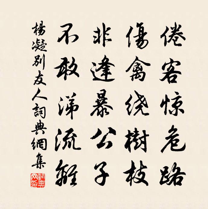 詩詞名句歷史字典書法欣賞書法字典國語詞典說文解字康熙字典古漢語字典標 題 作 者 詩 句 別友人作者:楊凝 朝代:唐代別友人原文倦客驚危路,傷禽繞樹枝。非逢暴公子,不敢涕流離。詩詞問答問:別友人的作者是誰?答:楊凝問:別友人寫於哪個朝代?答:唐代問:別友人是什麼體裁?答:五絕楊凝別友人書法欣賞別友人書法作品注釋全唐詩:卷290_11詩詞推薦淚二首錢惟演〔宋代〕家在河陽路入秦,樓頭相望祇酸辛。江南滿目新亭宴,旗鼓傷心故國春。仙掌倚天頻滴露,方諸待月自涵津。荊王再和靜樂鄭清之〔宋代〕夫君論事回天力,期文如貢厥篚織。天葩瑞時來帝傍。天香染衣未渠息。因攜天上白琅玕,散作天花天女識。冰清良月二十一日郡庠置酒爐亭勞余出山且取子美陳著〔宋代〕江湖寬相容,風馬留更勤。襄陽或可傳,北山若為文。偈頌一百二十三首釋崇岳〔宋代〕當陽顯赫,神龍妙訣。倒岳傾湫,雷轟電掣。十二月十日方岳〔宋代〕酒醒開門雪滿山,徑穿疏竹上危欄。溪山與我俱我畫,草樹惟梅大耐寒。留伴夜深銀鑿落,莫緣春近玉闌珊。老枝九月十日皎然〔唐代〕愛殺柴桑隱,名溪近訟庭。掃沙開野步,搖舸出閒汀。宿簡邀詩伴,余花在酒瓶。悠然南望意,自有峴山情。次韻齡叟見寄陳著〔宋代〕方外好交情,詩筒出醉屏。清能濯驕暑,光欲掩常星。自愧薄榆景,有生真草亭。多年只多感,岌岌舊門庭。又和陳天予吳芾〔宋代〕邊敵臨江強指麾,狂圖欲效白登圍。一朝殄滅妖氛淨,萬里歡傳盛事稀。故國山河看克復,中原父老徯來歸。六飛紫花硯鄭獬〔宋代〕耕得紫玻璃,鑿成天馬蹄。潤應通月窟,洗合就雲溪。內殿賦新詩江總〔隋代〕兔影脈脈照金鋪。虬水滴滴瀉玉壼。綺翼雕甍邇清漢。虹梁紫柱麗黃圖。風高暗綠凋殘柳。雨駛芳紅濕晚芙。三五玉樓春韋莊〔唐代〕日照玉樓花似錦,樓上醉和春色寢。綠楊風送小鶯聲,殘夢不成離玉枕。堪愛晚來韶景甚,寶柱秦箏方再品。青娥詩二首陳舜俞〔宋代〕石磴梯山一里高,荒煙源處稅漁樵。官粗事冷人應笑,免對青苗強折腰。自歸耕篆畦見村婦有摘茶車水賣魚汲水行饁寄舒岳祥〔宋代〕溪頭波及水婦,力小憩中途。奉佛澄齋缽,供姑潔飯盂。煮蔬甘勝肉,洗布白於酥。釀黍修時祀,家篘不用沽。宜春台朱繼芳〔宋代〕定王米換長安土,北望長安日幾廻。更有築台歸未得,憑高卻望定王台。寄月山少監黃庚〔宋代〕一片襟懷海樣寬,眉頭肯為別離攢。臂鷹慣識從君樂,汗馬寧辭行路難。角帶邊聲關月冷,雁傳鄉信塞雲寒。歸來得長春兩株植之窗前陳與義〔宋代〕鄉邑已無路,僧廬今是家。聊乘數點雨,自種兩叢花。籬落失秋序,風煙添歲華。衰翁病不飲,獨立到棲鴉。偈六十九首釋道寧〔宋代〕衲子玄關,群生命脈。鋒芒未兆,便好承當。文彩才彰,翻成影事。空劫已前,乾坤未剖。凝然一片,非聖非凡。頌古一百則釋正覺〔宋代〕孤迥迥,圓陀陀,眼力盡處高峩峩。月落潭空夜色重,雲收山瘦秋容多。八封位正,五行氣和,身先在里見來麽。聞蛩徐集孫〔宋代〕獨搔短髮坐更深,夜雨書燈半欲陰。近日病魔詩思澀,一秋清句付蛩吟。送朴山人歸新羅馬戴〔唐代〕浩渺行無極,揚帆但信風。雲山過海半,鄉樹入舟中。波定遙天出,沙平遠岸窮。離心寄何處,目斷曙霞東。名句推薦靡蕪盈手泣斜暉,聞道鄰家夫婿歸。魚玄機《閨怨》 歡宴良宵好月,佳人修竹清風。吳文英《風入松·麓翁園堂宴客》 淚眼倚樓頻獨語。雙燕飛來,陌上相逢否?馮延巳《鵲踏枝·幾日行云何處去》 槐葉初勻日氣涼,蔥蔥鼠耳翠成雙。范成大《夏日田園雜興》 立非常之事,必俟非常之人。令狐德棻《周書·列傳·卷十四》 極目離離,遍地濛濛,官橋野塘。陳維崧《沁園春·詠菜花》 明朝游上苑,火速報春知。武則天《臘日宣詔幸上苑 / 催花詩》 性靈熔匠,文章奧府。淵哉鑠乎,群言之祖。劉勰《文心雕龍·宗經》 眾中聞謦欬,未語知鄉里。蘇軾《送金山鄉僧歸蜀開堂》 當時明月在,曾照彩雲歸。晏幾道《臨江仙·夢後樓台高鎖》