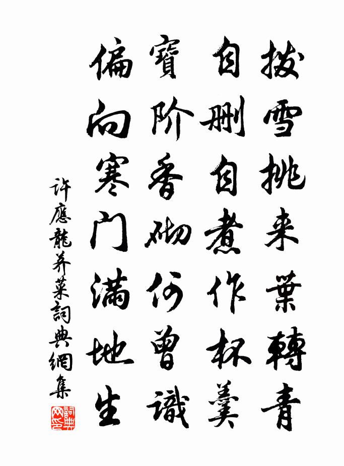 詩詞名句歷史字典書法欣賞書法字典國語詞典說文解字康熙字典古漢語字典標 題 作 者 詩 句 薺菜作者:許應龍 朝代:宋代薺菜原文撥雪挑來葉轉青,自刪自煮作杯羹。寶階香砌何曾識,偏向寒門滿地生。詩詞問答問:薺菜的作者是誰?答:許應龍問:薺菜寫於哪個朝代?答:宋代許應龍薺菜書法欣賞薺菜書法作品詩詞推薦浣溪沙·山繞平湖波撼張元乾〔宋代〕山繞平湖波撼城。湖光倒影浸山青。水晶樓下欲三更。霧柳暗時雲度月,露荷翻處水流螢。蕭蕭散發到天明。緋桃潘牥〔宋代〕一枝才破便精神,直是猩猩血染成。休逐東風貪結子,玉環上已妒傾城。句張鎡〔宋代〕斷橋斜取路,古寺未關門。寄蘇州白二十二使君張籍〔唐代〕三朝出入紫微臣,頭白金章未在身。登第早年同座主,題詩今日是州人。閶門柳色煙中遠,茂苑鶯聲雨後新。此處寄題佛智忠禪師實庵方回〔宋代〕實翁大笑笑虛翁,自辟新庵地幾弓。萬事我俱捐墮甑,百年公已辦幽宮。恢張遠算遺身後,跳脫 * 出夢中。智了和楊齊伯韻郭印〔宋代〕邪師挾幻術,念念皆狂圖。化出一切象,形容乃甚都。佛光亦幻成,非有與非無。煙霞異明晦,寥廓元太虛。離婁晨起陸游〔宋代〕清晨推枕起,盥面吾事足;豈無掃灑役,出市待歸仆。小餮亦已省,尚進藥盈掬整衣登北堂,危坐巾一幅。徐行梧綠菜贊黃庭堅〔宋代〕蔡蒙之下,彼江一曲。有茹生之,可以為蔌。蛙蠙之衣,采采盈掬。吉蠲洗澤,不溷沙礫。芼以辛鹹,宜酒宜餗。雪謗後書事上皇甫大夫盧綸〔唐代〕盛德總群英,高標仰國楨。獨安巡狩日,曾掩趙張名。業就難辭寵,朝回更授兵。曉川分牧馬,夜雪覆連營。長策夏日梁王席送張岐州沈佺期〔唐代〕秦雞常下雍,周鳳昔鳴岐。此地推雄撫,惟良寄在斯。家傳七豹貴,人擅八龍奇。高傳生光彩,長林嘆別離。天人獨酌有懷南鄭陸游〔宋代〕憶從嶓冢涉南沮,笳鼓聲酣醉膽麤。投筆書生古來有,從軍樂事世間無。秋風逐虎花叱撥,夜雪射熊金僕姑。白首程申叔來備言近況因與之飲董嗣杲〔宋代〕程子過我廬,挽首發悲嘆。前年遭兵火,故業委塗炭。鄉邦更疫癘,骨肉盡離散。不覺兩春度,夢中度昏旦。昔仰擬蘇少卿寄內張嵲〔宋代〕話別河樑上,踟躕古道邊。男兒重意氣,握節向幽燕。一來單于庭,五閏猶未還。黃雲愁瀚海,朔雪暗燕然。寒柳魯如晦郎中輓詞范成大〔宋代〕自古歸來引,於今遂隱篇。棋燈熒夜觀,歌板聒春船。陳跡空華似,佳城露草邊。寂寥雞黍約,望眼一潸然。頌古二十一首釋正覺〔宋代〕大地火發,間不容髮。南海崑崙,天寒不襪。祖祖相傳,一頭搕{左木右上喬右下韭}。思越人/朝天子賀鑄〔宋代〕怊悵離亭斷采襟。碧雲明月兩關心。幾行書尾情何限,一尺裙腰瘦不禁。遙夜半,曲房深。有時昵語話如今。侵窗華亭百詠前京城許尚〔宋代〕廬落皆無有,依稀古堞存。登臨認遺蹟,林莽暮煙昏。蝶戀花晏殊〔宋代〕一霎秋風驚畫扇。艷粉嬌紅,尚拆荷花面。草際露垂蟲響遍。珠簾不下留歸燕。掃掠亭台開小院。四坐清歡,莫放酹江月侯善淵〔元代〕玄元至道,大無隅、寂寂寥寥獨立。遍應諸方通上下,極目天光微密。隱顯存亡,穿無貫有,善用無轍跡。琅然泄春早選寓長安二首薛能〔唐代〕疏拙自沉昏,長安豈是村。春非閒客事,花在五侯門。道僻惟憂禍,詩深不敢論。揚雄若有薦,君聖合承恩。舊論名句推薦明月出天山,蒼茫雲海間。李白《關山月》 夜夜相思更漏殘,傷心明月憑闌乾,想君思我錦衾寒。韋莊《浣溪沙·夜夜相思更漏殘》 又酒趁哀弦,燈照離席。梨花榆火催寒食。周邦彥《蘭陵王·柳》 得寸則王之寸,得尺亦王之尺也。劉向《戰國策·秦三·范睢至秦》 漠漠黃雲,濕透木棉裘。蔣捷《梅花引·荊溪阻雪》 風一更,雪一更,聒碎鄉心夢不成,故園無此聲。納蘭性德《長相思·山一程》 借得山東煙水寨,來買鳳城春色施耐庵《念奴嬌·天南地北》 鴻雁幾時到,江湖秋水多。杜甫《天末懷李白》 男兒西北有神州,莫滴水西橋畔淚。劉克莊《玉樓春·戲林推》 夫見亂而不惕,所殘必多,其飾彌章。左丘明《國語·周語·太子晉諫靈王壅谷水》