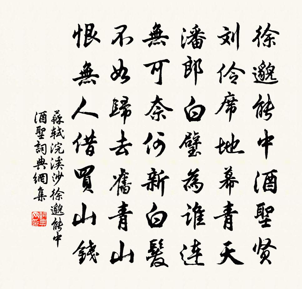 徐邈能中酒聖賢,劉伶席地幕青天,潘郎白璧為誰連。無可奈何新白髮,不如歸去舊青山,恨無人借買山錢。