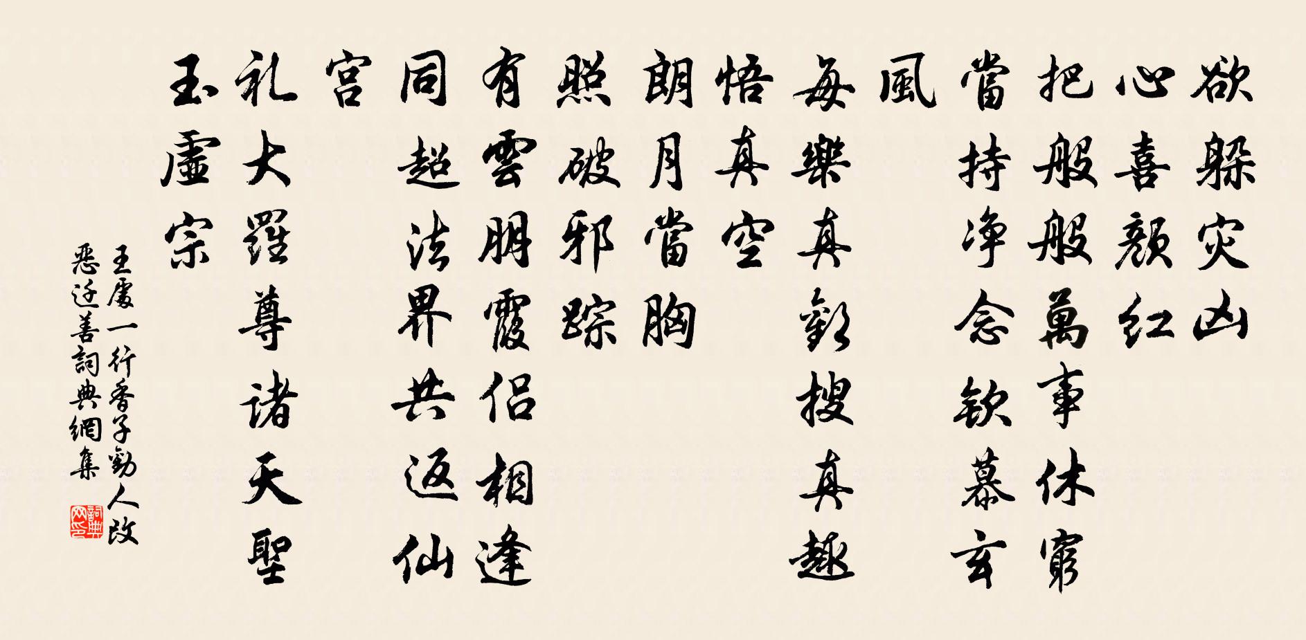 詩詞名句歷史字典書法欣賞書法字典國語詞典說文解字康熙字典古漢語字典標 題 作 者 詩 句 行香子 勸人改惡遷善作者:王處一 朝代:元代行香子 勸人改惡遷善原文欲躲災凶。心喜顏紅。把般般、萬事休窮。當持淨念,欽慕玄風。每樂真歡,搜真趣,悟真空。朗月當胸。照破邪蹤。有雲朋、霞侶相逢。同超法界,共返仙宮。禮大羅尊,諸天聖,玉虛宗。詩詞問答問:行香子 勸人改惡遷善的作者是誰?答:王處一問:行香子 勸人改惡遷善寫於哪個朝代?答:元代問:行香子 勸人改惡遷善是什麼體裁?答:詞王處一行香子 勸人改惡遷善書法欣賞行香子 勸人改惡遷善書法作品詩詞推薦驚秋齊己〔唐代〕曉窗驚覺向秋風,萬里心凝淡盪中。池影碎翻紅菡萏,井聲乾落綠梧桐。破除閒事渾歸道,銷耗勞生旋逐空。妖殺歲晚雜興王同祖〔宋代〕撥盡寒灰恨轉添,不知片雪點疏簾。梅花帳冷爐煙歇,架上黃庭信手拈。西郊二首陳師道〔宋代〕攢眉斂目抵風沙,暗度城西十里花。歷肆側聽長短句,緣溪斜著兩三家。上右丞相梁國公曾豐〔宋代〕三月桃花水發洪,游魚挾雨乘長風。去折禹門浪三重,滿意須臾蛻為龍。門道潭潭右齒齒,魚初踴躍中委靡。豈後句晏殊〔宋代〕東陽詩骨瘦,南浦別魂銷。佛牙贊宋太宗〔宋代〕功成積劫印文端,不是南山得恐難。眼睹數重金色潤,手擊一片玉光寒。煉時百火精神透,藏處千年瑩采完。定果浣溪沙仇遠〔宋代〕紅紫妝林綠滿池,遊絲飛絮兩依依。正當穀雨弄晴時。射鴨矮闌蒼蘚滑,畫眉小檻晚花遲。一年彈指又春歸。木犀史彌寧〔宋代〕一段長長寂寞秋,著鞭芙菊尚包羞。攙先飽綻黃金粟,不落西風第二籌。過曾季永趙蕃〔宋代〕飯余頗欲步尋茶,行到溪頭小飲家。密竹自慳今歲筍,酴醾猶有後番花。耽詩吧我寒仍瘦,養氣知君老更華。夏木次韻惟西堂巧山二首陳著〔宋代〕一片靈心著古風,清吟披拂到衰翁。從教湖海相傳去,知我曾來茅屋中。寒夜袁枚〔清代〕寒夜讀書忘卻眠,錦衾香盡爐無煙。美人含怒奪燈去,問郎知是幾更天!歸棹蘇泂〔宋代〕形役何時已,淒涼莫更論。雁啼雲背月,人語水邊村。十月冬猶暖,三杯酒易昏。悠悠信歸棹,今夜宿誰門。金陵西泊舟臨江樓劉長卿〔唐代〕蕭條金陵郭,舊是帝王州。日暮望鄉處,雲邊江樹秋。楚雲不可托,楚水只堪愁。行客千萬里,滄波朝暮流。迢迢蝶戀花·幾許傷春春復暮賀鑄〔宋代〕幾許傷春春復暮。楊柳清陰,偏礙遊絲度。天際小山桃葉步。白頭花滿湔裙處。竟日微吟長短句。簾影燈昏,心寄送張景純知邵武軍梅堯臣〔宋代〕賭卻華亭鶴,圍棋未肯還。方為剖符守,又近爛柯山。魚稻荊楊下,風煙楚越間。小君能賦詠,應得助餘閒。生查子·元夕歐陽修〔宋代〕去年元夜時,花市燈如晝。月到柳梢頭,人約黃昏後。今年元夜時,月與燈依舊。不見去年人,淚滿春衫袖。寄張仲符時得烏石岡地二首裘萬頃〔宋代〕今人那似古人賢,一鍤隨身日醉眠。此老有靈應笑我,區區常費買山錢。戍卒說沉黎事有感陸游〔宋代〕亭障曾無閱歲寧,頻聞夷落犯王靈。孤城月落冤魂哭,百里風吹戰血腥。瘴重厭看茅葉赤,春殘不放柳條青。焦頭十九日奉慈親再往吉祥院看花蔡襄〔宋代〕天意應偏與,春工已盡歸。來知從月下,去似逐雲飛。艷絕聲名遠,清多香氣微。輕陰資潤澤,斜照動光輝。劇飲六言雜興陸游〔宋代〕廣平作梅花賦,少陵無海棠詩。正自一時偶爾,俗人平地生疑。名句推薦有情芍藥含春淚,無力薔薇臥曉枝。秦觀《春日》 故人西辭黃鶴樓,煙花三月下揚州。李白《黃鶴樓送孟浩然之廣陵》 心病終須心藥治,解鈴還是系鈴人。曹雪芹《紅樓夢·第九十回》 辭柯霜葉,飛來就我題紅。朱庭玉《天淨沙·秋》 不以求備取人,不以己長格物,隨能收敘,無隔疏賤。吳兢《貞觀政要·卷二·論任賢》 人間夢隔西風,算天上、年華一瞬。吳文英《惜秋華·七夕》 雲母屏風燭影深,長河漸落曉星沉。李商隱《嫦娥》 生當作人傑,死亦為鬼雄。李清照《夏日絕句》 以身教者從,以言教者訟。范曄《後漢書·列傳·第五鍾離宋寒列傳》 麋鹿成群,虎豹避之;飛鳥成列,鷹鷲不擊劉向《說苑·雜言》