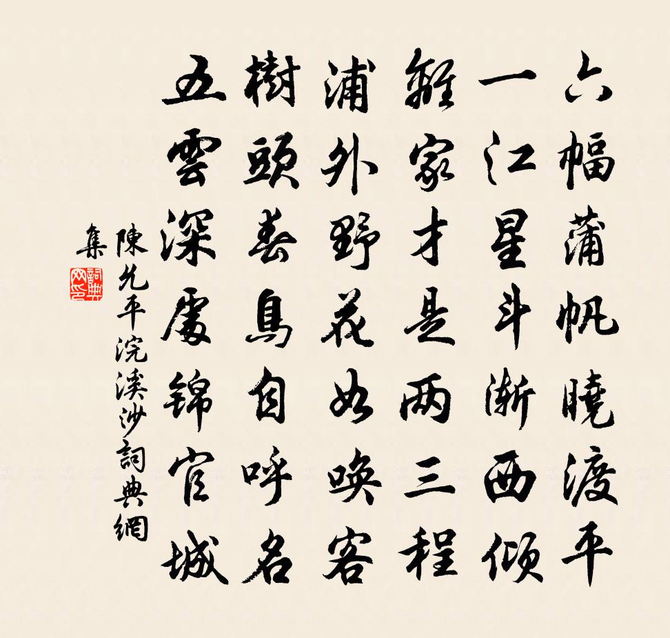 詩詞名句歷史字典書法欣賞書法字典國語詞典說文解字康熙字典古漢語字典標 題 作 者 詩 句 浣溪沙作者:陳允平 朝代:宋代浣溪沙原文六幅蒲帆曉渡平。一江星斗漸西傾。離家才是兩三程。浦外野花如喚客,樹頭春鳥自呼名。五雲深處錦官城。詩詞問答問:浣溪沙的作者是誰?答:陳允平問:浣溪沙寫於哪個朝代?答:宋代問:浣溪沙是什麼體裁?答:詞陳允平浣溪沙書法欣賞浣溪沙書法作品詩詞推薦寒夜曲朱渙〔宋代〕寒夜夜政長,愁人背燈立。驚風搖竹樹,棲鳥墮復集。山空接響多,室靜虛白入。怊悵不成眠,殘鍾曉邊急。掃花游/掃地游吳文英〔宋代〕水雲共色,漸斷岸飛花,雨聲初峭。步帷素裊。想玉人誤惜,章台春老。岫斂愁蛾,半洗鉛華未曉。艤輕棹。似山錦纏道(桑)馬子嚴〔宋代〕雨過園林,觸處落紅凝綠。正桑葉、齊如沃。嬌羞只恐人偷目。背立牆陰,慢展纖纖玉。聽鳩啼幾聲,耳邊相促。武學蔡博乾輓詩項安世〔宋代〕天子昔好武,儒臣皆諱文。誰能有勝具,不肯建奇勳。半世觀行己,千年勸事君。底須登大耋,金印負前聞。時樂鳥篇張說〔唐代〕舊傳南海出靈禽,時樂名聞不可尋。形貌乍同鸚鵡類,精神別稟鳳凰心。千年待聖方輕舉,萬里呈才無伴侶。紅茸哭德和伯氏六首林景熙〔宋代〕草枯霜白泣原鴒,五十三年老弟兄。風雨對床緣未了,荊花重合在來生。如大坂二絕王炎〔宋代〕盤薄解衣方少休,青山白水挽吾留。一聲杜宇喚歸意,百囀黃鸝生客愁。湖州歌九十八首 其十四汪元量〔宋代〕鐵瓮城頭馬亂嘶,金陵城下砲如飛。黑風捲地鼓鼙急,昨夜常州又受圍。賀淮南節度盧員外賜緋羅隱〔唐代〕儉蓮高貴九霄聞,粲粲朱衣降五雲。驄馬早年曾避路,銀魚今日且從軍。御題彩服垂天眷,袍展花心透縠紋。應笑辱井王安石〔宋代〕結綺臨春草一丘,尚殘宮井戒千秋。奢淫自是前王恥,不到龍沈亦可羞。秋懷十首汪莘〔宋代〕虞帝周王不復生,幾多豪傑應離明。鳳凰覽遍真難事,直至而今欠一聲。古梅蕭德藻〔宋代〕湘妃危立凍蛟背,海月冷掛珊瑚枝。醜怪驚人能嫵媚,斷魂只有曉寒知。太玉洞吸琴劉黻〔宋代〕無弦不成聲,有弦多失真。真聲在何所,和陶方寸春。文操惜憶遠,也壇嗟復陳。所以桑濮響,鄭衛波嬴秦。詎知擬寒山拾得二十首008王安石〔宋代〕幸身無事時,種種妄思量。張三喘口窄,李四帽檐長。失腳落地獄,將身投鑊湯。誰知受熱惱,卻不解思涼。醉落魄/一斛珠石孝友〔宋代〕紅嬌翠弱。怨人珠淚頻偷落。歸期莫負青箋約。雨斷雲銷,總是初情薄。夜深秋氣生簾幕。半衾依舊空閒卻。故人煙雨樓唐天麟〔宋代〕百尺樓高尺賞心,我來猶記舊登臨。四時天色有晴雨,一片湖光無古今。遠塔連雲知寺隱,小舟穿柳覺村深。憑闌紫宸殿正旦教坊詞致語口號蘇軾〔宋代〕臣聞行夏之時,正莫加於人統;采周之舊,王方在於鎬京。惟吉月之布和,休庶工而未作。使華遠集,鄰好交修。憶仙姿(九之二)賀鑄〔宋代〕日日春風樓上。不見石城雙槳。鴛枕夢回時,燭淚屏山相向。流蕩。流蕩。門外白苹溪漲。沁園春(雙溪狎鷗)盧祖皋〔宋代〕幾葉凋楓,半篙寒日,傍橋繫船。愛洞門深鎖,人間福地,雙溪分占,天上星躔。破帽敧寒,短鞭敲月,此地經行朱亥墓(俗謂屠兒原)蘇軾〔宋代〕昔日朱公子,雄豪不可追。今來游故國,大冢屈稱兒。平日輕公相,千金棄若遺。梁人不好事,名字寄當時。魯史名句推薦上取象於天,下取法於地,中取則於人,人之所以群居,和壹之理盡矣。李昉、李穆、徐鉉《太平御覽·禮儀部·卷二十四》 走馬西來欲到天,辭家見月兩回圓。岑參《磧中作》 回看射鵰處,千里暮雲平。王維《觀獵》 今施人薄而望人厚,則人唯恐其有賜於己也。墨子《墨子·49章 魯問》 佇聽寒聲,雲深無雁影。周邦彥《關河令·秋陰時晴漸向暝》 鎮日無心掃黛眉。臨行愁見理征衣。夏竦《鷓鴣天·鎮日無心掃黛眉》 如何肯到清秋日,已帶斜陽又帶蟬。李商隱《柳》 繁華事散逐香塵,流水無情草自春。杜牧《金谷園》 不怕慢,只怕站。佚名《增廣賢文·下集》 身無彩鳳雙飛翼,心有靈犀一點通。李商隱《無題·昨夜星辰昨夜風》