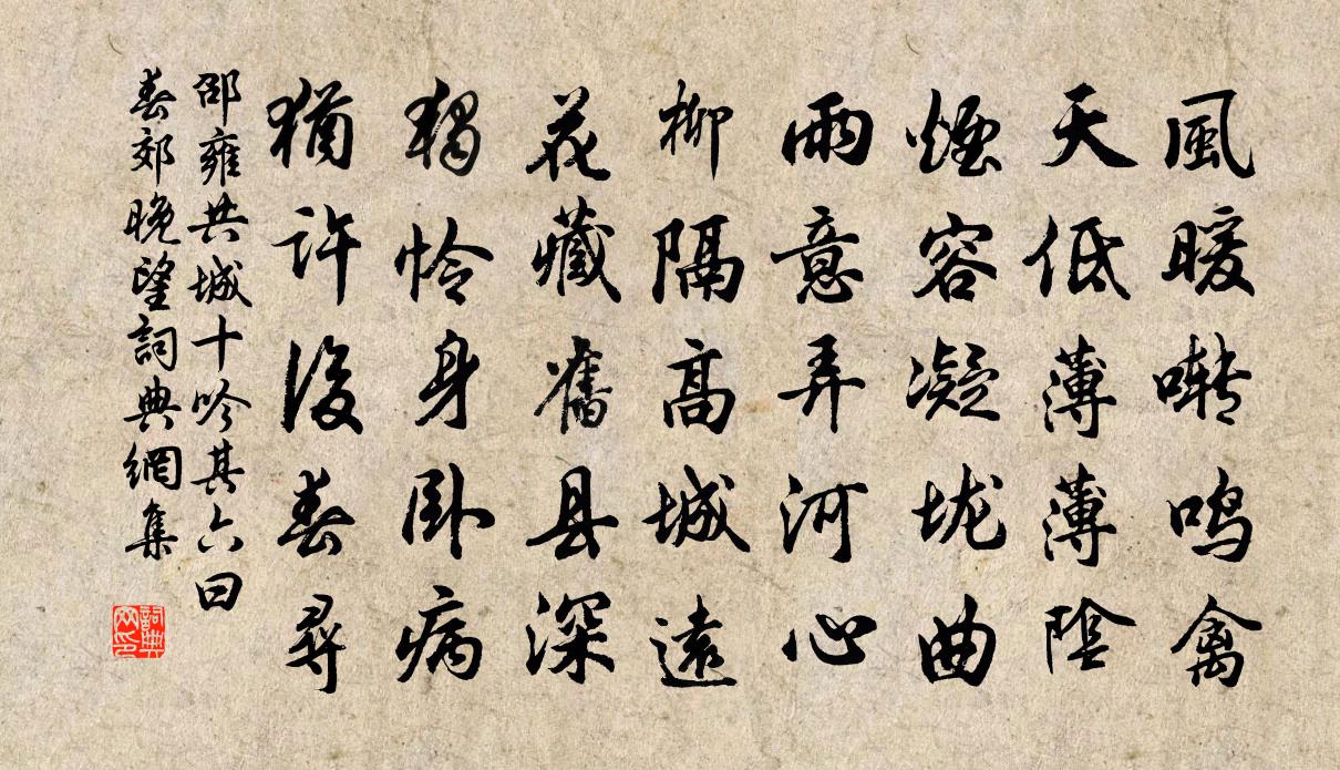 詩詞名句歷史字典書法欣賞書法字典國語詞典說文解字康熙字典古漢語字典標 題 作 者 詩 句 共城十吟其六曰春郊晚望作者:邵雍 朝代:宋代共城十吟其六曰春郊晚望原文風暖囀鳴禽,天低薄薄陰。煙容凝壠曲,雨意弄河心。柳隔高城遠,花藏舊縣深。獨憐身臥病,猶許後春尋。詩詞問答問:共城十吟其六曰春郊晚望的作者是誰?答:邵雍問:共城十吟其六曰春郊晚望寫於哪個朝代?答:宋代邵雍共城十吟其六曰春郊晚望書法欣賞共城十吟其六曰春郊晚望書法作品詩詞推薦糖多令(吳江中秋)汪元量〔宋代〕莎草被長洲。吳江拍岸流。憶故家、西北高樓。十載客窗憔悴損,搔短鬢、獨悲秋。人在塞邊頭。斷鴻書寄不。記偈六十三首釋道寧〔宋代〕兵隨印轉,將逐符行。把斷要關,不通音信。飲薛老亭晚歸蔡襄〔宋代〕終日行山不出城,城中山勢與雲平。萬家市井魚鹽合,千里川原彩畫明。坐上潮風醒酒力,晚來岩霧蓋鐘聲。歸時同舍弟恭歲暮寄晉州李六協律三十韻呂溫〔唐代〕古人猶悲秋,況復歲暮時。急景迫流念,窮陰結長悲。陽烏下西嶺,月鵲驚南枝。攬衣步霜砌,倚杖臨冰池。恍恍次韻和判曹韓學士見賞湖山宋庠〔宋代〕西溪本慰寂寥人,何幸開樽枉勝賓。一岸仙山平壓野,兩陂官柳綠圍春。我雖酩酊能騎馬,君自風流偶墊巾。更愧江城子(瀑布)李綱〔宋代〕琉璃滑處玉花飛。濺珠璣。噴霏微。誰遣銀河,一派九天垂。昨夜白虹來澗飲,留不去,許多時。幽人獨坐石嶔ㄛ醴泉院和凝〔唐代〕萬山嵐靄簇洋城,數處禪齋盡有名。古柏八株堆翠色,靈泉一派逗寒聲。暫游頗愛閒滋味,久住翻嫌俗性情。珍重夜行船丘崈〔宋代〕一舸鴟夷雲水路。貪遊戲、悄忘塵數。明月長隨,清風滿載,那向急流爭渡。邂逅占星來已暮。芝封待、卻催歸處新安鋪三首孔武仲〔宋代〕簟如秋水憩迴廊,素月分輝百倍涼。山木交加無意緒,故教疏影到人床。歸宜興留題竹西寺蘇軾〔宋代〕十年歸夢寄西風,此去真為田舍翁。剩覓蜀岡新井水,要攜鄉味過江東。道人勸飲雞蘇水,童子能煎 * 湯。暫借明發曲坑二首楊萬里〔宋代〕露草欣逢曉日新,各將珠琲斗呈珍。紅光影里如何揀,顆顆圜明顆顆勻。春閒戲書三首李新〔宋代〕老病空懷雲水鄉,涪江春浪接天長。扁舟擬下巫陽去,不聽巴猿已斷腸。奉和御製讀後周書夏竦〔宋代〕南荊推德厚,千里遠從師。奧識通三教,清聲冠一時。就招雖暫至,戀本固難移。故老稱前事,儒宗道益滋。雪裡尋梅宋祁〔宋代〕雪裡逢梅近臘時,梅姿雪態兩相宜。羨君此處留清賞,看遍溪頭南北枝。山行書事長孫佐輔〔唐代〕日落風??,驅車行遠郊。中心有所悲,古墓穿黃茅。茅中狐兔窠,四面烏鳶巢。鬼火時獨出,人煙不相交。行行南嶽修首座贊釋智遇〔宋代〕雲霧充飢腹,煙霞補破衣。祝融峰頂寺,幾度對斜暉。摸魚兒(過東平有感)汪夢斗〔宋代〕憶舊時、東方□郡,東原儘是佳處。梁都破了尋南渡,幾遍狐號鱔舞。君試覷。環一抹荒城,草色今如許。芳華舊望江南淨圓〔宋代〕娑婆苦,光影急如流。寵辱悲歡何日了,是非人我幾時休。生死路悠悠。三界裡,水面一浮漚。縱使英雄功蓋世,和李生九日二首胡寅〔宋代〕騷客悲秋心易催,主人醪醴正時哉。登高何必仙家術,酬節聊憑笑口開。鳳嶺勝游詩自好,龍山高宴首空回。獨余秋江送客白居易〔唐代〕秋鴻次第過,哀猿朝夕聞。是日孤舟客,此地亦離群。蒙蒙潤衣雨,漠漠冒帆雲。不醉潯陽酒,煙波愁 * 。名句推薦公生明,偏生暗荀子《荀子·不苟》 雨橫風狂三月暮,門掩黃昏,無計留春住。歐陽修《蝶戀花·庭院深深深幾許》 浮天滄海遠,去世法舟輕。錢起《送僧歸日本》 入苑白泱泱,宮人正靨黃。李賀《同沈駙馬賦得御溝水》 姑蘇城外一茅屋,萬樹梅花月滿天。唐寅《把酒對月歌》 此時卻羨閒人醉,五馬無由入酒家。白居易《早冬》 自別西風憔悴甚,凍雲流水平橋。陳維崧《臨江仙·寒柳》 荒煙涼雨助人悲,淚染衣襟不自知。王安石《送和甫至龍安微雨》 亂石穿空,驚濤拍岸,捲起千堆雪。蘇軾《念奴嬌·赤壁懷古》 虜騎聞之應膽懾,料知短兵不敢接,車師西門佇獻捷。岑參《走馬川行奉送出師西征 / 走馬川行奉送封大夫出師西征》