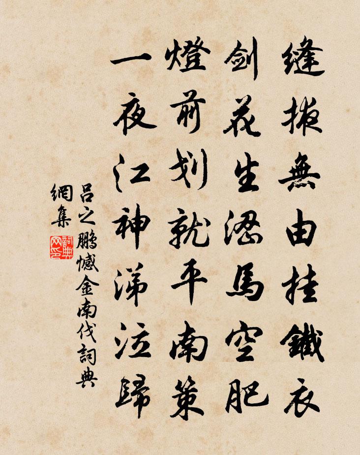 詩詞名句歷史字典書法欣賞書法字典國語詞典說文解字康熙字典古漢語字典標 題 作 者 詩 句 憾金南伐作者:呂之鵬 朝代:宋代憾金南伐原文縫掖無由掛鐵衣,劍花生澀馬空肥。燈前劃就平南策,一夜江神涕泣歸。詩詞問答問:憾金南伐的作者是誰?答:呂之鵬問:憾金南伐寫於哪個朝代?答:宋代呂之鵬憾金南伐書法欣賞憾金南伐書法作品詩詞推薦宣州雜詩二十首梅堯臣〔宋代〕宛水過城下,滔滔北去斜。遠船來橘蔗,深步上魚蝦。鵝美冒椒葉,蜜香聞稻花。歲時風俗美,笑殺異鄉槎。題潘彥政叔侄濯纓齋楊萬里〔宋代〕愚溪之口湘江左,茅齋不小亦不大。齋前看江江只流,江中望齋齋更幽。兩潘讀書韻清壯,湘妃出聽魚吹浪。大潘減字木蘭花林淳〔宋代〕燭花呈燦。瑞氣滿筵春欲爛。月色中宵。疑是階前雪未消。騷人詞客。魂斷蠟梅香已籍。誰更情關。一點新愁入遠謝裴司空寄馬(一作蒙裴相公賜馬,謹以詩謝)張籍〔唐代〕騄耳新駒駿得名,司空遠自寄書生。乍離華廄移蹄澀,初到貧家舉眼驚。每被閒人來借問,多尋古寺獨騎行。長思詠史上周公陳普〔宋代〕仲尼齒髮正強時,夜夜神交似故知。話到子孫郊禘處,幾回對榻共攢眉。句朱炎〔宋代〕古人不到處,吾子獨留心。施南路偶書王周〔唐代〕大石嶺頭梅欲發,南陵陂上雪初飛。苦無酒解愁成陣,又附蘭橈向秭歸。萬景樓三首用韻孫應時〔宋代〕阮籍少青眼,元龍思臥樓。與君非俗士,為我望神州。明月不可問,長江空自流。悠悠復何道,行止一虛舟。寶公贊釋紹曇〔宋代〕折杖頭,閒骨董。惑梁王,少賣弄。鷹巢不至生鸞鳳。九日諸人集於林杜甫〔唐代〕九日明朝是,相要舊俗非。老翁難早出,賢客幸知歸。舊采黃花剩,新梳白髮微。漫看年少樂,忍淚已沾衣。乙亥歲除漁梁村黃公度〔宋代〕年來似覺道途熟,老去空更歲月頻。爆竹一聲鄉夢破,殘燈永夜客愁新。雲容山意商量雪,柳眼桃腮領略春。想得對月六首白玉蟾〔宋代〕水澄熊白成壺酒,楓染猩紅滿路旗。坐待西風迎素月,青天笑我獨詩痴。感遇之十九陳子昂〔唐代〕聖人不利己。憂濟在元元。黃屋非堯意。瑤台安可論。吾聞西方化。清淨道彌敦。奈何窮金玉。雕刻以為尊。雲構而久交葉茵〔宋代〕彼哉市道交,出語指天日。未逢魏與裴,三嘆扁斯石。青雲亭李壁〔宋代〕誰人此地著危欄,城郭江山表里看。時節不知春已半,天圍稍覺目前寬。題汪水雲詩卷秦嗣彭〔宋代〕禾黍興悲兩鬢皤,千年荊棘幾銅駝。義熙處士流風遠,天寶詩人舊恨多。雨露又新周草木,煙塵空想漢山河。庾郎漁家傲 贈寧生王哲〔元代〕夫喚三郎妻九姐。兩椽合得一間舍。骨作檣梁皮作瓦。休夸詫。父娘成就伊居也。兒願室家女願嫁。舅姑修葺何時新豐作貽殷四校書儲光羲〔唐代〕漢皇思舊邑,秦地作新豐。南出華陽路,西分長樂宮。安知天地久,不與昔年同。雞犬暮聲合,城池秋霽空。紛吾寄陳留江子我晁說之〔宋代〕江家宅在嚴家瀨,亦有商聲歌半夜。不煩死魚遠吐墨,誰識天馬早流赭。嗟予久已烏角巾,愧爾當年白蓮社。唯昔夢井元稹〔唐代〕夢上高高原,原上有深井。登高意枯渴,願見深泉冷。裴迴繞井顧,自照泉中影。沉浮落井瓶,井上無懸綆。念此名句推薦臘盡愁難盡,春歸人未歸。馮夢龍《喻世明言·卷一》 苦雨思白日,浮云何由卷。李白《玉真公主別館苦雨贈衛尉張卿二首》 居身務期質樸,教子要有義方。朱柏廬《朱子家訓·全文》 九日登高處,群山入望賒。趙時春《原州九日》 望廬思其人,入室想所歷。潘安《悼亡詩三首》 波漂菰米沉雲黑,露冷蓮房墜粉紅杜甫《秋興八首》 多少天涯未歸客,盡借籬落看秋風。唐寅《菊花》 淅淅西風淡淡煙,幾點疏疏雨。葛立方《卜運算元·席間再作》 朝見馬嶺黃沙合,夕望龍城陣雲起。盧思道《從軍行》 鄉書何處達?歸雁洛陽邊。王灣《次北固山下》
