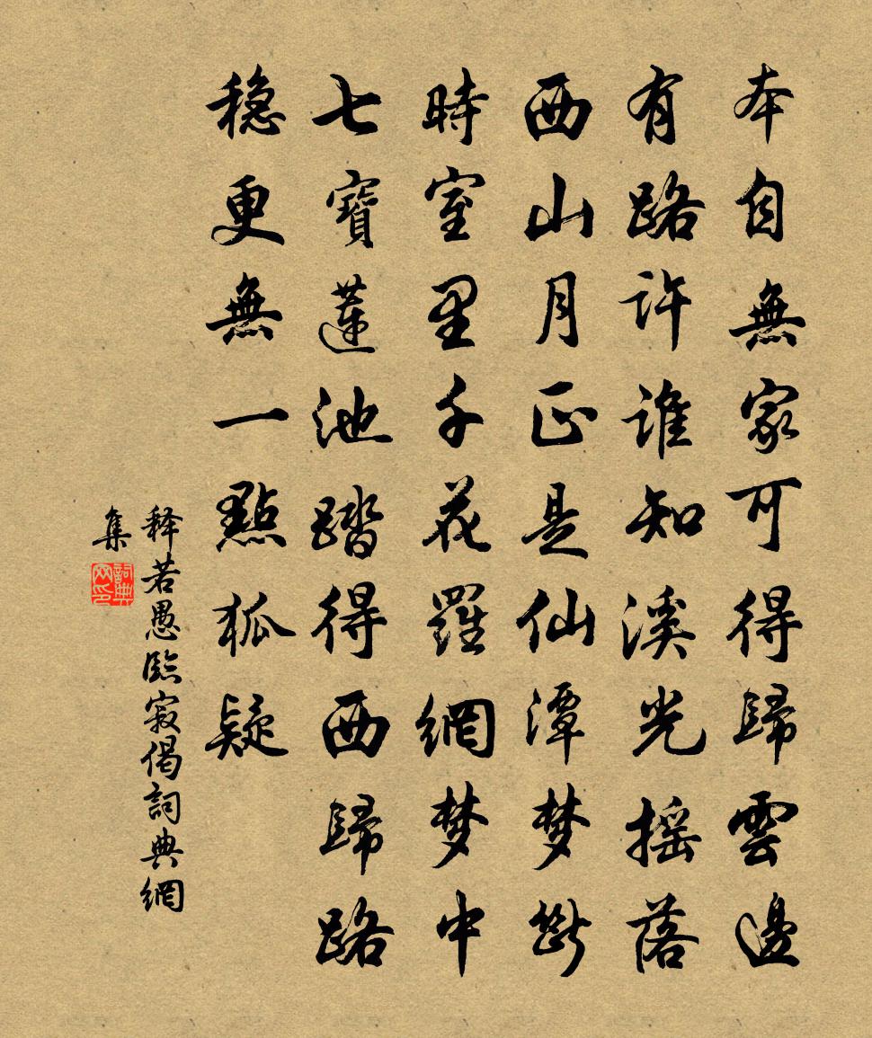 詩詞名句歷史字典書法欣賞書法字典國語詞典說文解字康熙字典古漢語字典標 題 作 者 詩 句 臨寂偈作者:釋若愚 朝代:宋代臨寂偈原文本自無家可得歸,雲邊有路許誰知。溪光搖落西山月,正是仙潭夢斷時。室里千花羅網,夢中七寶蓮池。踏得西歸路穩,更無一點狐疑。詩詞問答問:臨寂偈的作者是誰?答:釋若愚問:臨寂偈寫於哪個朝代?答:宋代釋若愚臨寂偈書法欣賞臨寂偈書法作品詩詞推薦題傅侍郎寒碧十五韻梅坡陳宓〔宋代〕江南開最蚤,猶及仲春時。此地先飛雪,多情卻願遲。春日懷淮陽六首張耒〔宋代〕最愛南城汲井園,春來蔬甲不勝繁。人家斷處無雞犬,遲日東風似古原。玉樓春(海棠)王詵〔宋代〕錦城春色花無數。排比笙歌留客住。輕寒輕暖袷衣天,乍雨乍晴寒食路。花雖不語鶯能語。莫放韶光容易去。海棠訓世孝弟詩十首邵雍〔宋代〕子孝親兮弟敬哥,訓賢妯娌事翁婆。好遵孟母三遷教,須讀張公百忍歌。孝友睦{淵換女旁}兼任恤,智仁聖義與呈明叔七首趙蕃〔宋代〕今年梅愈去年多,我亦催行奈汝何。此樹與君同所植,交情要保歲寒柯。秦君亭陳瓘〔宋代〕世梗賢路塞,達人識窮通。檀槍天寶末,士路如飄蓬。聘君當此時,卷跡雲霞中。能令千載後,嘆息詩人窮。喜小樓西新柳抽條白居易〔唐代〕一行弱柳前年種,數尺柔條今日新。漸欲拂他騎馬客,未多遮得上樓人。須教碧玉羞眉黛,莫與紅桃作麴塵。為報頌證道歌證道歌釋印肅〔宋代〕外道聰明無智慧,養生只欲貪名利。燒丹練藥學神仙,有為不了終歸墜。酬刑部姚郎中馬戴〔唐代〕路岐人不見,尚得記心中。月憶瀟湘渚,春生蘭杜叢。鳥啼花半落,人散爵方空。所贈誠難答,泠然一雅風。臨終偈釋祖珍〔宋代〕生本無生,死本無死。生死二途,了無彼此。喜雨燕致語口號陳造〔宋代〕華筵楚楚為誰開,和氣融融逐雨回。飲處偕酬未央樂,旱餘新紀不為災。詩成肯放庭陰轉,舞困何妨閹鼓催。聽取僻性高遁翁〔宋代〕僻性一生忘嗜酒,勞神終日倦吟詩。尋常高臥松床穩,不管庭前鶴到遲。途葉二絕杜范〔宋代〕一點天根動處微,已令萬物受春熙。欲知消長從來意,便是人心善惡機。送張屯田歸洛歌歐陽修〔宋代〕昔年洛浦見花落,曾作悲歌歌落花。愁來欲遣何可柰,時向金河尋杜家。杜家花雖非絕品,猶可開顏為之飲。少年句張釜〔宋代〕家傳活國有良方。重訪馬碧梧汪元量〔宋代〕萬里遠行役,十年良可哀。前輩古風在,故人今雨來。絕口不言事,挽須惟把杯。種得碧梧樹,春風花自開。懷果上人孟貫〔唐代〕擁錫南遊去,名香幾處焚。別來無遠信,多恐在深雲。好月曾同步,幽香省共聞。相思不相見,林下葉紛紛。答林石田見訪有詩相勞汪元量〔宋代〕偶攜降幟立詩壇,剪燭西窗共笑歡。落魄蘇秦今席暖,猖狂阮籍尚氈寒。山中客老乾莖白,海上人歸一寸丹。世事黃葵王操〔宋代〕昔年南國看黃葵,雲鬢金釵向後垂。今日林容籬落下,秋風寂寞兩三枝。野步晚歸陸游〔宋代〕江村十日喜霜晴,草死泥乾拄杖輕。溝港淺來無鷺下,郊原暖處有牛耕。賓士久厭兒童戲,淪落偏知世俗情。欲向名句推薦把酒對斜日,無語問西風。楊炎正《水調歌頭·把酒對斜日》 芳洲拾翠暮忘歸,秀野踏青來不定。張先《木蘭花·乙卯吳興寒食》 燕歌未斷塞鴻飛,牧馬群嘶邊草綠。李益《塞下曲·其一》 胡沙沒馬足,朔風裂人膚。韋元甫《木蘭歌》 南軒有孤松,柯葉自綿冪。李白《南軒松》 過目成誦,出口成章。馮夢龍《警世通言·卷三》 那年離別日,只道住桐廬。劉采春《囉嗊曲·那年離別日》 財物輕,怨何生。言語忍,忿自泯。李毓秀《弟子規·出則弟》 彌傷孤舟夜,遠結萬里心。權德輿《月夜江行 / 旅次江亭》 牝雞無晨;牝雞之晨,惟家之索。佚名《尚書·周書·牧誓》