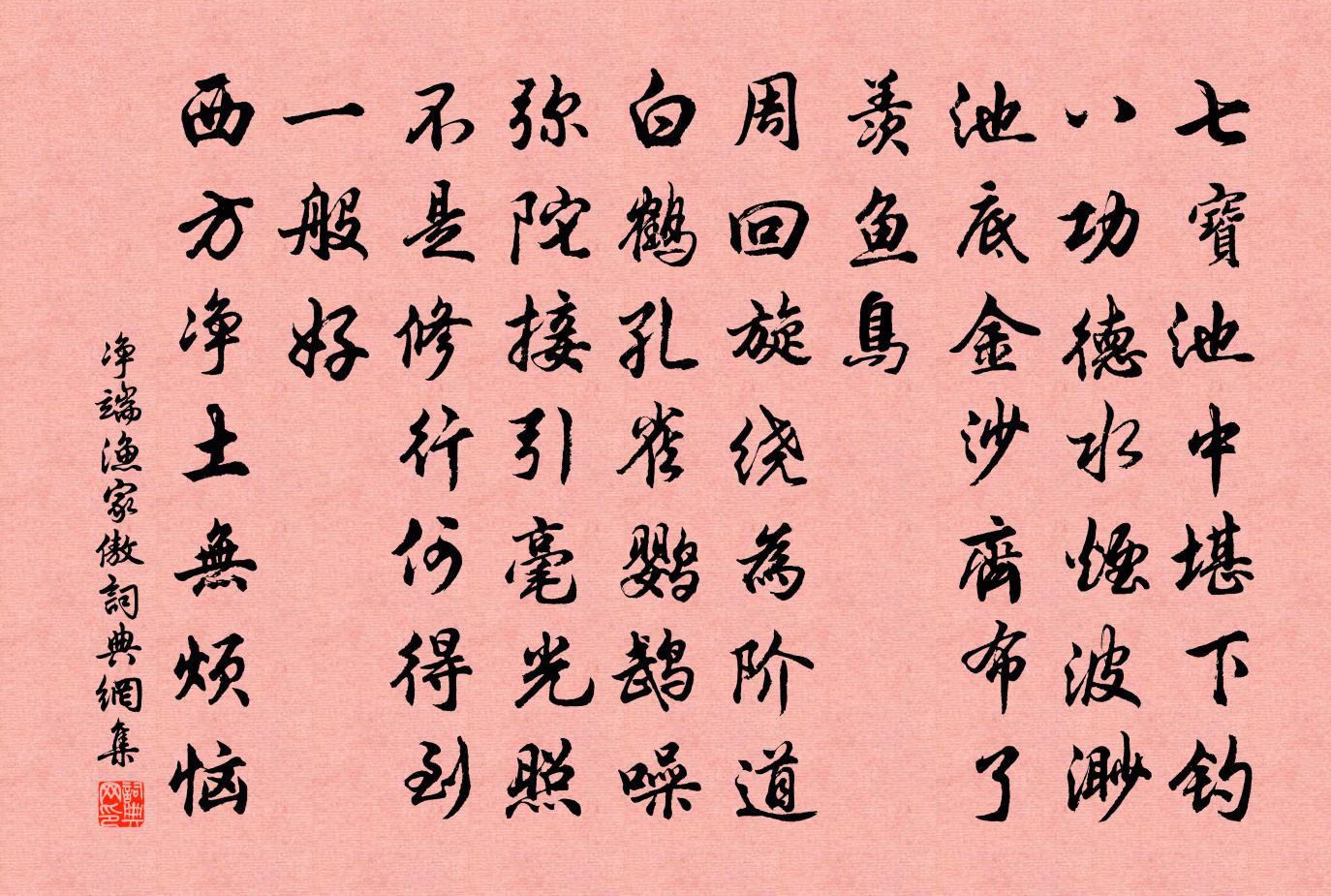 詩詞名句歷史字典書法欣賞書法字典國語詞典說文解字康熙字典古漢語字典標 題 作 者 詩 句 漁家傲作者:淨端 朝代:宋代漁家傲原文七寶池中堪下釣。八功德水煙波渺。池底金沙齊布了。羨魚鳥。周迴旋繞為階道。白鶴孔雀鸚鵡噪。彌陀接引毫光照。不是修行何得到。一般好。西方淨土無煩惱。詩詞問答問:漁家傲的作者是誰?答:淨端問:漁家傲寫於哪個朝代?答:宋代問:漁家傲是什麼體裁?答:詞淨端漁家傲書法欣賞漁家傲書法作品詩詞推薦首尾吟邵雍〔宋代〕堯夫非是愛吟詩,為見聖賢興有時。日月星辰堯則了,江河淮濟禹平之。皇王旁伯經褒貶,雪月風花未品題。豈謂初春書喜陸游〔宋代〕我生本痴絕,萬事不繫懷;一朝蛻形去,豈問棄與埋。遊宦三十年,所向無一諧,偶然有天幸,自退非人排。黃紙施兄折贈苔梅將以二絕和韻謝之程公許〔宋代〕老乾查牙裹綠苔,雪中能有幾花開。杜陵不耐香愁亂,更看幽人輕折來。會慶聖節曹勛〔宋代〕帝出乘時葉小春,中興復古付曾孫。奉親聖德躬仁孝,御極天章廓晏溫。書軌自應歸正統,蠻夷先已侍修門。凌虛和內鄉李師甫長官見寄邵雍〔宋代〕雖未似神仙,能逃暑與寒。何嘗無水竹,未始離林巒。道不同新學,才難動要官。時和歲豐後,亦自有餘歡。句孫子肅〔宋代〕揖仙亭上觀秋漲,坐我吳江雲水鄉。哭五一弟先輩二首劉克莊〔宋代〕自小即相依,天涯影伴飛。共燈抄細字,分俸贖寒衣。已痛身長訣,猶疑客未歸。素幃惟 * ,斷續哭聲稀。為昆石蒲苗刪去焦葉戲成舒岳祥〔宋代〕細雨幽窗曉露垂。雁苗昆石兩相宜。老翁拔白知無用,且為昌蒲鑷退髭。妙山孫元濟建閣江瀕以館往來士大夫余取韓文曾豐〔宋代〕未慣觀空空可觀,更參向上一機關。大通與我合為一,眼自有餘空自慳。題中川張氏所居薛嵎〔宋代〕鷗鳥往來處,此翁甘隱淪。地因人物著,名入郡圖新。夜月情懷淡,茅茨意態真。高風無識拔,老卻採薇身。挽李貫之郎中二首洪咨夔〔宋代〕天定何能待,西風杳去槎。斯人嗟已矣,吾道信非耶。石泐名猶在,江空恨更賒。濂溪應配食,杯水薦寒花。送時適歸彭城兼寄王會之並張白雲賀鑄〔宋代〕壯年客宦樂徐州,五見黃華戲馬周。無復登山拋舊屐,不堪臨水送歸舟。東城公子猶三徑,南墅先生久一邱。為話借韻書懷戴復古〔宋代〕虛氣撐枯腹,長身到老貧。高吟常駭俗,爛醉若驕人。京洛繁華夢,江湖浩蕩春。布衣如雪白,不受庾公塵。清平樂(瑞香)袁去華〔宋代〕爭妍占早。只有梅同調。紫暈丁香青蓋小。比似橫枝更好。日烘錦被薰香。老夫惱得顛狂。把酒花前一笑,醉鄉別五祖栽松六祖擔柴贊釋了惠〔宋代〕恨殺老頭陀,山移恨不磨。吾今擔頭重,為汝種松多。歲晚感事宋庠〔宋代〕積水千陂會,孤城一角存。鳥烏喧畫霽,蛇虺喜冬溫。地敻荒民屋,天高思國門。楚優歌舞拙,何處強持樽。官滿寓濟川館得葉嘉仲和朱宰梅花詩次韻雲作戴栩〔宋代〕草木有麟鳳,眾只發等流。終然浪題品,麟鳳自知不。送郭定夫往江西二首陳藻〔宋代〕去年誤作送君詩,卻又論文得幾時。今日溪邊成話別,榮歸早赴北堂期。偈頌一百二十三首釋崇岳〔宋代〕半雨半晴,桃紅李白。點著便行,不勞啗啄。陸羽徐鈞〔宋代〕野客耽茶著作經,一時評品亦良精。誰知茗飲成風后,從此朝廷榷法行。名句推薦虎踞龍蟠何處是,只有興亡滿目。辛棄疾《念奴嬌·登建康賞心亭呈史致道留守》 東船西舫悄無言,唯見江心秋月白。白居易《琵琶行 / 琵琶引》 不知香積寺,數里入雲峰王維《過香積寺》 但使龍城飛將在,不教胡馬度陰山。王昌齡《出塞二首》 古戍蒼蒼烽火寒,大荒沈沈飛雪白。李頎《聽董大彈胡笳聲兼寄語弄房給事》 更被夕陽江岸上,斷腸煙柳一絲絲。韋莊《江外思鄉》 獨倚畫欄如有意,清砧怨笛送黃昏。曹雪芹《詠白海棠》 懷舊空吟聞笛賦,到鄉翻似爛柯人。劉禹錫《酬樂天揚州初逢席上見贈》 大鵬一日同風起,扶搖直上九萬里。李白《上李邕》 汀洲采白苹,日落江南春。柳惲《江南曲》