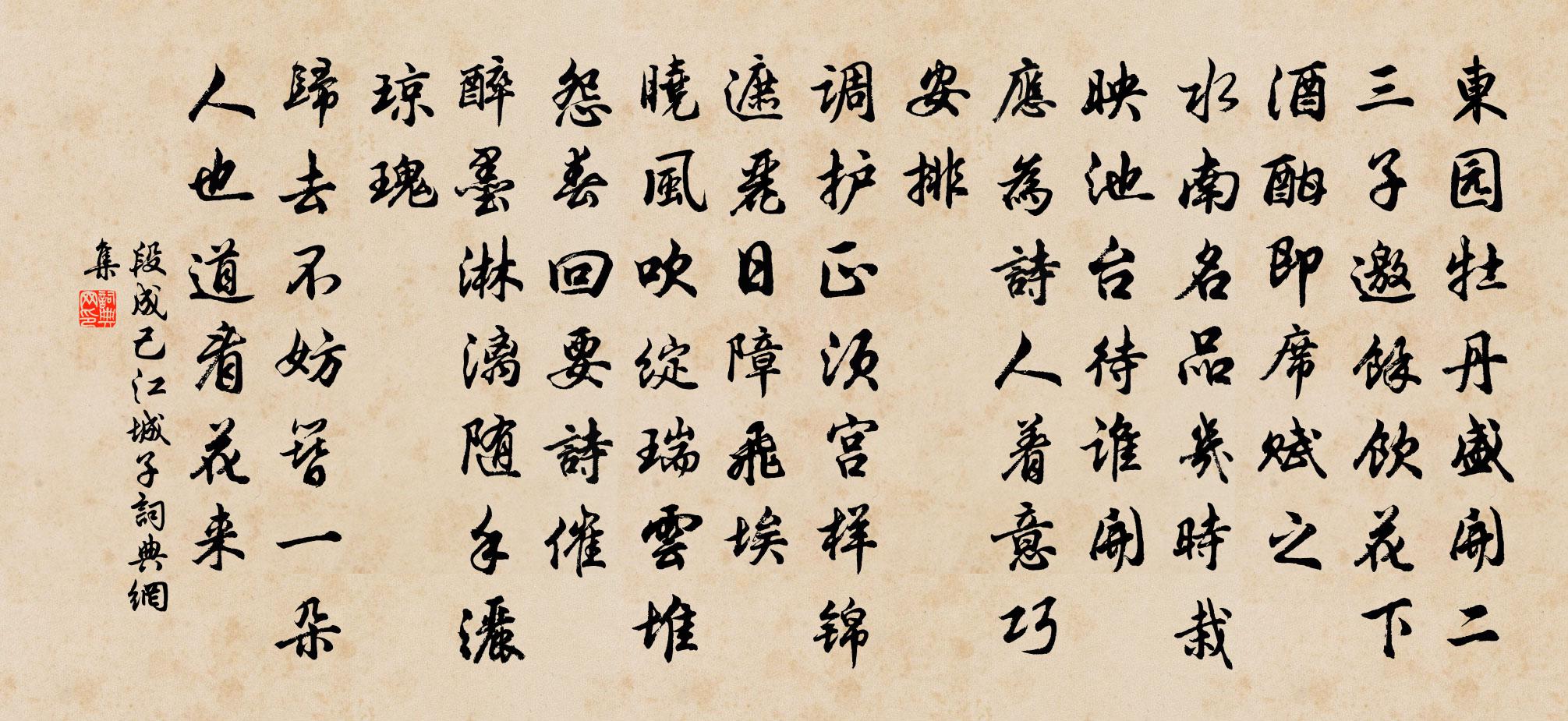詩詞名句歷史字典書法欣賞書法字典國語詞典說文解字康熙字典古漢語字典標 題 作 者 詩 句 江城子作者:段成己 朝代:金代江城子原文東園牡丹盛開,二三子邀余飲花下。酒酣,即席賦之。水南名品幾時栽?映池台,待誰開?應為詩人著意巧安排。調護正須宮樣錦,遮麗日,障飛埃。曉風吹綻瑞雲堆。怨春回,要詩催。醉墨淋漓,隨手灑瓊瑰。歸去不妨簪一朵,人也道,看花來。詩詞問答問:江城子的作者是誰?答:段成己問:江城子寫於哪個朝代?答:金代問:江城子是什麼體裁?答:詞段成己江城子書法欣賞江城子書法作品詩詞推薦送判院楊道夫釋寶曇〔宋代〕君詩如周郎,年少新將兵。阿瞞不及語,夜半火到明。金屋小喬在,國色傾人城。不見今十年,詩已如此成。愈談天姥嶺樓鑰〔宋代〕剡水迂迴徹底清,濫觴從此一泓澄。曉來蠟屐沖寒上,踏碎山頭十里冰。送人下第歸江州許彬〔唐代〕名高不俟召,操賦獻君門。偶屈應緣數,他人盡為冤。新春城外路,舊隱水邊村。歸去無勞久,知音待更論。明遠庵黃庭堅〔宋代〕遠公引得陶潛住,美酒沽來飲無數。我醉欲眠卿且去,只有空瓶同此趣。誰知明遠似遠公,亦欲我行庵上路。多方聽琴釋智圓〔宋代〕自得南風旨,虛堂此夕彈。正聲傳不易,俗耳聽終難。峭壁蟲音絕,喬枝鶴夢殘。坐來消萬慮,斜月上危欄。黃梅陳宓〔宋代〕來禽青李不待熟,杜上作酸能晚黃。期與虀鹽同事業,每因煙雨長風光。丹心只有帝心識,苦口寧為眾口嘗。擲棄賢者之孝二百四十首子游林同〔宋代〕犬馬何以別,斯言似太深。深言變養者,可不敬於心。五用韻方岳〔宋代〕能官不如歸,能詩不如睡。春風遽如許,對酒每三喟。駕言平山游,歲月驚屢至。豈不賢於人,逐逐利名醉。踏莎行(雨中觀海棠)劉辰翁〔宋代〕命薄佳人,情鍾我輩。海棠開後心如碎。斜風細雨不曾晴,倚闌滴盡胭脂淚。恨不能開,開時又背。春寒只了房櫳偈頌一百零二首釋紹曇〔宋代〕共飯江湖,何須晙斗。含血噴人,先污其口。結成不共戴天冤,句句無非是罵門。喜劉寶學彥修得歸因敘初時悽愴之意十首張嵲〔宋代〕灕水津頭逢早春,桂林楊柳拂行塵。西園無限芳菲樹,皆作新花詩主人。偈頌二首釋圓日〔宋代〕倒腹傾腸幾個知,更無比發可相依。直饒徹底承當去,也落他家第二機。追和東坡送春和陳德夫王之道〔宋代〕柳外風檣迅莫追,柳間遲日弄晴暉。青春已作堂堂去,烏轡何由緩緩飛。入戶呢喃輕語燕,隔林咿軋靜鳴機。誰言雨中作陸游〔宋代〕社瓮醅香燕子歸,陰風吹雨暗郊扉。疏溝園叟方攜鍤,採藥蠻童已濕衣。山雉尾垂沖靄去,水雞翅重蹋波飛。憑闌平戎(時諫官諭北虜未回,天德軍帥請修城備之)趙嘏〔唐代〕邊聲一夜殷秋鼙,牙帳連烽擁萬蹄。武帝未能忘塞北,董生才足使膠西。冰橫曉渡胡兵合,雪滿窮沙漢騎迷。自古感皇恩(解秀州郡印,次王倅·韻)毛滂〔宋代〕兩歲撫邦人,曾無恩意。別後何人更相記。題輿玉樹,愧與蒹葭相倚。殷勤猶念我,同吟醉。畫舸相追,孤城已閉【南呂】罵玉郎過感皇恩採茶歌 閨情孫周卿〔元代〕鞦韆院宇春將暮,紅滴淚綠溶朱,朝雲隔斷陽台路。去鳳孤,來燕疏,流鶯妒。 懶步階除,倦立亭隅。草煙鋪論語十則佚名〔先秦〕子曰:“學而時習之,不亦說乎?有朋自遠方來,不亦樂乎?人不知而不慍,不亦君子乎?”(《學而》)曾子曰謁金門張元乾〔宋代〕風露底。石上岸巾愁起。月到房心天似水。亂峰清影里。此去登瀛須記。今夕道山同醉。春殿明年人共指。玉皇香偈傾一百六十九首釋智朋〔宋代〕卒風暴雨,鼓盪無前。石裂崖崩,迴避不及。總教喪盡生涯,方見時清道泰。功不浪施。名句推薦王者以民為天,而民以食為天。班固《漢書·傳·酈陸朱劉叔孫傳》 昨夜斗回北,今朝歲起東。孟浩然《田家元日》 遙知湖上一樽酒,能憶天涯萬里人。歐陽修《春日西湖寄謝法曹歌》 官河水靜闌乾暖,徙倚斜陽怨晚秋。史達祖《鷓鴣天·衛縣道中有懷其人》 一為遷客去長沙,西望長安不見家。李白《與史郎中欽聽黃鶴樓上吹笛 / 題北榭碑》 是無貓邪,是不會蓄貓也。樂鈞《世無良貓》 空對著,山中高士晶瑩雪曹雪芹《終身誤》 料想故園桃李,也應怨月愁風趙崇《清平樂·懷人》 今夜不知何處宿,平沙萬里絕人煙。岑參《磧中作》 艱難苦恨繁霜鬢,潦倒新停濁酒杯。杜甫《登高》