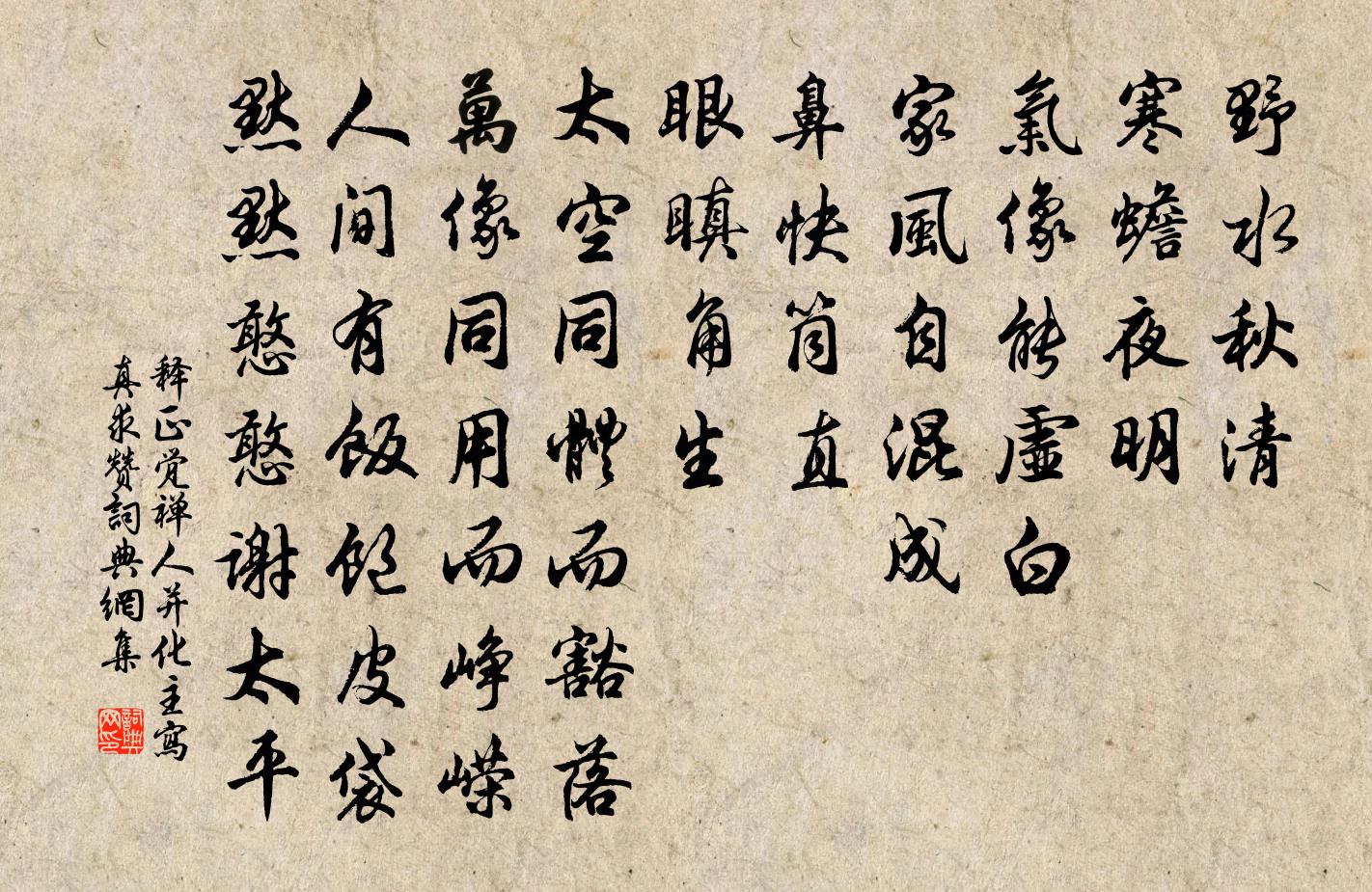 詩詞名句歷史字典書法欣賞書法字典國語詞典說文解字康熙字典古漢語字典標 題 作 者 詩 句 禪人並化主寫真求贊作者:釋正覺 朝代:宋代禪人並化主寫真求贊原文野水秋清,寒蟾夜明。氣像能虛白,家風自混成。鼻快筒直,眼瞋角生。太空同體而豁落,萬像同用而崢嶸。人間有飯飽皮袋,默默憨憨謝太平。詩詞問答問:禪人並化主寫真求贊的作者是誰?答:釋正覺問:禪人並化主寫真求贊寫於哪個朝代?答:宋代釋正覺禪人並化主寫真求贊書法欣賞禪人並化主寫真求贊書法作品詩詞推薦禁直偶作三首曹勛〔宋代〕聲藏禁柳鶯簧巧,香靄宮花鳳髓浮。不怕苑中歸騎晚,分光御燭下神州。橫路林少皋輓詞林亦之〔宋代〕十年騎馬畫橋歸,長記朱樓傍水湄。今日悲吟想君屋,一如騎馬十年時。殘句:討情不負齊安郡王禹偁〔宋代〕討情不負齊安郡,杜牧掌年與我齊。摸魚兒(春雪客中寄白香岩、王信父)張炎〔宋代〕又孤吟、灞橋深雪,千山絕盡飛鳥。梅花也著東風笑,一夜瘦添多少。春悄悄。正斷夢愁詩,忘卻池塘草。前村路山行孫應時〔宋代〕中年意與山林會。勝日身兼杖屨輕。正有百錢堪獨往,不將一賞負秋晴。寄題傅欽之草堂秦觀〔宋代〕河陽有洑流,經營太行根。盛德不終晦,發為清濟源。斯堂濟源上,太行正當門。仰視浮雲作,俯窺流水奔。修竹八景勝概藥壺閃影方鳳〔宋代〕紫車貯藥壺,日夕發光怪。不道洞府深,翻嫌八荒隘。過分水嶺董嗣杲〔宋代〕看雲忘斗峻,倚石望藤懸。鳥背斜陽去,牛翻淺草眠。井桐支野廟,溪水沃山田。隔嶺僧逢客,狂談馬祖禪。石城夜賦陳與義〔宋代〕初月光滿江,斷處知急流。沉沉石城夜,漠漠西漢秋。為客寐常晚,臨風意難收。三更柁樓底,身世入搔頭。仲尼吟邵雍〔宋代〕仲尼生魯在吾先,去聖千餘五百年。今日誰能知此道,當時人自比於天。皇王旁伯中原主,父子君臣萬世權。河不霅上宴別許渾〔唐代〕山斷水茫茫,洛人西路長。笙歌留遠棹,風雨寄華堂。紅壁耿秋燭,翠簾凝曉香。誰堪從此去,雲樹滿陵陽。和雨崖吳提弄奉母夫人雨中登魯公亭釋道璨〔宋代〕白髮照黃花,薄晚散幽步。何年乘五雲,來自三神嶼。膝下千載人,富貴等儒素。西風天地秋,細雨江城莫。酒酣蝶戀花楊 * 〔宋代〕初過元宵三五後。曲檻依依,終日搖金牖。瘦損舞腰非為酒。長條聊贈垂鞭手。幾葉小梅春已透。信是風流,占盡滿江紅 贈止庵張宰公李道純〔元代〕性正惟中,只這是、修仙秘訣。若稍有偏頗,動生差別。試向動中持得定,自然靜里機通徹。會三元、五氣入黃庭三登樂(慶黃守·正月廿二)羅子衎〔宋代〕過了元宵,見七葉蓂又飛。恰今朝、昴宿降瑞。初度果生賢,盡道丰姿絕異。翰林人物,雲霄富貴。自棲鸞展驥。道旁槿籬楊萬里〔宋代〕夾路疏籬錦作堆,朝開暮落復朝開。抽心粔籹輕拖糝,近蔕燕支釅抹腮。占破半年猶道少,何曾一日不芳來。花中尖中曲趙希桐〔宋代〕長眉柳葉交青條,玉花嬌面垂雲髫。湖波藍色春寥寥,大堤新曲乾銀霄。翠絲絡馬金褭腰,香風隨步煙飛飄。芳亭西江月管鑒〔宋代〕夜雨落花滿地,曉風飛絮連天。苦無春恨可縈牽。只數年華暗換。生意惟添白髮,化工不染朱顏。老來愈覺欠清閒贈方介石徐元傑〔宋代〕介石翁來契所思,騷吟風雅盡追隨。庾清鮑逸可無酒,島瘦郊寒只有詩。原不染塵圭竇適,未能忘世璧雍馳。賦違丁香陶弼〔宋代〕萬枝千葉遞相貌,內結花心外結身。草木至微猶有合,悲哉你子與君臣。名句推薦佳人應怪我,別後寡信輕諾。柳永《尾犯·夜雨滴空階》 何日平胡虜,良人罷遠征。李白《子夜吳歌·秋歌》 不堪腸斷思鄉處,紅槿花中越鳥啼。李德裕《謫嶺南道中作》 種豆南山下,草盛豆苗稀。陶淵明《歸園田居·其三》 山際見來煙,竹中窺落日。吳均《山中雜詩》 情之所鍾,雖醜不嫌。沈復《浮生六記·閨房記樂》 內不失真,而外不殊俗王通《中說·卷六·禮樂篇》 夫人雖有性質美而心辯知,必將求賢師而事之荀子《荀子·性惡》 草色青青柳色黃,桃花歷亂李花香。賈至《春思二首·其一》 梅花雪,梨花月,總相思。張惠言《相見歡·年年負卻花期》