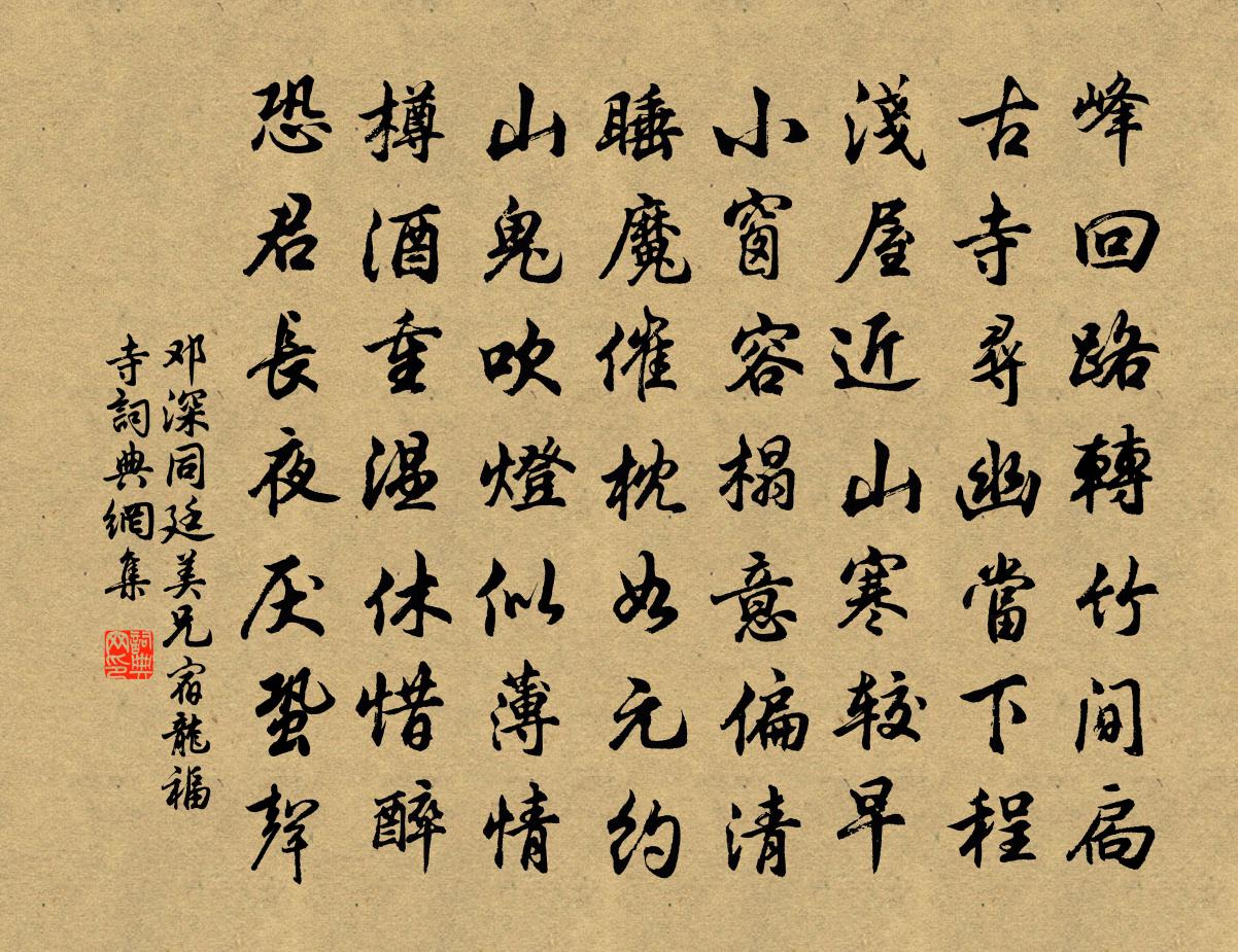 詩詞名句歷史字典書法欣賞書法字典國語詞典說文解字康熙字典古漢語字典標 題 作 者 詩 句 同廷美兄宿龍福寺作者:鄧深 朝代:宋代同廷美兄宿龍福寺原文峰迴路轉竹間扃,古寺尋幽當下程。淺屋近山寒較早,小窗容榻意偏清。睡魔催枕如元約,山鬼吹燈似薄情。樽酒重溫休惜醉,恐君長夜厭蛩聲。詩詞問答問:同廷美兄宿龍福寺的作者是誰?答:鄧深問:同廷美兄宿龍福寺寫於哪個朝代?答:宋代鄧深同廷美兄宿龍福寺書法欣賞同廷美兄宿龍福寺書法作品詩詞推薦迎春樂張先〔宋代〕城頭畫角催夕宴。憶前時、小樓晚。殘虹數尺雲中斷。愁送目、天涯遠。枕清風、停畫扇。逗蠻簟、碧紗零亂。怎集喜二首岳珂〔宋代〕水面開新皺,山容散宿顰。松巢猨已識,花徑鹿初馴。雲倦隨歸鳥,風清似故人。逢迎真不暇,誰作近前嗔。感事吟邵雍〔宋代〕為善大宜量力分,知幾都在近人情。人情盡後疑難人,力分量時事自平。留別王嘉叟檢正喻良能〔宋代〕四海望霖雨,一人須股肱。我本田家子,蹉跎將暮齡。相逢豈在早,一見蓋已傾。謂我雖禿犀,敝帚亦足稱。持獻靜林精舍靈一〔唐代〕靜林溪路遠,蕭帝有遺蹤。水擊羅浮磬,山鳴于闐鍾。燈傳三世火,樹老萬株松。無數煙霞色,空聞昔臥龍。漁者翁洮〔唐代〕一葉飄然任浪吹,雨蓑煙笠肯忘機。只貪濁水張羅眾,卻笑清流把釣稀。葦岸夜依明月宿,柴門晴棹白雲歸。到頭金剛隨機無盡頌知見不生分第三十一釋印肅〔宋代〕如來重舉問,不得等閒論。眾生習氣深,免墮三乘分。郊廟歌辭。享龍池樂章。第十章裴璀〔唐代〕乾坤啟聖吐龍泉,泉水年年勝一年。始看魚躍方成海,即睹龍飛利在天。洲渚遙將銀漢接,樓台直與紫微連。休氣句張耒〔宋代〕逢君金華宴,正味百花仙李習之見藥山釋了惠〔宋代〕即今非見面,昔日不聞名。一句添三句,篇章湊不成。岳園醉宿二首董嗣杲〔宋代〕荼醾葉暗石床平,醉倚池台午影清。洗酌更嘗桑落味,推窗忍聽栗留聲。能仁寺里塔孤立,見易園中人獨行。此地穠華趙崇嶓〔宋代〕穠華侈春艷,松柏凌霜雪。芳時若轉盼,萬族畏銷歇。人生金石交,所貴在黃髮。同衾異寒燠,抱蘊應未察。貧賤讀唐人愁詩戲作陸游〔宋代〕清愁自是詩中料,向使無愁可得詩?不屬僧窗孤宿夜,即還山驛旅遊時。菩薩蠻(贈周國輔侍人)辛棄疾〔宋代〕畫樓影蘸清溪水。歌聲響徹行雲里。簾幕燕雙雙。綠楊低映窗。曲 * 地誤。要試周郎顧。醉里客魂消。春風大小除夜立春張栻〔宋代〕積雪陰難解,新梅凍未開。誰知殘臘底,已報早春來。一氣元無息,群兒浪自猜。短檠非守歲,百感政交懷。普州三亭東溪亭文同〔宋代〕短彴逶迤渡,高檐夭矯沉。波光環堵淨,日色彩梁深。萍荇翻金鯽,蘭苕超翠禽。主人公事簡,時此照清襟。王母歌(一作玉女歌)韋應物〔唐代〕眾仙翼神母,羽蓋隨雲起。上游玄極杳冥中,下看東海一杯水。海畔種桃經幾時,千年開花千年子。玉顏眇眇何處嚴一飛惠餘一唯圖書贊其上甚佳石更名忠恕圖李石〔宋代〕善水沃沸焦,善藥調瞑眩。吾豈斯人徒,屏開慈母面。丹青解人意,二字出素練。孝哉耘瓜子,傷根豈所願。升堂贈鄭殷處士邵謁〔唐代〕善琴不得聽,嘉玉不得名。知音既已死,良匠亦未生。退居一河湄,山中物景清。魚沉池水碧,鶴去松枝輕。長材汨羅李德裕〔唐代〕遠謫南荒一病身,停舟暫吊汨羅人。都緣靳尚圖專國,豈是懷王厭直臣。萬里碧潭秋景靜,四時愁色野花新。不勞名句推薦一聲何滿子,雙淚落君前。張祜《宮詞·故國三千里》 為其象人而用之也。如之何其使斯民飢而死也。孟子《孟子·梁惠王章句上·第四節》 人悄悄,簾外月朧明。岳飛《小重山·昨夜寒蛩不住鳴》 如今白首鄉心盡,萬里歸程在夢中。清江《送婆羅門》 浮雲不共此山齊,山靄蒼蒼望轉迷韓翃《宿石邑山中》 還怕兩人俱薄命,再緣慳、剩月零風裡。納蘭性德《金縷曲·亡婦忌日有感》 寧教我負天下人,休教天下人負我。羅貫中《三國演義·第四回》 令公桃李滿天下,何用堂前更種花。白居易《奉和令公綠野堂種花》 殘雪樓台,遲日園林。韓疁《高陽台·除夜》 人生天地間,忽如遠行客。佚名《青青陵上柏》
