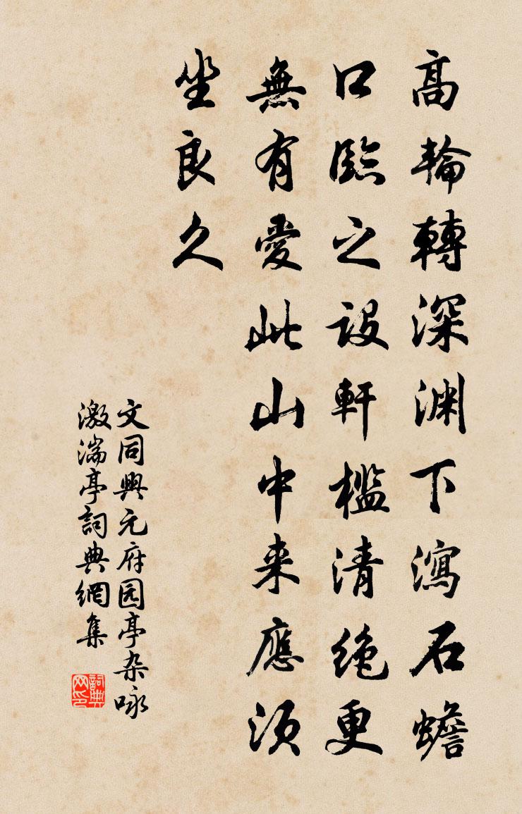 詩詞名句歷史字典書法欣賞書法字典國語詞典說文解字康熙字典古漢語字典標 題 作 者 詩 句 興元府園亭雜詠激湍亭作者:文同 朝代:宋代興元府園亭雜詠激湍亭原文高輪轉深淵,下瀉石蟾口。臨之設軒檻,清絕更無有。愛此山中來,應須坐良久。詩詞問答問:興元府園亭雜詠激湍亭的作者是誰?答:文同問:興元府園亭雜詠激湍亭寫於哪個朝代?答:宋代文同興元府園亭雜詠激湍亭書法欣賞興元府園亭雜詠激湍亭書法作品詩詞推薦立秋後四日雨陸游〔宋代〕天為新秋故作涼,海風吹雨入虛堂。涼生庭樹陰陰綠,潤襲篝衣浥浥香。杯泛鵝兒供小啜,碓舂雲子喜新嘗。一年泛舟松江白玉蟾〔宋代〕白酒黃封冽以妍,鱸魚買得一雙鮮。舟行無浪無風夜,人在非晴非雨天。醉熟不知天遠近,夢回但見月嬋娟。垂虹宜謙山主赴鄞城命釋重顯〔宋代〕休向千峰過好時,白雲高臥趣還卑。塗中無限未歸客,不待相依更待誰。和放翁社日四首社日雨方岳〔宋代〕今茲淫春霖,曾不避甲子。荷鋤做秧田,歲欠三寸水。社戊占豐登,不以此故已。徑起觳觫公,鳴蓑共於耜。有感二首劉克莊〔宋代〕夷齊怨惡本不念,堯桀是非今亦忘。不知伍子嗔何甚,魄化為潮日夜忙。射陽湖范仲淹〔宋代〕渺渺指平湖,煙波極望初。縱橫皆釣者,何處得嘉魚。立春前一日雪方岳〔宋代〕入冬妍暖幾兼旬,明日銀幡歲又新。絕意六花無復臘,等閒一尺不勝春。老在咳唾何難事,瘦地耕鋤亦幸民。徑就送崇鏡上人歸剡因寄聲高九萬孫季蕃林表民〔宋代〕神剜天劃成岩洞,橫亘危梁接應真。垂下玉虹三百丈,雪花飛濺一山春。送向兄荊父帥維揚二首曾協〔宋代〕寵數頻煩色愈溫,耐官丞相剋家孫。川原迤邐提封闊,旌纛森嚴上將尊。心識古人風節似,望知前輩典刑存。春風余處恭少師左相郇公輓辭三首其楊萬里〔宋代〕天下非無士,胸中自有人。如何初拜相,首薦一遺民。恩我丘山小,懷公骨肉親。白頭哭知已,東望獨傷神。伯父《送先人下第歸蜀》詩云︰人稀野店休安蘇軾〔宋代〕萬里卻來日,一庵仍獨居。應笑謀生拙,團團如磨驢。偈頌一百六十首釋宗杲〔宋代〕元宵佳節同歡樂,處處感然無盡燈。火光爍破勝熱面,夜神忽患冷頭疼。挽京口使君豐郎中十首劉宰〔宋代〕先帝龍飛第一春,銀袍鵠立對嚴宸。當時舊侶能多少,又向風前哭此人。驀山溪蔡伸〔宋代〕晝雲今旦,雪霽嚴凝候。玉輦想迴鑾,正花覆、千官錦繡。周南留滯,清夢繞觚稜,心耿耿,路迢迢,此際空回首謁叢霄館張鎡〔宋代〕奉真祠宇並丹房,露下層壇夜未央。玉繡球明依砌樹,翠鬘雲轉罨爐香。何心輕舉氛塵外,但願閒居歲月長。卻上修養劉叉〔唐代〕損神終日談虛空,不必歸命於胎中。我神不西亦不東,煙收雲散何濛濛。嘗令體如微微風,綿綿不斷道自沖。世人武陵春晁端禮〔宋代〕湖上風光寒食近,準擬醉花枝。不忍東風爛熳時。紅淚濕胭脂。情知今後游從少,鸞鏡懶重窺。金鳳銜花舊繡衣。題劉道原墓次剛直亭楊萬里〔宋代〕山南山北蔚松楸,四海千年仰二劉。迂叟饋縑寧凍死,伯夷種粟幾時秋。平生鐵作三尺喙,土苴人間萬戶侯。廬阜天衣寺高翥〔宋代〕萬壑千岩非浪聞,十峰雙澗不須論。袈裟旋化空王服,宮殿曾招帝子魂。山向馬頭回禹穴,溪分燕尾入雲門。秋行郭氏山林十六詠傾月陸游〔宋代〕種梧待鳳雛,此計乃可笑。不如看月墮,與子舒清嘯。名句推薦東家頭白雙女兒,為解挑紋嫁不得。元稹《織婦詞》 念故人,千里至此共明月。寇準《踏莎行·寒草煙光闊》 千尺陰崖塵不到,惟有層冰積雪。辛棄疾《賀新郎·用前韻送杜叔高》 思婦高樓上,當窗應未眠。徐陵《關山月》 樂者,所以道樂也,金石絲竹,所以道德也;樂行而民鄉方矣。荀子《荀子·樂論》 夫人雖有性質美而心辯知,必將求賢師而事之荀子《荀子·性惡》 造化鍾神秀,陰陽割昏曉。杜甫《望岳》 遺民忍死望恢復,幾處今宵垂淚痕。陸游《關山月》 東風有恨致玄都,吹破枝頭玉,夜月梨花也相妒。周文質《小桃紅·詠桃》 日月照之何不及此?惟有北風號怒天上來。李白《北風行》