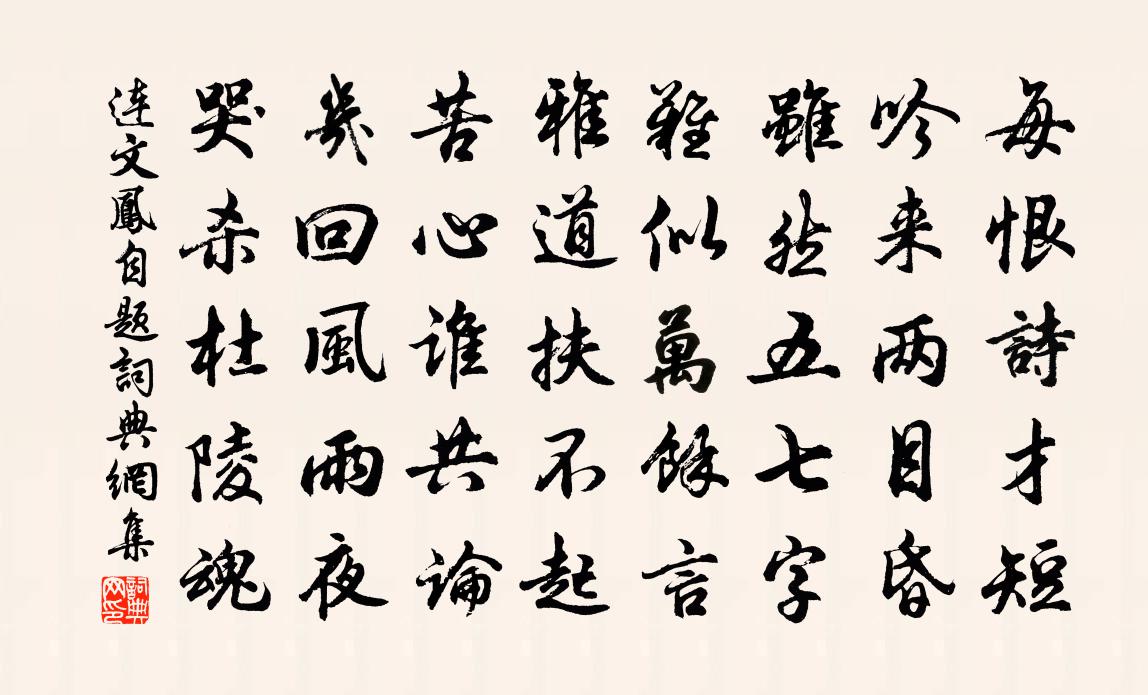 詩詞名句歷史字典書法欣賞書法字典國語詞典說文解字康熙字典古漢語字典標 題 作 者 詩 句 自題作者:連文鳳 朝代:宋代自題原文每恨詩才短,吟來兩目昏。雖然五七字,難似萬餘言。雅道扶不起,苦心誰共論。幾迴風雨夜,哭殺杜陵魂。詩詞問答問:自題的作者是誰?答:連文鳳問:自題寫於哪個朝代?答:宋代連文鳳自題書法欣賞自題書法作品詩詞推薦和張尹憶東籬菊李端〔唐代〕傳書報劉尹,何事憶陶家。若為籬邊菊,山中有此花。題花光梅十首絕後再蘇王柏〔宋代〕深山大澤老龍僵,不染樵人斧上霜。月魄存存枯槁里,忽然枝上弄精光。小山趙蕃〔宋代〕昔人評畫圖,咫尺論萬里。公家一拳石,意趣端如此。挽何無適王柏〔宋代〕二五之英,清通瑩徹。有鍾於躬,非賢則哲。烏乎無適,自幼卓絕。奴僕選騷,銓衡莊列。鞭霆走電,不可追籋。雙調 湘君阿魯威〔元代〕問湘君何處翱遊,怎弭節江皋,江水東流。薜荔芙蓉,涔陽極浦,杜若芳洲。駕飛龍兮蘭旌蕙綢,君不行兮河故夷呈陸嚴州二首趙蕃〔宋代〕一代詩盟孰主張,試探源委見深長。家聲甫里歸嚴瀨,句法茶山出豫章。千里寸心長炯炯,十年兩鬢漫蒼蒼。扁舟上左馮陳使君魏野〔宋代〕祖德相門闌,分符眾比難。憂民如有病,見客似無官。地鎮三秦重,衙當二華寒。道心經仗鉞,詩性鄙登壇。佐幕書幾試筆陸游〔宋代〕鬢毛蕭颯齒牙疏,九十侵尋八十餘。屋小苦寒猶省火,窗明新霽倍添書。解梁已報偏師入,上谷方看大盜除。藥笈林貴文買牡丹見贈至彭村偶題辛棄疾〔宋代〕寶刀和雨剪流霞,送到彭村刺史家。聞道名園春已過,千金還買暨家花。小松齊己〔唐代〕發地才過膝,蟠根已有靈。嚴霜百草白,深院一林青。後夜蕭騷動,空階蟋蟀聽。誰於千歲外,吟繞老龍形。幽趣十二首鄭剛中〔宋代〕幽趣無人會,雖然亦有為。晚涼尋薜荔,細雨架酴醿。掃屋除蛛網,添花助蜜脾。黃昏方隱几,酒興又催詩。太上皇后合端午帖子詞汪應辰〔宋代〕自然長壽又康寧,德合無疆萬物亨。聖主愛新思盡美,更羞仙朮助延生。孟子陳仲子陳普〔宋代〕民彝萬古在乾坤,人道寧同鹿作奔。縱使披毛兼辟穀,何能一日立人間。僧舍小山三首晁沖之〔宋代〕爛石有佳色,禪房疊更幽,九疑峰不斷,十字水長流。枕簟日逃署,軒窗時臥遊。吾衰更何往,只此對湯休。偶書黃庚〔宋代〕老眼看書暗,桑榆景漸催。文章身後貴,懷抱酒邊開。燈火夢猶在,功名心已灰。客來休問字,且覆掌中杯。致爽軒劉焞〔宋代〕團團竹色繞郊居,勾引清風百畝余。憶昔敲門蘇內翰,而今下馬范中書。好時光·寶髻偏宜宮樣李隆基〔唐代〕寶髻偏宜宮樣,蓮臉嫩,體紅香。眉黛不須張敞畫,天教入鬢長。莫倚傾國貌,嫁取個,有情郎。彼此當年少,莫過永濟橋二首邵雍〔宋代〕一水一溪門,溪門雲復屯。珍禽轉喬木,幽鹿走荒榛。雨腳拖平地,稻畦扶遠村。高城半頹缺,興廢事休論。次韻胡元龍攜詩相訪王炎〔宋代〕杜門度永日,蒼苔生柳陰。欹枕喚黃妳,頹然厭披吟。剝啄來者誰,一笑逢知心。試歸與婦謀,無酒堪共斟。解頤天衣故寺宗瑩〔宋代〕園廟深關春寂寂,雨杉風檜翠蕭蕭。山中舊事無人說,碎疊唐碑補石橋。名句推薦青溪水,流得到紅橋。張景祁《小重山·幾點疏雅謄柳條》 子治世之能臣,亂世之奸雄也。羅貫中《三國演義·第一回》 猶有遺簪,不展秋心,能卷幾多炎熱。張炎《疏影·詠荷葉》 對瀟瀟暮雨灑江天,一番洗清秋。柳永《八聲甘州·對瀟瀟暮雨灑江天》 眉睫才交,夢裡便不能張主;眼光落地,泉下又安得分明。陳繼儒《小窗幽記·集醒篇》 稚子金盆脫曉冰,彩絲穿取當銀錚。楊萬里《稚子弄冰》 半盞屠蘇猶未舉,燈前小草寫桃符。陸游《除夜雪》 大漠沙如雪,燕山月似鉤。李賀《馬詩二十三首·其五》 楚江湄,湘娥乍見,無言灑清淚周密《繡鸞鳳花犯·賦水仙》 待浮花、浪蕊都盡,伴君幽獨。蘇軾《賀新郎·夏景》