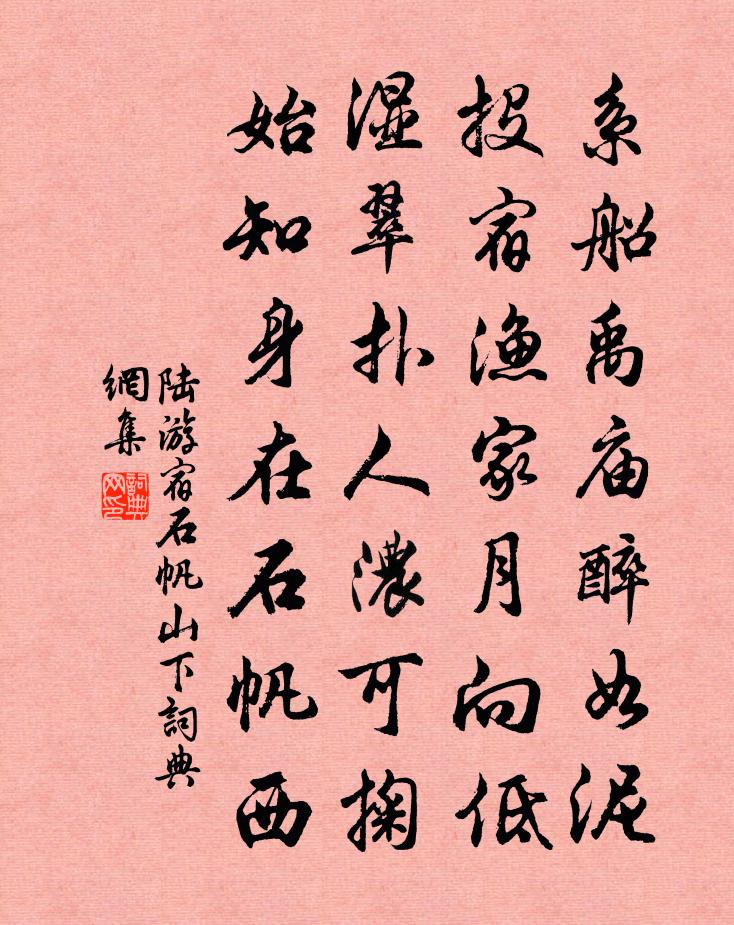 繫船禹廟醉如泥,投宿漁家月向低。濕翠撲人濃可掬,始知身在石帆西。