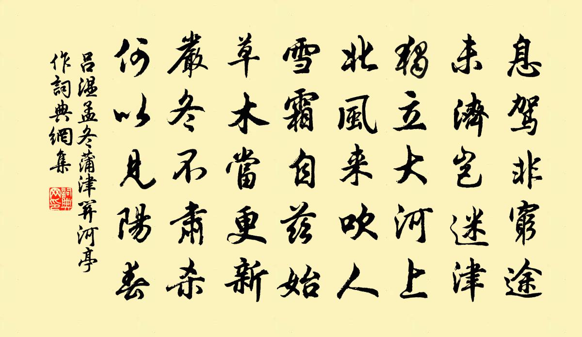 詩詞名句歷史字典書法欣賞書法字典國語詞典說文解字康熙字典古漢語字典標 題 作 者 詩 句 孟冬蒲津關河亭作作者:呂溫 朝代:唐代孟冬蒲津關河亭作原文息駕非窮途,未濟豈迷津。獨立大河上,北風來吹人。雪霜自茲始,草木當更新。嚴冬不肅殺,何以見陽春。詩詞問答問:孟冬蒲津關河亭作的作者是誰?答:呂溫問:孟冬蒲津關河亭作寫於哪個朝代?答:唐代問:孟冬蒲津關河亭作是什麼體裁?答:五律呂溫孟冬蒲津關河亭作書法欣賞孟冬蒲津關河亭作書法作品注釋全唐詩:卷371-3詩詞推薦靈竹黃庶〔宋代〕綠陰清韻竹蕭然,歷歷當年泣淚痕。千古舜妃湘水底,必應憔悴有慚魂。贈嗣直弟頌十首黃庭堅〔宋代〕正觀心地時,絲髮亦無有。卻來觀世間,冬後數九九。失調名秦湛〔宋代〕藕葉清香勝花氣。清音亭憩暑徐沖淵〔宋代〕水落石澗鳴,中含太古音。安得微妙人,寫入朱弦琴。六月天不雨,赤日雲無陰。道人憩其側,脫巾臥青林。好風送真州吳處厚使君王安石〔宋代〕江上齋船駐彩橈,鳴笳應滿綠楊橋。久為漢吏知文法,當使淮人服教條。拱木延陵瞻故國,叢祠瓜步認前朝。登臨春日七首呂祖謙〔宋代〕春波無力未勝鷗,夾岸山光翠欲流。若使畫成驚顧陸,更教吟出壓曹劉。答黃藪富道王令〔宋代〕角角適時足,力走猶或遲。從而不逮人,不若坐視之。而予始用此,已無先人思。間自念斯世,固亦未易為。以其百字令 次韻答毗陵蔣公冕見寄韓奕〔元代〕問余何事,未中年、已覺心情歡少。對青鏡、頻傷往事,白髮鬢邊生早。水上題紅,花間拾翠,到如今休了。年年試新服裁製初成三首薛濤〔唐代〕紫陽宮裡賜紅綃,仙霧朦朧隔海遙。霜兔毳寒冰繭淨,嫦娥笑指織星橋。九氣分為九色霞,五靈仙馭五雲車。春風重九陳宓〔宋代〕長年佳節近重陽,到骨深恩一味涼。鳳尾有心堪悅目,雞頭當谷可充腸。凌雲穿月開丹桂,映日排空數拒霜。莫與次韻梓上人釋紹嵩〔宋代〕一身無定處,誰見寂寥心。始為江山靜,徒雲寒暑侵。少孤心易感,漂泊病難任。未遂長棲此,孤懷自不禁。秋思洪咨夔〔宋代〕一曲玉連瑣,十分金屈巵。故新相代謝,底用為秋悲。送姚評事李頻〔唐代〕儒服從戎去,須知勝事全。使君開幕日,天子偃戈年。風雨依嵩嶺,桑麻接楚田。新詩隨過客,旋滿洛陽傳。奉和魯望漁具十五詠。漁梁皮日休〔唐代〕波際插翠筠,離離似清籞。游鱗到溪口,入此無逃所。斜臨楊柳津,靜下鸕鶿侶。編此欲何之,終焉富春渚。贊三十六祖頌釋印肅〔宋代〕十方諸佛入其中,十波羅蜜一光同。十世古今無間隔,十身千億法身通。解剡回家過陳公嶺陳著〔宋代〕漫仕當閒游,歸程更自留。嶺高雲送腳,路險石垂頭。家近聽鄉語,山分認水流。溪橋聊小憩,雙鷺去悠悠。浙東罷府西歸酬別張廣文皮先輩陸秀才李縠〔唐代〕豈有頭風筆下痊,浪成蠻語向初筵。蘭亭舊趾雖曾見,柯笛遺音更不傳。照曜文星吳分野,留連花月晉名賢。相逢將游湘水尋句溪詩謝朓〔南北朝〕既從陵陽釣。掛鱗驂亦螭。方尋桂水源。謁帝蒼山箜。辰哉且未會。乘景弄清漪。瑟汩瀉長淀。潺湲赴兩岐。輕苹郡侯坐上觀琉璃瓶中游魚徐夤〔唐代〕寶器一泓銀漢水,錦鱗才動即先知。似涵明月波寧隔,欲上輕冰律未移。薄霧罩來分咫尺,碧綃籠處較毫釐。文翁挽季通判王之望〔宋代〕六藝潛心老益尊,此邦耆舊眾推賢。高文早出諸儒右,清節宜書獨行篇。白首可憐才半剌,朱衣猶得貴重泉。佳城名句推薦成人不自在,自在不成人。曹雪芹《紅樓夢·第八十二回》 無情燕子,怕春寒、輕失花期。晁沖之《漢宮春·梅》 良賈深藏若虛,君子盛德容貌若愚。司馬遷《史記·七十列傳·老子韓非列傳》 料峭春寒中酒,交加曉夢啼鶯。吳文英《風入松·聽風聽雨過清明》 佳期悵何許,淚下如流霰謝朓《晚登三山還望京邑》 紙上得來終覺淺,絕知此事要躬行。陸游《冬夜讀書示子聿》 日暮東風怨啼鳥,落花猶似墜樓人。杜牧《金谷園》 國危主憂,說者成伍,無益於安危也。商鞅《商君書·農戰》 酒賤常愁客少,月明多被雲妨。蘇軾《西江月·世事一場大夢》 不應取法。不應取非法。鳩摩羅什譯《金剛經·正信希有》