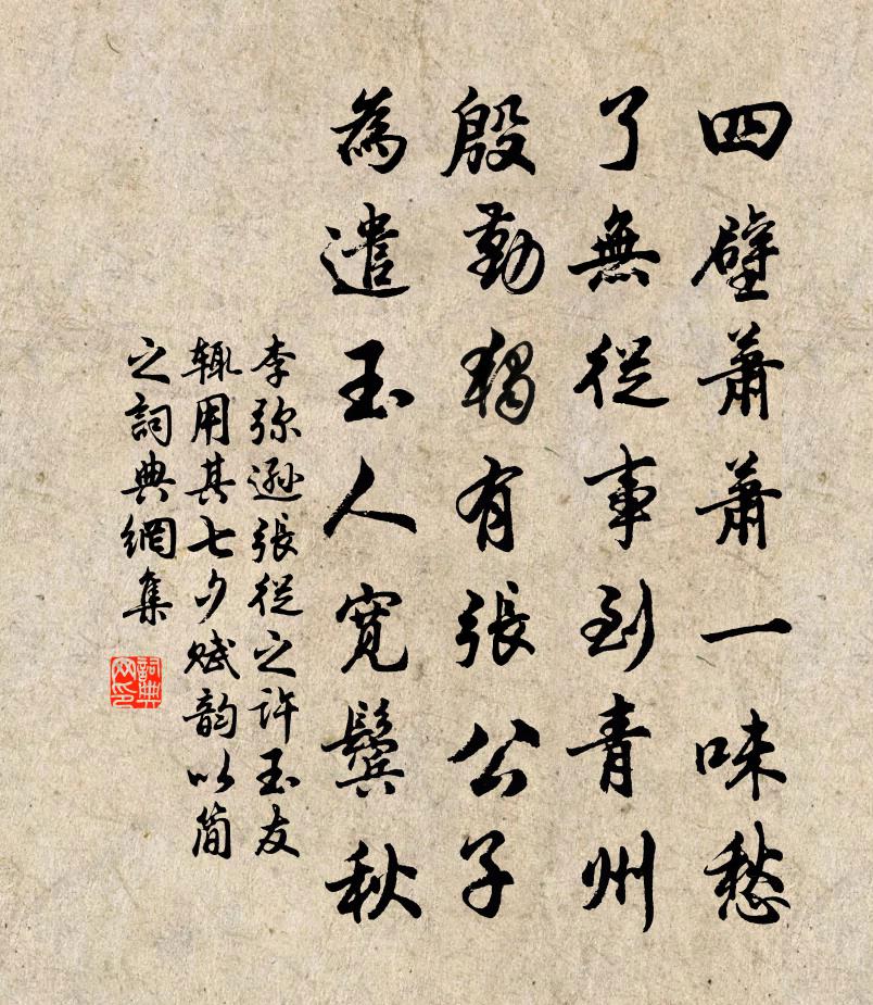 詩詞名句歷史字典書法欣賞書法字典國語詞典說文解字康熙字典古漢語字典標 題 作 者 詩 句 張從之許玉友輒用其七夕賦韻以簡之作者:李彌遜 朝代:宋代原文四壁蕭蕭一味愁,了無從事到青州。殷勤獨有張公子,為遣玉人寬鬢秋。詩詞問答問:《張從之許玉友輒用其七夕賦韻以簡之》的作者是誰?答:李彌遜問:該詩寫於哪個朝代?答:宋代書法欣賞張從之許玉友輒用其七夕賦韻以簡之書法作品詩詞推薦白雲獅子峰望羅浮李昴英〔宋代〕不到羅浮瞥六年,後期幾誤鐵橋仙。遠雲不隔山真面,西麓原同第七天。記正月二十五日西湖之游十五首方回〔宋代〕業已通名敢退無,小為性命忍須臾。十年朝士知何限,不許游湖許見湖。賦韋軒劉黻〔宋代〕人性之偏懼不知,西門為此佩柔皮。報巫依舊傷於仇,涵養工夫熟者誰。慶元冬再到盱眙四首陳造〔宋代〕平日朝京此問途,如今一水剪坤輿。客來羨殺閒鷗鷺,北煮南飛得自如。西湖陶弼〔宋代〕寧越佳山水,西湖似浙城。桂多天竺子,潮欠海門聲。路向林梢轉,天隨野色橫。從茲棲泊者,無復渡江情。明日登後山用韻方岳〔宋代〕雪林籬落行清曉,畢竟山人太耐寒。酒聖坐來春泛泛,梅仙飛去玉珊珊。草塘喚就荷葭塢,竹徑生成花葯欄。詩敵好事近(慶祝司理)劉仙倫〔宋代〕春事恰平分,南極夜來星瑞。聞道都曹初度,擁萬紅千翠。長才傑出應時須,一郡賴綱紀。看即詔還入覲,上鴛行又登南樓陳杰〔宋代〕縹渺層巒出畫闌,半空長鎖白雲閒。一弓斜折蜀江水,八字平分漢渚山。眼入中原鴻去迥,手摩華表鶴飛還。好天偈頌二十九首釋雲〔宋代〕參禪人,多逐妄,不用起模仍畫樣。春風吹綻桃李花,淡煙疏雨籠青嶂。留題安州朱氏草堂歐陽修〔宋代〕俯檻臨流蕙徑深,平泉花木繞陰森。蛙鳴鼓吹春喧耳,草暖池塘夢費吟。賭墅乞甥賓對弈,驚鴻送目手揮琴。嗟予懷歸繆鑒〔宋代〕折柳期春春便歸,叮嚀好與護柴扉。東風怪我歸鞍晚,調撥楊花到處飛。倦客孫嵩〔宋代〕倦客江湖返,書生畎畝思。古來惟即墨,世上幾仇池。八表煙霾隔,三春草木衰。交遊訊息斷,存沒杳難知。除日/除夜朱淑真〔宋代〕爆竹聲中臘已殘,紺酥酒暖燭花寒。朦朧曉色籠春色,便覺風光不一般。養生陸游〔宋代〕西遊曾受養生書,晚愛煙波結草廬。兩眥神光穿夜戶,一頭胎髮入晨梳。邀雲作伴遠忘返,與鶴分窠寬有餘。占盡石峽山茶盛開方逢辰〔宋代〕冰崖赤骨物俱老,火樹生陽我不孤。鐵葉幾經寒暑戰,丹心不為雪霜枯。托根峽里老居士,加號花中烈丈夫。顏色句佚名〔唐代〕伴行惟瘦鶴,尋步入深雲。(《贈廖融》,見《紀事》)菜羹二首姜特立〔宋代〕擬續冰壺傳,嘗賡玉糝詩。蒸豚貴公子,卻莫遣渠知。曉登快閣趙蕃〔宋代〕庭中但覺木搖落,江上始知秋氣高。不待月明飛鏡夜,此時自可數秋毫。去春勸耕雲際移植海棠曾留小詩今歲困於多事吳芾〔宋代〕去年勸相到雲根,滿樹花光欲照人。料得今年花更好,無端風雨阻行春。渡漢江(去年春,奉使東川,經嶓冢山下)元稹〔唐代〕嶓冢去年尋漾水,襄陽今日渡江濆。山遙遠樹才成點,浦靜沉碑欲辨文。萬里朝宗誠可羨,百川流入渺難分。鯢鯨名句推薦靡靡秋已夕,淒淒風露交。陶淵明《己酉歲九月九日》 沙上並禽池上暝。雲破月來花弄影。張先《天仙子·水調數聲持酒聽》 少年辛苦終身事,莫向光陰惰寸功。杜荀鶴《題弟侄書堂》 身後有餘忘縮手,眼前無路想回頭。曹雪芹《紅樓夢·第二回》 上善若水,水善利萬物而不爭。處眾人之所惡,故幾於道。老子《老子·道經·第八章》 錦江春色來天地,玉壘浮雲變古今。杜甫《登樓》 我行殊未已,何日復歸來。宋之問《題大庾嶺北驛》 五馬如飛龍,青絲結金絡。李白《陌上桑》 琅琅新雨洗湖天,小景六橋邊。張可久《風入松·九日》 人不通今古,馬牛如襟裾。佚名《增廣賢文·上集》