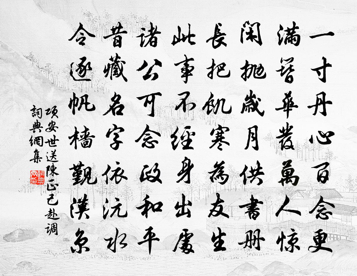 詩詞名句歷史字典書法欣賞書法字典國語詞典說文解字康熙字典古漢語字典標 題 作 者 詩 句 送陳正己赴調作者:項安世 朝代:宋代送陳正己赴調原文一寸丹心百念更,滿簪華發萬人驚。閒拋歲月供書冊,長把饑寒為友生。此事不經身出處,諸公可念政和平。昔藏名字依沅水,令逐帆檣覲漢京。詩詞問答問:送陳正己赴調的作者是誰?答:項安世問:送陳正己赴調寫於哪個朝代?答:宋代項安世送陳正己赴調書法欣賞送陳正己赴調書法作品詩詞推薦恩義吟邵雍〔宋代〕恩深者親,義重者君。恩義兩得,始謂之人。摸魚兒(湖上)杜旟〔宋代〕放扁舟、萬山環處,平鋪碧浪千頃。仙人憐我征塵久,借與夢遊清枕。風乍靜。望兩岸群峰,倒浸玻璃影。樓台相狂吟劉克莊〔宋代〕兩輪屋角走如棱,爭奈樗翁老病何。富貴時來年少去,神仙者少死人多。形羸全賴兒扶掖,詩退猶須友切磋。莫嗟謾興陶夢桂〔宋代〕吟情常得閒情助,和氣多為直氣侵。易說難行天下事,未為先懶老來心。公然排闥清風入,悄地窺窗好月尋。風月頌古五首釋道行〔宋代〕生死自憐同室穴,因何中路關山。一朝忽得親兒證,趯踏方知蓋覆次韻柳郎中二詠蘇頌〔宋代〕百幅敲冰密屬連,寢甘誰復誚便便。心間好隱忘言幾,官冷宜鋪坐客氈。烏布任寬忘道韻,絳紗徒侈怯霜天。休嗟題談氏濯纓亭胡宏〔宋代〕茶陵水似滄浪情,我行征驂登小亭。孔聖去矣不可見,野人有歌誰復聽。孟子能推孔聖心,寥寥斯意有誰尋。中原過蜀道山張說〔唐代〕我行春三月,山中百花開。披林入峭蒨,攀登陟崔嵬。白雲半峰起,清江出峽來。誰知高深意,緬邈心幽哉。答翁愈賦卷宋祁〔宋代〕登高大夫事,感物古詩流。韻變齊風緩,辭凌漢氣遒。恨非雌霓賞,惟祝洞簫求。病客無盤玉,琅玕未易酬。謝尤延之提舉郎中自山間惠訪長句楊萬里〔宋代〕淮南使者郎官星,瑞光夜燭荊溪清。平生龐公不入城,令我折卻屐齒迎。交遊雲散別如雨,同舍諸郎半為土。二老和知宗喜雨陽枋〔宋代〕江海人推百穀王,可無膏澤惠炎方。五龍行水蘇將槁,萬頃秧田喜浸昌。不用飲冰被祛內,急須沽酒做新涼。卻愁句鄭會〔宋代〕君未知人窮相事。山隱居士贊釋大觀〔宋代〕僧之形,人之英。何所作兮畦衣常披,何所說兮玉塵常橫。世情悠悠兮若秋雲之淡,胸次了了兮懸秋月之明。其稟晨起陸游〔宋代〕小疾蠲除盡,閒愁墾闢空。時光雞唱里,生計碓聲中。戒婢儲猿果,看奴織鶴籠。老人新得道,處處見神通。題李昭訓山水牟融〔唐代〕卜築藏修地自偏,尊前詩酒集群賢。半岩松暝時藏鶴,一枕秋聲夜聽泉。風月謾勞酬逸興,漁樵隨處度流年。南州和李司錄喜雨詩庾信〔南北朝〕純陽實久亢。雲漢乃昭回。臨河沉璧玉。夾道畫龍媒。離光初繞電。震氣始乘雷。海童還碣石。神女向陽台。雲逐偈頌七十六首釋師觀〔宋代〕暑退涼生,風高露冷。葉落歸根,藏頭露影。趙州吃茶,雲門故餅。如何是道,明眼落井。歸故園述懷呈唐伯憲姜特立〔宋代〕三徑元須近,吾廬亦庶幾。稍晴頻縱步,遇雨不愁歸。夕暗兒篝火,晨飢婦餉炊。棧羊遠可炙,櫪馬不須鞿。引路送王誕渤海使赴李太守行營韓翃〔唐代〕少年結客散黃金,中歲連兵掃綠林。渤海名王曾折首,漢家諸將盡傾心。行人去指徐州近,飲馬回看泗水深。喜見題老悟畫卷四首裘萬頃〔宋代〕中興以前作山水,只說李成與郭熙。誰知淳熙有此老,健筆不減巨然師。名句推薦松下茅亭五月涼,汀沙雲樹晚蒼蒼。戴叔倫《題稚川山水》 屋上春鳩鳴,村邊杏花白。王維《春中田園作》 浮雲一別後,流水十年間。韋應物《淮上喜會梁川故人 / 淮上喜會梁州故人》 迢遞路回清野,人語漸無聞,空帶愁歸周邦彥《夜飛鵲·河橋送人處》 今歲早梅開,依舊年時月。張孝祥《卜運算元·雪月最相宜》 兼相愛,交相利。墨子《墨子·15章 兼愛(中)》 聰以知遠,明以察微。司馬遷《史記·五帝本紀》 運籌策帷帳之中,決勝於千里之外。司馬遷《史記·高祖本紀》 鞭撲之子,不從父之教劉向《說苑·雜言》 父之讎,弗與共戴天。兄弟之讎不反兵。交遊之讎不同國。戴聖《禮記·曲禮上》