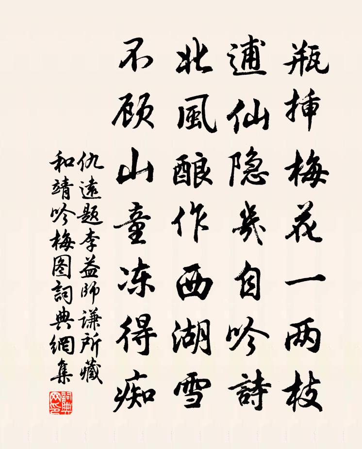 詩詞名句歷史字典書法欣賞書法字典國語詞典說文解字康熙字典古漢語字典標 題 作 者 詩 句 題李益師謙所藏和靖吟梅圖作者:仇遠 朝代:宋代題李益師謙所藏和靖吟梅圖原文瓶插梅花一兩枝,逋仙隱几自吟詩。北風釀作西湖雪,不顧山童凍得痴。詩詞問答問:題李益師謙所藏和靖吟梅圖的作者是誰?答:仇遠問:題李益師謙所藏和靖吟梅圖寫於哪個朝代?答:宋代仇遠題李益師謙所藏和靖吟梅圖書法欣賞題李益師謙所藏和靖吟梅圖書法作品詩詞推薦宮詞王珪〔唐代〕簾搖翡翠金風晚,瓦濕鴛鴦玉露天。秋殿曉開重九宴,內人爭貼菊花鈿。如夢令·纖月黃昏庭院納蘭性德〔清代〕纖月黃昏庭院,語密翻教醉淺。知否那人心?舊恨新歡相半。誰見?誰見?珊枕淚痕紅泫。冬至春不雨元夕後一日雨作邦人甚喜鄭剛中〔宋代〕晴科釀春溫,氣候如濁酒。我雖六塵清,亦若醉一斗。朝來天風雲,高葉聚良久。向晚等甘露,數點斷還有。迤邐寶陀三句釋普濟〔宋代〕寶陀一玄,制臂揎拳。打失鼻孔,蒼天蒼天。詠谷王安石〔宋代〕可憐台上谷,轉目已陰繁。不解詩人意,何為樂彼園。三月六日趙蕃〔宋代〕桐花最晚開已落,春色全歸草滿園。破衲欲捐還未可,炎涼翻覆在朝昏。蜜漬梅花楊萬里〔宋代〕瓮澄雪水釀春寒,蜜點梅花帶露餐。句里略無煙火氣,更教誰上少陵壇。寄題徐郎中鄱陽高居望雲台蘇頌〔宋代〕子牟在江海,心存魏闕下。君居雖遠方,不忘朝廷者。築室負郊郭,虛堂連廣廈。浮梁江湖間,風物最蕭灑。官罷再贈湯仲輝姜特立〔宋代〕肥遁元無悶,躬耕亦自娛。曲肱安陋巷,愛爾亦顏徒。凌丹亭方信孺〔宋代〕風馭來三峽,雲章下九天。名山開窟宅,飛宇納光躔。未見煙霞約,聊將歲月鐫。神遊誰復識,空誦白雲篇。暮秋雜興七首連文鳳〔宋代〕棲棲猶未定,去去復何求。縱有劉伶酒,難消杜甫愁。黑雲天易晚,紅葉樹多秋。哀怨不堪聽,笛聲何處樓。送何端卿帥瀘黃彥平〔宋代〕何侯石友平生事,傅粉風流詎可同。誰使擁旄三峽外,不留持橐五雲中。啼猿此去欺殘月,回雁因來吒便風。亦念寶溪道中釋紹嵩〔宋代〕徑直夫何細,雲山知機重。朱門均白屋,紅葉間青松。野火燒岡草,殘陽下遠峰。傷心繞村落,倦客獨攜筇。金明池·詠寒柳柳如是〔明代〕有悵寒潮,無情殘照,正是蕭蕭南浦。更吹起,霜條孤影,還記得,舊時飛絮。況晚來,煙浪斜陽,見行客,特地金山芷芝二僧攜茗見訪梅堯臣〔宋代〕一游江山上,日日吟不足。雙錫忽來過,衣霜帶初旭。況能持茗具,向此烹新綠。中{左氵右霝}水若飴,北焙花頌古二十五首釋崇岳〔宋代〕出水何如未出水,蓮花荷葉有來田。定光金地遙招手,智者江陵暗點頭。出山逢耿湋盧綸〔唐代〕雲雪離披山萬里,別來曾住最高峰。暫到人間歸不得,長安陌上又相逢。西江月袁易〔元代〕偏是一春憔悴,被人閒賦陽台。扇遮微雨傍牆回。花信餘寒柳外。繡果未成雙荔,打鴉摘盡新梅。暗占胡蝶卻飛來退天童上太守吳學士釋正覺〔宋代〕三椽五合不求余,汩汩營營笑拙疏。妄立是非徒喻馬,樂同彼此解觀魚。洗霜骨出山宜瘦。答響神藏谷應虛。莫涴感昔陸游〔宋代〕曾從征西十萬師,白頭回顧只成悲。雲深駱谷傳烽處,雪密嶓山校獵時。名句推薦日暖桑麻光似潑,風來蒿艾氣如薰。蘇軾《浣溪沙·軟草平莎過雨新》 昨夜醉眠西浦月。今宵獨釣南溪雪。洪适《漁家傲引·子月水寒風又烈》 子用私道者家必亂,臣用私義者國必危。劉向《戰國策·趙二·趙燕後胡服》 若似月輪終皎潔,不辭冰雪為卿熱。納蘭性德《蝶戀花·辛苦最憐天上月》 而今燈漫掛。不是暗塵明月,那時元夜。蔣捷《女冠子·元夕》 肥水東流無盡期。當初不合種相思。姜夔《鷓鴣天·元夕有所夢》 轉眼葵肌初繡,又紅欹欄角。陳維崧《好事近·分手柳花天》 兩岸猿聲啼不住,輕舟已過萬重山李白《早發白帝城/白帝下江陵》 昨夜狂風度,吹折江頭樹李白《長干行二首》 想到他日是那樣下場,則可以發憤矣。王永彬《圍爐夜話·第三六則》