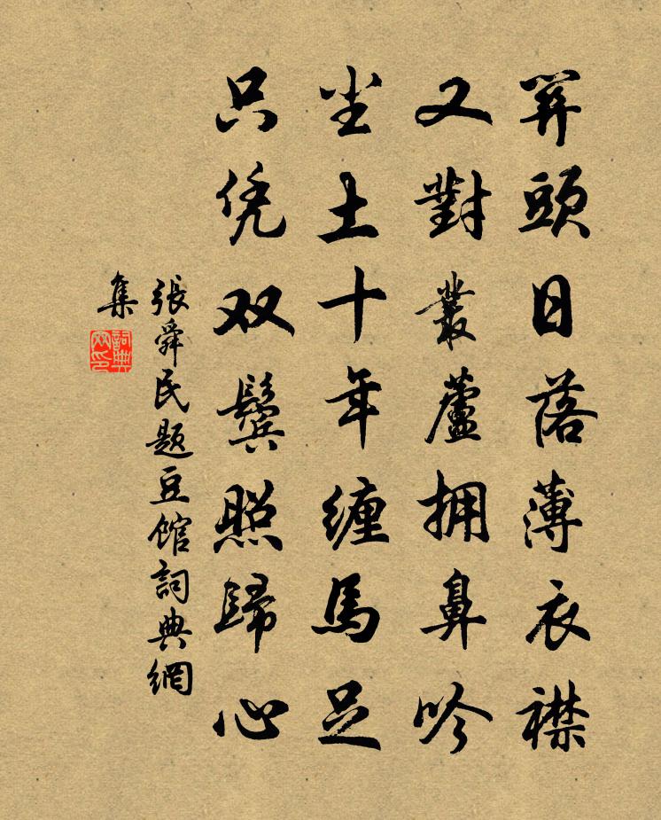 詩詞名句歷史字典書法欣賞書法字典國語詞典說文解字康熙字典古漢語字典標 題 作 者 詩 句 題豆館作者:張舜民 朝代:宋代題豆館原文關頭日落薄衣襟,又對叢蘆擁鼻吟。塵土十年纏馬足,只憑雙鬢照歸心。詩詞問答問:題豆館的作者是誰?答:張舜民問:題豆館寫於哪個朝代?答:宋代張舜民題豆館書法欣賞題豆館書法作品詩詞推薦用雪坡春色韻劉學箕〔宋代〕才出城門興便濃,晴光野色兩俱融。柳方染得三分綠,桃已熏成一半紅。山涌林巒荒寺隱,湖分港汊小舟通。相攜句李白〔唐代〕霜結梅梢玉,陰凝竹乾銀。一線天陳普〔宋代〕天真道妙本無多,只費挨攤與洗磨。不見昭昭端的處,分明全體是如何。頌古八首釋如淨〔宋代〕策起眉毛答問端,親曾見佛不相瞞。至今應供四天下,春在梅梢帶雪寒。次韻答斌老病起獨游東園二首黃庭堅〔宋代〕主人心安樂,花竹有和氣。時從物外賞,自益酒中味。斸枯蟻改穴,掃籜筍迸地。萬籟寂中生,乃知風雨至。游長安諸寺聯句道政坊寶應寺僧房聯句段成式〔唐代〕古畫思匡嶺,上方疑傅岩。蝶閒移忍草,蟬曉揭高杉。 ——段成式香字消芝印,金經發茝函。井壬子六月庚申夜陪魏公詣龍壇強至〔宋代〕上公小隊俯郊關,讀祝焚香拜夜壇。旱魃此時尤肆虐,應龍何處輒圖安。呪辭如律噴孤劍,刲血須明驗一盤。盛夏送武瑴之邠寧喻鳧〔唐代〕戍路少人蹤,邊煙淡復濃。詩寧寫別恨,酒不上離容。燕拂沙河柳,鴉高石窟鍾。悠然一暌阻,山疊虜雲重。句張載〔宋代〕叵要居仁宅,先須入禮門。古態陸龜蒙〔唐代〕古態日漸薄,新妝心更勞。城中皆一尺,非妾髻鬟高。雜詠一百首王通劉克莊〔宋代〕當時三晉地,已有聖人生。不曉河汾氏,為隋策太平。送孔秀才遊河北歐陽修〔宋代〕吾始未識子,但聞楊公賢。及子來叩門,手持贈子篇。賢愚視所與,不待交子言。又文諧律呂,子行潔琅玕。行矣清平樂(與諸君小酌,燭下見花,戲作一首)毛滂〔宋代〕風搖灺燼。吹下 * 。醉倒碧鋪眠碎錦。誰伴香迷酒凝。少年不解孤春。年來減盡春心。猶下繡簾遮定,不教風挽董瀾溪二首王珪〔唐代〕六館知名久,雙溪避地來。交新如舊識,世短惜長才。悵望中年別,飛騰暮景催。蟆陵他日淚,不獨故人哀。小重山王哲〔元代〕堪嘆犢兒堪嘆牛。若還省我語,是同流。性如燈燭命如油。相滋引,明焰出山頭。照破一齊休。前程除險路,沒深寶慈寺白玉蟾〔宋代〕殿古涵煙冷,樓空得月多。鐘聲巡遠岫,塔影臥清波。鷓鴣天(詠梅菊呈撫州葛守)廖行之〔宋代〕九日東籬已泛觴。隴頭猶待返魂香。那知此日花神約,得得同登君子堂。迎臘雪,傲晴霜。西湖風韻接柴桑。壽潭留客趙汝鐩〔宋代〕闊疏方在念,飛蓋忽相過。酒缺鄰堪覓,詩成子自喔。添羹挑野菜,包鮓就池荷。莫屢辭歸去,余樽亦不多。木蘭花慢程垓〔宋代〕倩嬌鶯奼燕,說不盡、此時情。正小院春闌,芳園晝鎖,人去花零。憑高試回望眼,奈遙山遠水隔重雲。誰遣風狂湖飲得天字連文鳳〔宋代〕老來更上百花船,賴有湖光慰眼前。兵後山川仍戀土,壺中日月不行天。間身適意隨鷗鷺,樂事何心問管弦。盡醉名句推薦寄言燕雀莫相啅,自有雲霄萬里高。李白《觀放白鷹二首》 西宮南內多秋草,落葉滿階紅不掃。白居易《長恨歌》 物舍其所長,之其所短,堯亦有所不及矣劉向《戰國策·齊三·孟嘗君有舍人而弗悅》 今春看又過,何日是歸年。杜甫《絕句二首》 翠蛾輕斂意沉吟,沾襟,無人知此心。孫光憲《河傳·花落》 聚散匆匆,此恨年年有。魏夫人《點絳唇·波上清風》 唯願當歌對酒時,月光長照金樽里。李白《把酒問月·故人賈淳令予問之》 今日樓台鼎鼐,明年帶礪山河辛棄疾《西江月·堂上謀臣尊俎》 幸遇三杯酒好,況逢一朵花新。朱敦儒《西江月·世事短如春夢》 同欲者相憎,同憂者相親。劉向《戰國策·中山·犀首立五王》