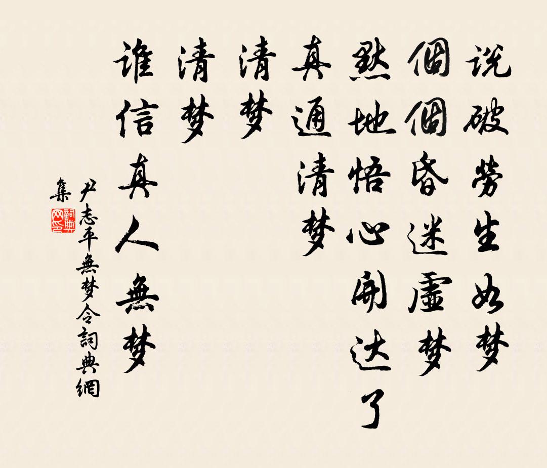 詩詞名句歷史字典書法欣賞書法字典國語詞典說文解字康熙字典古漢語字典標 題 作 者 詩 句 無夢令作者:尹志平 朝代:元代無夢令原文說破勞生如夢。個個昏迷虛夢。默地悟心開,達了真通清夢。清夢。清夢。誰信真人無夢。詩詞問答問:無夢令的作者是誰?答:尹志平問:無夢令寫於哪個朝代?答:元代問:無夢令是什麼體裁?答:詞尹志平無夢令書法欣賞無夢令書法作品詩詞推薦歲暮海上作孟浩然〔唐代〕仲尼既已歿,余亦浮於海。昏見斗柄回,方知歲星改。虛舟任所適,垂釣非有待。為問乘槎人,滄洲復誰在?性老致廬山茶方岳〔宋代〕枉作江南半世人,安知五老不吾嗔。自參茶壑風煙美,略識廬山面目真。澗汲每思佳客共,雲眠誰謂老師仇。秋崖驀山溪李之儀〔宋代〕晚來寒甚,密雪穿庭戶。如在廣寒宮,驚滿目、瑤林瓊樹。佳人乘興,應是得歡多,泛新聲,催金盞,別有留心處偈頌一百二十三首釋崇岳〔宋代〕第七個沒尾巴,不落群隊獨露爪牙。擬心湊泊終難見,須信蓮開火里花。滿江紅劉克莊〔宋代〕落日登樓,誰管領、倦遊狂客。待喚起、滄浪漁父,隔江吹笛。看水看山身尚健,憂晴憂雨頭先白。對暮雲、不見春末蘭溪道中作貫休〔唐代〕山花零落紅與緋,汀煙濛茸江水肥。人擔犁鋤細雨歇,路入桑柘斜陽微。深喜東州雲寇去,不知西狩幾時歸。清平送汪處士還黟歙徐鉉〔唐代〕孤雲野鶴任天真,乘興游梁又適秦。興去卻歸南國去,黃山何謝武陵春。水調歌頭張孝祥〔宋代〕螯禁輟頗牧,熊拭賴龍黃。一時林莽千險,蜂午要驅攘。金版六韜初拭,煙斂山空野回,低草見牛羊。旒纊釋南顧送張子容進士赴舉孟浩然〔唐代〕夕曛山照滅,送客出柴門。惆悵野中別,殷勤岐路言。茂林予偃息,喬木爾飛翻。無使谷風誚,須令友道存。行宿泗間見徐州張天驥次舊韻蘇軾〔宋代〕二年三躡過淮舟,款段還逢馬少游。無事不妨長好飲,著書自要且窮愁。孤松早偃元非病,倦鳥雖還豈是休。更欲萬年歡(慶元聖節)趙以夫〔宋代〕鳳歷開新,正微和乍轉,麗景初曉。五莢蓂舒,光映玉階瑤草。在在東風語笑。慶此日、虹流電繞。鯨波靜,翠涌題汪季路家藏吳彩鸞唐韻後樓鑰〔宋代〕舊說仙人吳彩鸞,日書切韻歸毫端。不應神速有如此,令人至今疑稗官。相傳此事三百載,誰知真跡儼然在。筆精齋中詠懷羊士諤〔唐代〕無心唯有白雲知,閒臥高齋夢蝶時。不覺東風過寒食,雨來萱草出巴籬。詠史上武帝陳普〔宋代〕二十嫖姚風火飛,鑾輿夜夜過焉支。茂陵不費凌雲氣,解見蟠桃著子時。【中呂】喜春來_金妝寶劍藏張弘范〔元代〕金妝寶劍藏龍口,玉帶紅絨掛虎頭,旌旗影里驟驊騮。得志秋,喧滿鳳凰樓。沁園春 飛吟亭,和白玉蟾韻許有壬〔元代〕少日飛騰,湖海奇胸,風雲壯圖。把人間遠道,看為咫尺,眼前實地,認作虛無。釃酒中天,振衣千仞,塵世煙霞百一詩 六應璩〔魏晉〕少壯麵目澤。長大色醜麄。醜麄人所惡。拔白自洗蘇。平生髮完全。變化似浮屠。醉酒巾幘落。禿頂赤如壺。留題南樓二絕歐陽修〔宋代〕偷得青州一歲閒,四時終日面孱顏。須知我是愛山者,無一詩中不說山。送僧鸞歸蜀寧親張喬〔唐代〕歌詩精外學,天子是知音。坐夏宮鍾近,寧親劍閣深。高名徹西國,舊跡寄東林。自此棲禪者,因師滿蜀吟。思歸(一作古離別)趙徵明〔唐代〕為別未幾日,去日如三秋。猶疑望可見,日日上高樓。惟見分手處,白蘋滿芳洲。寸心寧死別,不忍生離憂。名句推薦想牧之、千載尚神遊,空山冷。吳潛《滿江紅·齊山繡春台》 楊柳青青著地垂,楊花漫漫攪天飛。佚名《送別詩》 靜夜沉沉,浮光靄靄,冷浸溶溶月。丘處機《無俗念·靈虛宮梨花詞》 我自中宵成轉側,忍聽湘弦重理。納蘭性德《金縷曲·亡婦忌日有感》 辜負我,悔憐君,告天天不聞。牛嶠《更漏子·春夜闌》 以身教者從,以言教者訟。范曄《後漢書·列傳·第五鍾離宋寒列傳》 驪山四顧,阿房一炬,當時奢侈今何處?張養浩《山坡羊·驪山懷古》 綠衣監使守宮門,一閉上陽多少春。白居易《上陽白髮人》 世事一場大夢,人生幾度秋涼?蘇軾《西江月·世事一場大夢》 白雲初下天山外,浮雲直向五原間。盧思道《從軍行》