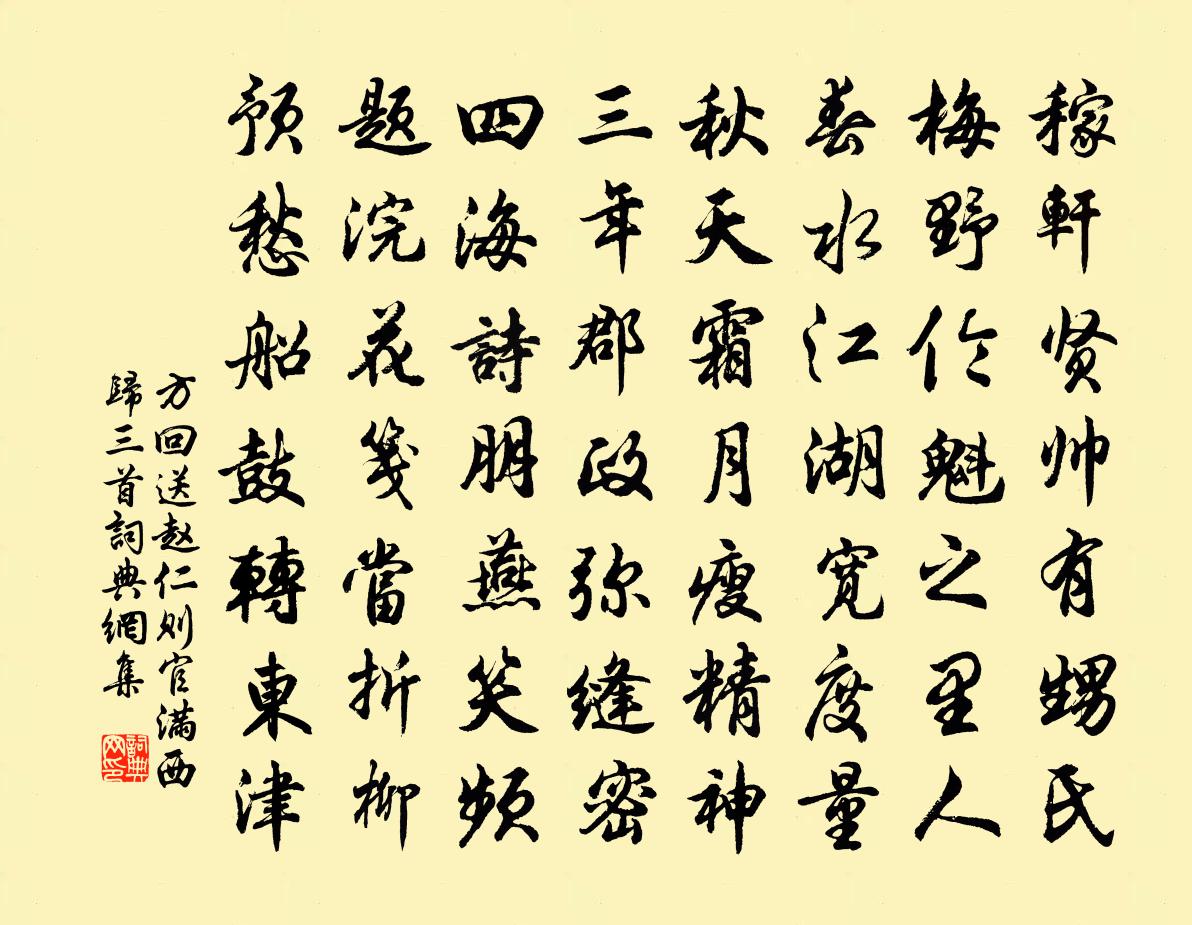 詩詞名句歷史字典書法欣賞書法字典國語詞典說文解字康熙字典古漢語字典標 題 作 者 詩 句 送趙仁則官滿西歸三首作者:方回 朝代:宋代送趙仁則官滿西歸三首原文稼軒賢帥有甥氏,梅野倫魁之里人。春水江湖寬度量,秋天霜月瘦精神。三年郡政彌縫密,四海詩朋燕笑頻。題浣花箋當折柳,預愁船鼓轉東津。詩詞問答問:送趙仁則官滿西歸三首的作者是誰?答:方回問:送趙仁則官滿西歸三首寫於哪個朝代?答:宋代方回送趙仁則官滿西歸三首書法欣賞送趙仁則官滿西歸三首書法作品詩詞推薦頌古八首釋道印〔宋代〕大鵬摶風,蒼龍出海。手抬手搦,日上月下。霜雪嚴凝識歲寒,雙陸盆邊須喝采。野犬行劉宰〔宋代〕野有犬,林有鳥。犬餓得食聲咿鳴,鳥驅不去尾畢逋。田舍無煙人跡疏,我欲言之涕淚俱。村南村北衢路隅,妻喚閨怨姜特立〔宋代〕別恨迢迢千里余,天涯何處覓音書。花間羞見雙雙蝶,水上愁尋六六魚。徇俗張鎡〔宋代〕徇俗非能事,便幽定宿緣。躍泉新作雨,裝樹巧留煙。雀喜頻頻下,蜂知小小穿。疎風奏檐佩,無夢到鈞天。孫君輓辭王安石〔宋代〕喪車上新壟,哀輓轉空山。名與碑長在,魂隨帛暫遷。無兒漫黃卷,有母亦朱顏。俛仰平生事,相看一夢間。端午帖子詞二十首一皇后合五首歐陽修〔宋代〕五色雙絲獻女功,多因荊楚記遺風。聖君照物同天鑒,不用江心百鏈銅。玲瓏四犯(京口寄所思)史達祖〔宋代〕闊甚吳天,頓放得、江南離緒多少。一雨為秋,涼氣小窗先到。輕夢聽徹風蒲,又散入、楚空清曉。問世間、愁在頌證道歌證道歌釋印肅〔宋代〕八解六通心地印,晃晃恢恢非遠近。六通八解者全彰,念彼勞生提後進。次雪林李龏苕溪寄來之韻趙希桐〔宋代〕雲散煙收渺渺秋,蛩聲四壁起新愁。西風萬里乾坤眼,不到斜陽十二樓。病中示彭德器張元乾〔宋代〕老病無堪正坐貧,交遊相見賴情親。從渠造物小兒戲,不礙維摩老子神。三顧九遷成底事,一區二頃合由人。君侯慈谿道中樓鑰〔宋代〕雙櫓真成鵝鸛鳴,客愁厭苦夢魂驚。須臾寖覺耳根熱,一覺醒來天已明。丁評事宅秋夜宴集柳中庸〔唐代〕翠幕卷迴廊,銀燈開後堂。風驚擁砌葉,月冷滿庭霜。綺席人將醉,繁弦夜未央。共憐今促席,誰道客愁長。登封龐國博年三十八自雲欲棄官隱嵩山作吏隱司馬光〔宋代〕懋德負長才,全牛不足剸。纏為百里宰,驥足殊未展。齒髮方盛強,趣尚已高遠。結庵睋二室,志欲巢絕巘。賢人次韻和張仲通見寄三絕句王安石〔宋代〕欹枕狂歌擊唾壺,直將軒冕等錙銖。醉鄉岐路君知否,不似人間足畏塗。西山三首(即岷山,捍阻羌夷,全蜀巨障)杜甫〔唐代〕彝界荒山頂,蕃州積雪邊。築城依白帝,轉粟上青天。蜀將分旗鼓,羌兵助井泉。西戎背和好,殺氣日相纏。辛苦贈懷一上人崔顥〔唐代〕法師東南秀,世實豪家子。削髮十二年,誦經峨眉里。自此照群蒙,卓然為道雄。觀生盡入妄,悟有皆成空。淨體寒食書事晁說之〔宋代〕令宮不易逢寒食,海角風霜剩作寒。杏粥榆羹渾不見,蓬池春色夢中看。贈張君玉於石〔宋代〕閉門十日雨,蕭然抱孤琴。之子從何來,踏雨叩我門。對床話達曉,山窗耿青燈。挽衣不可留,何以贈子行。問子玩止水白居易〔唐代〕動者樂流水,靜者樂止水。利物不如流,鑒形不如止。淒清早霜降,淅瀝微風起。中面紅葉開,四隅綠萍委。廣狹挽林宜人劉克莊〔宋代〕曾究西方學,儒書亦有聞。賜金存日施,遺珥病時分。白首夫同穴,青山子結墳。吾詩非溢美,字字考埋文。名句推薦勝而不驕,敗而不怨。商鞅《商君書·戰法》 清水出芙蓉,天然去雕飾。李白《經亂離後天恩流夜郎憶舊遊書懷贈江夏韋太守良宰》 翠葆參差竹徑成。新荷跳雨淚珠傾。周邦彥《浣沙溪·翠葆參差竹徑成》 面譽者不忠,飾貌者不情戴聖《大戴禮記·文王官人第七十二》 終日望君君不至,舉頭聞鵲喜。馮延巳《謁金門·風乍起》 舉大事,必慎其終始戴聖《禮記·文王世子》 何用慰相思,裁書寄關右。李益《送諸暨王主簿之任》 新年都未有芳華,二月初驚見草芽。韓愈《春雪》 不期修古,不法常可。韓非及後人《韓非子·五蠹》 為地戰者不能成王,為祿仕者不能成政劉向《說苑·君道》