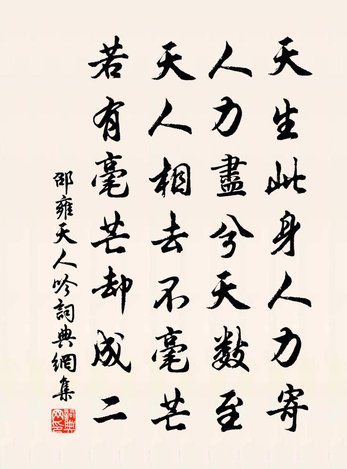 詩詞名句歷史字典書法欣賞書法字典國語詞典說文解字康熙字典古漢語字典標 題 作 者 詩 句 天人吟作者:邵雍 朝代:宋代天人吟原文天生此身人力寄,人力盡兮天數至。天人相去不毫芒,若有毫芒卻成二。詩詞問答問:天人吟的作者是誰?答:邵雍問:天人吟寫於哪個朝代?答:宋代邵雍天人吟書法欣賞天人吟書法作品詩詞推薦自和王周〔唐代〕一片殘陽景,朦朧淡月中。蘭芽紆嫩紫,梨頰抹生紅。琴阮資清格,冠簪養素風。煙霄半知足,吏隱少相同。巫山一段雲 道友堅留住冬聖地,西北有缺,尹志平〔元代〕完備因緣,故述之我有林泉興,君無補缺心。一方聖境理幽深。物外結知音。還到春時圓備。合是全真一會。功成觀章中丞夜按歌舞許渾〔唐代〕夜按雙娃禁曲新,東西簫鼓接雲津。舞衫未換紅鉛濕,歌扇初移翠黛顰。彩檻燭煙光吐日,畫屏香霧暖如春。西樓送鄧慎思歸長沙覲省黃庭堅〔宋代〕鄧侯過我解新鞿,潦倒猶能似舊時。西吧初除折腰尉,南陔常詠采蘭詩。姓名已入飛龍榜,書信新傳喜鵲知。何日立春有懷王琮〔宋代〕十千呼酒醉長安,猶記年時客裹歡。有約南山南畔去,只挑野菜當春盤。秋雨未已客懷不佳夜誦少陵遣興詩至生涯能幾章甫〔宋代〕貧窮束縛人,智慧無所施。文藉紛滿前,不救寒與飢。佳哉江上山,歸隱寧無時。青山若有言,塵土君自羈。頌古一百二十一首釋宗杲〔宋代〕夫子不識字,達磨不會禪。玄沙無此語,切莫妄流傳。小三侄遠持兄嫂之命見訪於荒寒寂寞中將歸二曹勛〔宋代〕不見小阮久,相看情甚溫。肯來成宅相,端可大吾門。暖日長江路,梅花細雨村。真成好兄弟,言謝鄧忘言。唐昌公主院看花司空曙〔唐代〕遺殿空長閉,乘鸞自不回。至今荒草上,寥落舊花開。橫舟亭潘璵〔宋代〕與世浮沉者,中流幾失維。此舟聊寓意,之子免乘危。夜雨蓬為屋,秋風鈞不絲。莫嫌長艤岸,終有濟川時。重陽日訪元秀上人司空圖〔唐代〕紅葉黃花秋景寬,醉吟朝夕在樊川。卻嫌今日登山俗,且共高僧對榻眠。別畫長懷吳寺壁,宜茶偏賞霅溪泉。歸來送王庾宋祁〔宋代〕土甑殘炊黍,津航促扣舷。雲迷孝王苑,星認太丘躔。破瑟弦鵾舞,吟囊錦獸鮮。晚淮他夜月,離思共娟娟。橫吹曲辭洛陽道鄭嚴〔唐代〕客亭門外路東西,多少喧騰事不齊。楊柳惹鞭公子醉,紵麻掩淚魯人迷。通宵塵土飛山月,是處經營夾御堤。頃刻吳江橋王諶〔宋代〕松江期一到,二十二三年。今日身臨此,憑虛骨欲仙。塔連吳苑樹,帆帶洞庭煙。見說鱸魚美,囊無斫鱠錢。浣溪沙晏殊〔宋代〕閬苑瑤颱風露秋。整鬟凝思捧觥籌。欲歸臨彆強遲留。月好謾成孤枕夢,酒闌空得兩眉愁。此時情緒悔風流。上元前雪三絕句蘇轍〔宋代〕臘中平地雪盈尺,嵩隗山田麥尚乾。不管上元燈火夜,飛花處處作春寒。點絳唇佚名〔宋代〕賦雪歸來,綠窗一夜霜風緊。也知春信。訊息南枝近。隱映斜陽,玉暖香成陣。西湖景。繁英有恨。只□□□□。和曼叔憩永惠院韓維〔宋代〕立春月在季,我時如滍皋。驚風揚紅塵,頗有行役勞。自駭茲剎勝,願言憩驂鑣。前對高花繁,後視萬竹交。虛堂愁牛嶺歐陽修〔宋代〕邦人盡說畏愁牛,不獨牛愁我亦愁。終日下山行百轉,卻從山腳望山頭。開元廣寒詞武衍〔宋代〕桂華珠殿水精樓,柘袖籠香乙夜遊。飛下銀橋人不覺,月明三十六宮秋。名句推薦恨蕭蕭、無情風雨,夜來揉損瓊肌。李清照《多麗·詠白菊》 水滿田疇稻葉齊,日光穿樹曉煙低。徐璣《新涼》 試問春歸誰得見?飛燕,來時相遇夕陽中。辛棄疾《定風波·暮春漫興》 洞庭之東江水西,簾旌不動夕陽遲。陳與義《登岳陽樓》 典盡客衣三尺雪,煉精詩句一頭霜。王建《維揚冬末寄幕中二從事》 四牡何時入,吾君憶履聲。張九齡《奉和聖制送尚書燕國公赴朔方》 虛牖傳寒柝,孤燈照絕編。歐陽詹《除夜長安客舍》 當壚秦女,十五語如弦。賀鑄《行路難·縛虎手》 花徑不曾緣客掃,蓬門今始為君開。杜甫《客至》 新竹高於舊竹枝,全憑老乾為扶持。鄭燮《新竹》