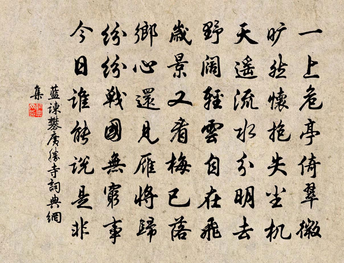 詩詞名句歷史字典書法欣賞書法字典國語詞典說文解字康熙字典古漢語字典標 題 作 者 詩 句 廣勝寺作者:藍諫礬 朝代:宋代廣勝寺原文一上危亭倚翠微,曠然懷抱失塵機。天遙流水分明去,野闊輕雲自在飛。歲景又看梅已落,鄉心還見雁將歸。紛紛戰國無窮事,今日誰能說是非。詩詞問答問:廣勝寺的作者是誰?答:藍諫礬問:廣勝寺寫於哪個朝代?答:宋代藍諫礬廣勝寺書法欣賞廣勝寺書法作品詩詞推薦送李才元學士知廣安軍梅堯臣〔宋代〕楊柳未堪折,柔條時倚風。朱輪過灞上,杜宇響褒中。危棧憎春雨,晴林發曉紅。不須言蜀政,當自學文翁。偈頌一百四十一首釋師範〔宋代〕炎炎六月,飄風灑雪。百丈耳聾,黃蘗吐舌。海闊山高誰與輪,一回飲水一回噎。清逸江范成大〔宋代〕微生本漁樵,長日渺江海。扣舷濯滄浪,尚說天宇隘。朅來車馬路,悒悒佳思敗。黃塵撲眉須,驅逐似償債。羸驂虞美人晏幾道〔宋代〕玉簫吹遍煙花路,小謝經年去。更教誰畫遠山眉,又是陌頭風細、惱人時。時光不解年年好,葉上秋聲早。可憐蝴和友人喜相遇十首李鹹用〔唐代〕為儒自愧已多年,文賦歌詩路不專。肯信披沙難見寶,只憐苫草易成編。燕昭寤寐常求駿,郭隗尋思未是賢。且固橫吹曲辭。長安道聶夷中〔唐代〕此地無駐馬,夜中猶走輪。所以路旁草,少於衣上塵。薌林五十詠桃李蹊楊萬里〔宋代〕白雪堆穠李,紅藍染靚桃。晨妝須蠶看,莫待日華高。晚泊湘江懷故人劉長卿〔唐代〕天涯片雲去,遙指帝鄉憶。惆悵增暮情,瀟湘復秋色。扁舟宿何處,落日羨歸翼。萬里無故人,江鷗不相識。嘗茶次寄越僧靈皎林逋〔宋代〕白雲峰下兩槍新,膩綠長鮮穀雨春。靜試恰如湖上雪,對嘗兼憶剡中人。瓶懸金粉師應有,筯點瓊花我自珍。清話木客李公佐仆〔唐代〕酒盡君莫沾,壺傾我當發。城市多囂塵,還山弄明月。別凌雲士友程公許〔宋代〕三生緣法熟嘉州,乘興俄成十月留。山水縱觀方得趣,交朋莫逆忽同頭。淋淳張飲梅花岸,慘澹分攜杜若洲。恨欠滿庭霜(宴黃仲秉鎮江守)葛郯〔宋代〕紅葉飛時,青山缺處,雲橫秋影斜陽。鳳凰旌節,何事到吾鄉。要見大江東去,寒光靜、水與天長。人爭看,恩袍宮詞王珪〔唐代〕晚來東殿放笙歌,外院池亭得暫過。深炷爐香登月榭,欄乾西角拜姮娥。姑熟雜詠天門山李赤〔唐代〕迥出江水上,雙峰自相對。岸映松色寒,石分浪花碎。參差遠天際,縹緲晴霞外。落日舟去遙,回首沈青靄。陳明卿覓瓦蓋屋姚勉〔宋代〕玉川幸有數間屋,子美怕卷三重茅。為君覓費易陶瓦,夜窗寫詩聽雨敲。出關魏徵〔唐代〕中原初逐鹿,投筆事戎軒。縱然計不就,慷慨志猶存。杖策謁天子,驅馬出關門。請纓系南粵,憑軾下東藩。鬱紆掛金索佚名〔宋代〕無憂慮。孤雲野鶴無拘束。草庵內、閒看金書。窗外林泉,隈山傍水竹。明月清風,堪為伴侶。酴醾黃庭堅〔宋代〕漢宮嬌額半塗黃,入骨濃薰賈女香。日色漸遲風力細,倚欄偷舞白霓裳。方響歌牛殳〔唐代〕樂中何樂偏堪賞,無過夜深聽方響。緩擊急擊曲未終,暴雨飄飄生坐上。鏗鏗鐺鐺寒重重,盤渦蹙派鳴蛟龍。高樓再經太平觀訪沈道士不遇二首陳舜俞〔宋代〕行客尋山去又回,羽人依舊未歸來。洞門不鎖清風入,黃葉無言下翠苔。名句推薦淚濕羅衣脂粉滿。四疊陽關,唱到千千遍。李清照《蝶戀花·淚濕羅衣脂粉滿》 講性命之學者,不可無經濟之才。王永彬《圍爐夜話·第二六則》 一寸相思一寸灰。蘇軾《南鄉子·集句》 日星隱曜,山嶽潛形;范仲淹《岳陽樓記》 致君堯舜上,再使風俗淳。杜甫《奉贈韋左丞丈二十二韻》 山中一夜雨,樹杪百重泉。王維《送梓州李使君》 賢者以其昭昭,使人昭昭;今以其昏昏,使人昭昭。孟子《孟子·盡心章句下·第二十節》 身勞而心安,為之;利少而義多,為之荀子《荀子·修身》 夫人雖有性質美而心辯知,必將求賢師而事之荀子《荀子·性惡》 春日載陽,有鳴倉庚。佚名《七月》