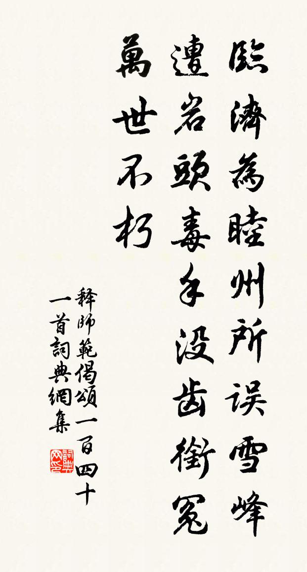 詩詞名句歷史字典書法欣賞書法字典國語詞典說文解字康熙字典古漢語字典標 題 作 者 詩 句 偈頌一百四十一首作者:釋師範 朝代:宋代偈頌一百四十一首原文臨濟為睦州所誤,雪峰遭岩頭毒手。沒齒銜冤,萬世不朽。詩詞問答問:偈頌一百四十一首的作者是誰?答:釋師範問:偈頌一百四十一首寫於哪個朝代?答:宋代釋師範偈頌一百四十一首書法欣賞偈頌一百四十一首書法作品詩詞推薦仲秉再用前韻為梅解嘲復和之張栻〔宋代〕幾年身在水雲間,愈見花邊下語難。猶有故人相慰藉,西山載酒未盟寒。漫歌八曲。故城東元結〔唐代〕漫惜故城東,良田野草生。說向縣大夫,大夫勸我耕。耕者我為先,耕者相次焉。誰愛故城東,今為近郭田。太平興國宮董嗣杲〔宋代〕旌幢龍虎衛,台殿鼓鍾浮。水亂渾疑雨,山深只見秋。九天嚴採訪元老主焚修。得祿安蕭散,前身幾世修。題四祖山榮老月窟戴復古〔宋代〕一室虛生白,中作滿月形。山中三萬戶,玉斧新修成。時人指為月,雲臥亦強名。似月有圓相,不西沉東升。浮雲高宗建炎初祀昊天上帝佚名〔宋代〕[太簇為徽一奏]禮崇官祀,備物芳誠。昭格穹昊,明德惟聲。風馬雲車,肸鄉居歆。申錫地疆,麥我思成。題義門胡氏華林書院陳堯叟〔宋代〕旌闕書亭煥水鄉,四時煙景似滄浪。玉漿寒色連莎砌,金障秋陰覆草堂。田裡從來應遜畔,兒孫遊戲亦成行。吾君和張憲登烏尤山吳泳〔宋代〕子知天分不人尤,豈若紛紛式屢驕。舊見已知霜葉脫,新知才似谷牙焦。枕上偶賦陸游〔宋代〕初夏暑猶薄,紗幮怯夜深。孤螢入窗罅,斜月下牆陰。靜養觀書眼,窮悲濟世心。吾衰亦久矣,徂歲苦駸駸。船中蔬飯楊萬里〔宋代〕食蕨食臂莫食拳,食筍食梢莫食根。何曾萬錢方下箸,先生把菜亦飽去。嶺南風物似江南,筍如束薪蕨作籃。先生嘉禾百詠幽瀾泉張堯同〔宋代〕神女鍾靈處,真堪療渴羌。滿甖秋玉色,一酌灑清涼。中岩十八詠碧筠亭晁公溯〔宋代〕蕭然一叢竹,何當舉似人。不可妄認此,青青為法身。春日黃庚〔宋代〕紫燕評春語畫梁,黃鸝攙囀垂楊。博山煙冷書窗靜,風颭瓶花點硯香。題句容酒肆壁李天子〔宋代〕青裙白面哄挑菜,茅舍竹籬疏見梅。春事隔年無信息,一聲啼鳥喚將來。蒼浪張耒〔宋代〕蒼浪鬢髮一衰翁,何事年來到骨窮。魑魅何常居四裔,自憐放逐尚無功。皇雅十首《西師》六章尹洙〔宋代〕主用西師,岷梁弗賓。匪曰負固,實交晉人。予訓予誓,合我將臣。正厥有罪,無庸傷民。阻雨李處權〔宋代〕小雨妨幽事,徜徉所得多。前期操野艇,亭午出煙蘿。選勝才如許,偷閒肯重過。自憐詩酒涸,無句敵陰何。有叟陸游〔宋代〕有叟鏡湖邊,茆茨 * 椽。憑闌秋萬里,閉戶醉經年。身外浮名小,胸中浩氣全。此生吾自判,造物恐無權。尤尚書輓詩項安世〔宋代〕今歲何遷次,乾坤失巨人。老生啼壞木,後學嘆迷律。四海人才譜,三朝禮樂臣。並將文獻去,誰與覺斯民。遺術士舒邦佐〔宋代〕欲壽莫夸堯丙子,欲貴莫疑雌甲宸。學取燕山人姓竇,自然五桂一靈椿。侄孫榘獻醉鰵以一絕復之陳著〔宋代〕年來只識釜中魚,出海修鱗夢也無。寶鰵帶糟俄入眼,兒童驚動哄寒廚。名句推薦面前的田地要放得寬,使人無不平之嘆;身後的惠澤要流得長,使人有不匱之思。洪應明《菜根譚·概論》 百戰沙場碎鐵衣,城南已合數重圍。李白《從軍行》 我住長江頭,君住長江尾。李之儀《卜運算元·我住長江頭》 高山仰止,景行行止。佚名《車舝》 野梅燒不盡,時見兩三花劉基《古戍》 君子所,其無逸佚名《尚書·周書·無逸》 義人在上,天下必治。墨子《墨子·35章 非命(上)》 取之非易,守之尤艱;智不足弗得,謀有失竟患,死生事也。來俊臣《羅織經·控權卷第四》 過春風十里,盡薺麥青青。姜夔《揚州慢·淮左名都》 中州遺恨,不知今夜幾人愁。辛棄疾《水調歌頭·和馬叔度游月波樓》