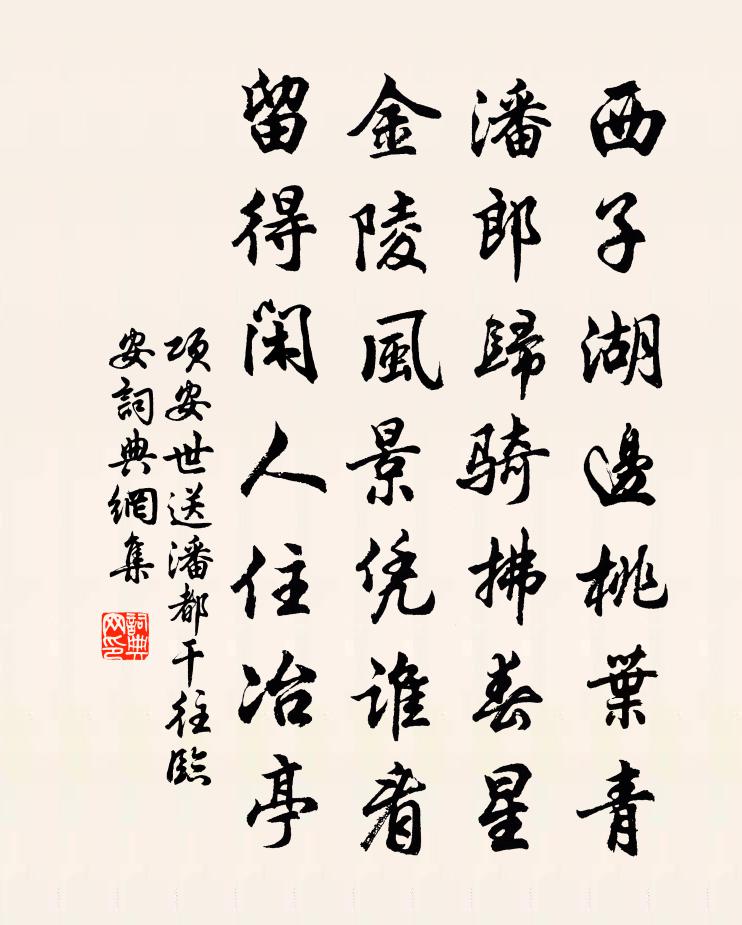 詩詞名句歷史字典書法欣賞書法字典國語詞典說文解字康熙字典古漢語字典標 題 作 者 詩 句 送潘都乾往臨安作者:項安世 朝代:宋代送潘都乾往臨安原文西子湖邊桃葉青,潘郎歸騎拂春星。金陵風景憑誰看,留得閒人住冶亭。詩詞問答問:送潘都乾往臨安的作者是誰?答:項安世問:送潘都乾往臨安寫於哪個朝代?答:宋代項安世送潘都乾往臨安書法欣賞送潘都乾往臨安書法作品詩詞推薦酒邊呈張景純黃庚〔宋代〕蓬萊閣上笑談余,別後思君看畫圖。萍水相逢俱老矣,家山自好盍歸乎。清風一榻莊周蝶,明月扁舟范蠡湖。此是金陵十二釵正冊——賈迎春曹雪芹〔清代〕子孫中山狼,得志便猖狂。金閨花柳質,一載赴黃梁。詠史上審配陳珪陳普〔宋代〕元龍父子二人耳,賢於曹公十萬師。呂布就擒公路死,都在勸回新婦時。遺衣壇宋煜〔宋代〕駕鶴乘鸞歸紫府,仙凡從此不相干。要傳當日飛升事,收拾遺衣為結壇。梅花下小飲楊萬里〔宋代〕今年春在臘前回,怪底空山早見梅。數點有情吹面過,一花無賴背人開。為攜竹葉澆瓊樹,旋折冰葩浸玉杯。近節北苑蘇泂〔宋代〕北苑心無壯,南窗眼費明。病因杯酒見,花值客愁生。落落知誰合,紛紛詎不情。未成幽處宅,且逐眾人行。雍熙享先農六首佚名〔宋代〕肅陳韶舞,祗薦牲犧。乃逆黃俎,以率躬耕。臨汝書院落成諸公有詩用韻艾性夫〔宋代〕魚躍鳶飛喜落成,鵝湖鹿洞共崢嶸。世無孔孟乾坤熄,學到周程日月明。議論高虛終害道,聖賢平實不爭名。光風望遠行李珣〔唐代〕春日遲遲思寂寥,行客關山路遙。瓊窗時聽語鶯嬌,柳絲牽恨一條條。休暈繡,罷 * ,貌逐殘花暗凋。同心猶結陸君置酒為予唱陽關即席有作強至〔宋代〕陽關何處草煙平,不識陽關空記名。古人驅車欲西過,吟成繕寫離群情。天涯此去故人絕,雖有樽酒同誰傾。古人雁陣劉克莊〔宋代〕出塞行行如出戰,銜蘆寂寂類銜枚。平沙夜宿排形勢,誰為王師破得來。范饒州夫人輓詞二首梅堯臣〔宋代〕君子喪良偶,拊棺哀有餘。莊生慚擊缶,潘岳感游魚。夕苑凋朱槿,秋江落晚蕖。猶應思所歷,入室淚漣如。劉邦直送早梅水仙花四首黃庭堅〔宋代〕得水能仙天與奇,寒香寂寞動冰肌。仙風道骨今誰有,淡掃蛾眉簪一枝。次煙浦即事韻胡仲弓〔宋代〕吟帆歸路遠,花雨落紛紛。鷺過山加點,鷗飛水破紋。淡煙依古樹,殘照下空墳。未見巫陽面,高塘韻漫分。漁父詞薛師石〔宋代〕平明霧靄雨初晴,兒子敲針作釣成。香餌小,繭絲輕,釣得魚兒不識名。五老宋伯仁〔宋代〕壯年期佐漢中興,豈謂蟠螭睡不醒。可惜滿床廷對稿,白頭翻錄道家經。午枕華岳〔宋代〕三杯未醒復三杯,醉眼朦朧劈不開。急辦藤床並竹枕,要隨蝴蝶到蓬萊。省親釋道沖〔宋代〕娘生面目既分明,遠不疏兮近不親。試向途中問歸客,不知誰是倚門人。江城梅花引 九日杏梅同開,汪國才折以請賦張翥〔元代〕玉兒睡起帕蒙頭。更嬌柔。見郎羞。縞袂仙人,一笑艷明眸。粉瘦紅憨春夢斷,畫闌畔,對西風,憶舊遊。憶君恨淚李商隱〔唐代〕永巷長年怨綺羅,離情終日思風波。湘江竹上痕無限,峴首碑前灑幾多。人去紫台秋入塞,兵殘楚帳夜聞歌。朝來名句推薦桃李不言,下自成蹊;道旁苦李,為人所棄。程登吉《幼學瓊林·卷四·花木》 把酒祝東風,且莫恁、匆匆去。王安石《傷春怨·雨打江南樹》 疲馬山中愁日晚,孤舟江上畏春寒。張謂《杜侍御送貢物戲贈》 不逆命,何羨壽?不矜貴,何羨名?不要勢,何羨位?不貪富,何羨貨?列子及其弟子《列子·楊朱》 野老念牧童,倚杖候荊扉。王維《渭川田家》 悲吟雨雪動林木,放書輟劍思高堂。李白《留別於十一兄逖裴十三游塞垣》 草色青青柳色黃,桃花歷亂李花香。賈至《春思二首·其一》 相顧無相識,長歌懷採薇。王績《野望》 知君獨坐青軒下,此時結念同所懷。李白《早秋單父南樓酬竇公衡》 棠梨葉落胭脂色,蕎麥花開白雪香。王禹偁《村行·馬穿山徑菊初黃》