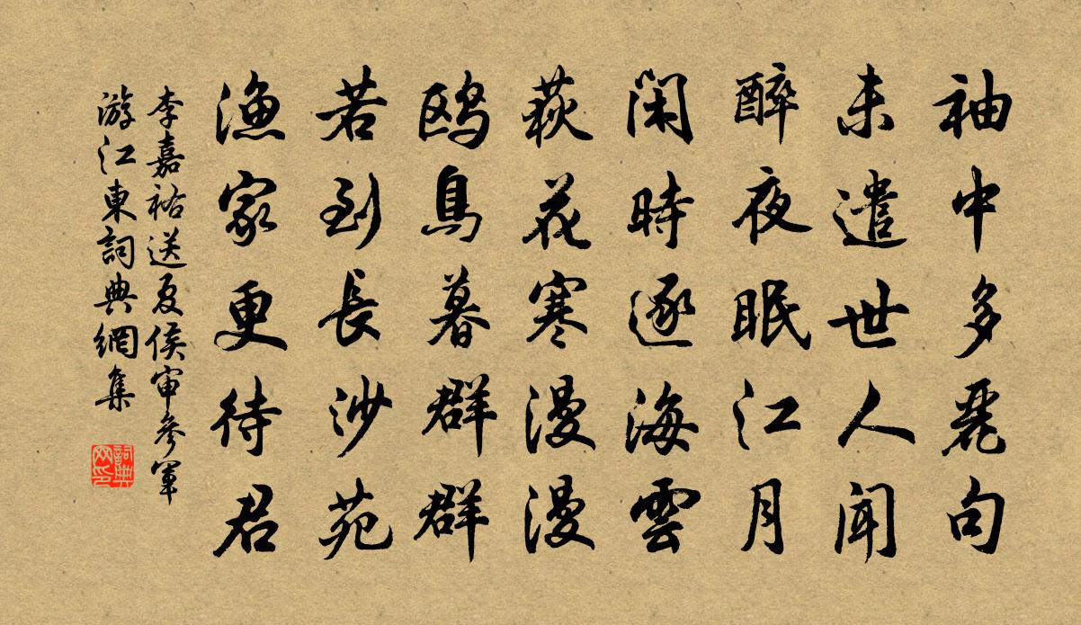詩詞名句歷史字典書法欣賞書法字典國語詞典說文解字康熙字典古漢語字典標 題 作 者 詩 句 送夏侯審參軍游江東作者:李嘉祐 朝代:唐代送夏侯審參軍游江東原文袖中多麗句,未遣世人聞。醉夜眠江月,閒時逐海雲。荻花寒漫漫,鷗鳥暮群群。若到長沙苑,漁家更待君。詩詞問答問:送夏侯審參軍游江東的作者是誰?答:李嘉祐問:送夏侯審參軍游江東寫於哪個朝代?答:唐代李嘉祐送夏侯審參軍游江東書法欣賞送夏侯審參軍游江東書法作品注釋全唐詩:卷206_61詩詞推薦從龍潭寺至少林寺,題贈同游者白居易〔唐代〕山屐田衣六七賢,搴芳蹋翠弄潺湲。九龍潭月落杯酒,三品松風飄管弦。強健且宜游勝地,清涼不覺過炎天。始知六月七日泊金陵阻風得鐘山泉公書寄詩為謝蘇軾〔宋代〕(一作赴嶺表,過金陵蔣山,泉老召食,阻雨不及往)今日江頭天色惡,炮車雲起風欲作。獨望鐘山喚寶公,林間和張仲通憶鍾陵二首王安石〔宋代〕逸少池邊有一丘,西山南浦慣曾游。殘年歸去終無樂,聞說章江即淚流。對菊徐集孫〔宋代〕未能籬下學悠然,慚為微官系日邊。造物似憐清俸少,菊花隨地鑄金錢。頌古二十八首釋道川〔宋代〕三尺寒光射鬥牛,鏌鋣提處鬼神愁。蠻夷不識軍將令,誤人重圍血頸流。贈石敏若黃庭堅〔宋代〕才似謫仙惟欠酒,情如宋玉更逢秋。相看領會一談勝,注目長江天際流。甲午社日客桂林樂雷發〔宋代〕卮酒豚蹄客里歡,石尤風系枲衣單。東陽病骨如鸚鵡,最怯南州社日寒。寄題贛簿彭南夫讀書樓二絕周必大〔宋代〕江山不怕簿書迷,鸞鳳何妨枳棘棲。公退讀書消永夜,遙知太乙下青藜。題石溪偉觀易士達〔宋代〕水共長天不盡頭,石溪奇處著危樓。我來倚徒闌乾看,風撼蘆花葉葉秋。壺中天/念奴嬌佚名〔宋代〕瀟灑幽居,溪園上、新來卜築。況自有、一泓流水,萬竿修竹。屈指花朝才兩夜,祥煙瑞氣騰芳郁。問遼空、何物鴻禧觀次高橫槎韻趙孟堅〔宋代〕秦望與蘭亭,山山遞送迎。蓴鱸方嫩美,草木亦欣榮。去繼漢疏傅,名肩齊魯生。鴻都讀遺事,誰不動歸情。雨花台羅必元〔宋代〕蕭帝傾心向佛家,謾言天女墜天花。蘆僧一葉橫江去,回首梁園日腳斜。裝伯弜周先生手澤董嗣杲〔宋代〕桐溪恩上人,留遺盈束紙。初疑龍蛇奮,不敢傲睨視。嗚呼汶陽翁,父子傳心旨。手澤落世間,枯盡幾硯水。言言送李九貶南陽錢起〔唐代〕玉柱金罍醉不歡,雲山驛道向東看,鴻聲斷續暮天遠,柳影蕭疏秋日寒。霜降幽林沾蕙若,弦驚翰苑失鴛鸞。秋來偈頌一百零九首釋可湘〔宋代〕初三十一,中九下七。今朝部入書雲筆,大書特書兼屢書,祖師兩眼黑如漆。遂初亭蔡載〔宋代〕結廬傍林泉,偶與初心期。佳處時自領,未應魚鳥知。寄王正叔王令〔宋代〕形骸飫饜城市勞,思得遠去與俗逃。借來馬病行欲到,著鞭迫急翻奔跳。連綿半日走十堠,急雨隨濕衣與袍。到家小鳧王炎〔宋代〕母雞伏得兩鳧雛,馴食庭除不待呼。水浴泥行隨分足,不知鷗鷺有江湖。客州賃居寄蕭郎中周朴〔唐代〕松店茅軒向水開,東頭舍賃一裴徊。窗吟苦為秋江靜,枕夢驚因曉角催。鄰舍見愁賒酒與,主人知去索錢來。眼看八六子佚名〔宋代〕憶南洲。紺波縈繞,垂楊柳拂朱樓。念十載風流夢覺,滿身花影人扶,舊曾暗游。無言空愴離憂。醉袖裛將紅淚,名句推薦牧童歸去橫牛背,短笛無腔信口吹。雷震《村晚》 壽酒還嘗藥,晨餐不薦魚。錢起《送外甥懷素上人歸鄉侍奉》 德不孤,必有鄰。孔子弟子《論語·里仁篇》 梅子留酸軟齒牙,芭蕉分綠與窗紗。楊萬里《閒居初夏午睡起》 葉落風不起,山空花自紅。陳師道《妾薄命·為曾南豐作》 琵琶弦上說相思。當時明月在,曾照彩雲歸。晏幾道《臨江仙·夢後樓台高鎖》 明妃留在兩眉愁,萬古春山顰不盡元好問《玉樓春·驚沙獵獵風成陣》 一涓春水點黃昏,便沒頓、相思處。史達祖《留春令·詠梅花》 西城楊柳弄春柔。動離憂。淚難收。秦觀《江城子·西城楊柳弄春柔》 閣道步行月,美人愁煙空。李白《上之回》