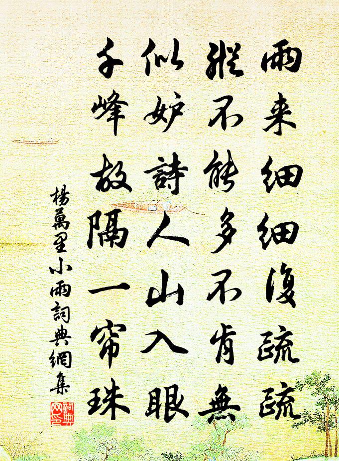 詩詞名句歷史字典書法欣賞書法字典國語詞典說文解字康熙字典古漢語字典標 題 作 者 詩 句 小雨作者:楊萬里 朝代:宋代小雨原文雨來細細復疏疏,縱不能多不肯無。似妒詩人山入眼,千峰故隔一簾珠。詩詞問答問:小雨的作者是誰?答:楊萬里問:小雨寫於哪個朝代?答:宋代問:楊萬里的名句有哪些?答:楊萬里名句大全楊萬里小雨書法欣賞小雨書法作品譯文和注釋譯文細細的,疏疏的,雨兒飄飄灑灑;雨下又下不大,停又不肯停下。是不是妒忌我太喜歡欣賞那遠處的青山?故意從檐下滴成一層珠簾,遮住那千峰萬崖。注釋疏疏:稀稀的樣子。“千峰”句:遠山好似隔在一層珠簾中,似有似無。詩文賞析這首詩約作於宋孝宗乾道(1067-1068年)年間,一次旅途中遇小雨有感而作。 標籤:寫雨,抒情詩詞推薦普天樂·西湖即事張可久〔元代〕蕊珠宮,蓬萊洞,青松影里,紅藕香中。千機雲錦重,一片銀河凍。縹緲佳人雙飛鳳,紫簫寒月滿長空。闌乾晚風宿池州齊山寺,即杜牧楊萬里〔宋代〕我來秋浦正逢秋,夢裡重來似舊遊。風月不供詩酒債,江山長管古今愁。謫仙狂飲顛吟寺,小杜倡情冶思樓。問著春日醉起言志李白〔唐代〕處世若大夢,胡為勞其生。所以終日醉,頹然臥前楹。覺來盼庭前,一鳥花間鳴。借問此何時,春風語流鶯。感之瀑布章孝標〔唐代〕秋河溢長空,天灑萬丈布。深雷隱雲壑,孤電掛岩樹。滄溟曉噴寒,碧落晴盪素。非趨下流急,熱使不得住。夢江南·昏鴉盡納蘭性德〔清代〕昏鴉盡,小立恨因誰?急雪乍翻香閣絮,輕風吹到膽瓶梅,心字已成灰。題鶴林寺僧舍李涉〔唐代〕終日昏昏醉夢間,忽聞春盡強登山。因過竹院逢僧話,又得浮生半日閒。醉翁亭記歐陽修〔宋代〕環滁皆山也。其西南諸峰,林壑尤美,望之蔚然而深秀者,琅琊也。山行六七里,漸聞水聲潺潺而瀉出於兩峰之間題宣州開元寺水閣,閣下宛溪,夾溪居人杜牧〔唐代〕六朝文物草連空,天淡雲閒今古同。鳥去鳥來山色里,人歌人哭水聲中。深秋簾幕千家雨,落日樓台一笛風。惆悵答武陵田太守王昌齡〔唐代〕仗劍行千里,微軀敢一言。曾為大梁客,不負信陵恩。暮春有感寄友人魚玄機〔唐代〕鶯語驚殘夢,輕妝改淚容。竹陰初月薄,江靜晚煙濃。濕觜銜泥燕,香須采蕊蜂。獨憐無限思,吟罷亞枝松。昭君怨·深禁好春誰惜納蘭性德〔清代〕深禁好春誰惜,薄暮瑤階佇立。別院管弦聲,不分明。又是梨花欲謝,繡被春寒今夜。寂寂鎖朱門,夢承恩。採桑子·天容水色西湖好歐陽修〔宋代〕天容水色西湖好,雲物俱鮮。鷗鷺閒眠,應慣尋常聽管弦。 風清月白偏宜夜,一片瓊田。誰羨驂鸞,人在舟中便鷓鴣天(離豫章別司馬漢章大監)辛棄疾〔宋代〕聚散匆匆不偶然。二年遍歷楚山川。但將痛飲酬風月,莫放離歌入管弦。縈綠帶,點青錢。東湖春水碧連天。明朝齊安郡後池絕句杜牧〔唐代〕菱透浮萍綠錦池,夏鶯千囀弄薔薇。盡日無人看微雨,鴛鴦相對浴紅衣。月下獨酌其一李白〔唐代〕花間一壺酒,獨酌無相親。舉杯邀明月,對影成三人。月既不解飲,影徒隨我身。暫伴月將影,行樂須及春。我歌登池上樓謝靈運〔南北朝〕潛虬媚幽姿,飛鴻響遠音。薄霄愧雲浮,棲川怍淵沉。進德智所拙,退耕力不任。徇祿反窮海,臥疴對空林。衾枕自金山放船至焦山蘇軾〔宋代〕金山樓觀何眈眈,撞鐘擊鼓聞淮南。焦山何有有修竹,採薪汲水僧兩三。雲霾浪打人跡絕,時有沙戶祈春蠶。我來山雨翁卷〔宋代〕一夜滿林星月白,亦無雲氣亦無雷。平明忽見溪流急,知是他山落雨來。相思(一作紅豆,又作江上贈李龜年)王維〔唐代〕紅豆生南國,春來發幾枝。願君多採擷,此物最相思。浣溪沙·詠五更和湘真韻納蘭性德〔清代〕微暈嬌花濕欲流,簟紋燈影一生愁。夢回疑在遠山樓。殘月暗窺金屈戍,軟風徐盪玉簾鉤。待聽鄰女喚梳頭。名句推薦況屬高風晚,山山黃葉飛。王勃《山中》 一沐三捉髮,一飯三吐哺。司馬遷《史記·魯周公世家》 江上雪,獨立釣漁翁。李綱《望江南·江上雪》 當軒對尊酒,四面芙蓉開。王維《臨湖亭》 丈夫志,當景盛,恥疏閒。蘇舜欽《水調歌頭·滄浪亭》 檳榔無柯,椰葉無陰。左思《三都賦》 阿香秋夢起嬌啼,玉女傳幽素。吳文英《燭影搖紅·越上霖雨應禱》 素臣稱有道,守在於四夷。田錫《塞上曲》 無有定法如來可說。鳩摩羅什譯《金剛經·無得無說》 崑山玉碎鳳凰叫,芙蓉泣露香蘭笑。李賀《李憑箜篌引》