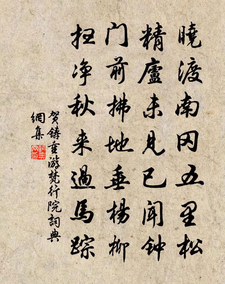 詩詞名句歷史字典書法欣賞書法字典國語詞典說文解字康熙字典古漢語字典標 題 作 者 詩 句 重遊梵行院作者:賀鑄 朝代:宋代重遊梵行院原文曉渡南岡五里松,精廬未見已聞鍾。門前拂地垂楊柳,掃淨秋來過馬蹤。詩詞問答問:重遊梵行院的作者是誰?答:賀鑄問:重遊梵行院寫於哪個朝代?答:宋代問:賀鑄的名句有哪些?答:賀鑄名句大全賀鑄重遊梵行院書法欣賞重遊梵行院書法作品詩詞推薦倚月仇遠〔宋代〕大江東去月分明,烏鵲南飛露氣清。如此嬋娟人不愛,倚樓獨立過三更。探春令佚名〔宋代〕綠楊枝上曉鶯啼,報融和天氣。被數聲、吹入紗窗里。又驚起嬌娥睡。綠雲斜嚲金釵墮。惹芳心如醉。為少年濕了太湖王令〔宋代〕西南無盡望,吞恐罄吳郊。海近私憑蓄,天低不敢包。蛟龍宜自宅,螾蛭莫令巢。遠浦才分點,歸檣略認梢。水乘偈頌一百五十首釋心月〔宋代〕百丈下堂句,雲門顧鑒咦。進前叉手立,端的許誰知。次韻謝從之以表閭投贈方岳〔宋代〕長楊奏賦三十年,已甘老死窮山巔。醉眠獨宿秋風前,此豈有意聲名傳。如駑伏櫪不受鞭,要與騕褭難爭妍。強令送同年林多益丞寧海陳傅良〔宋代〕同裡衣冠近闊疎,同年齒髮多衰變。美人宜在玉筍班,隱吏亦隨花雨懸。有杭一葦逢迎可,每食雙魚甘旨便。顧瞻暑夕三首王鎡〔宋代〕枕石雲邊睡一場,蘚花泉洞碧松香。朱門正役風車苦,不識山中有此涼。雲漢佚名〔先秦〕倬彼雲漢,昭回於天。王曰:於乎!何辜今之人?天降喪亂,饑饉荐臻。靡神不舉,靡愛斯牲。圭壁既卒,寧莫我西平樂(用耆卿韻)朱雍〔宋代〕夜色娟娟皎月,梅玉供春緒。不使鉛華點綴,超出精神淡佇。休妒殘英如雨。清香眷戀,只恐隨風滿路。散無數。陳待制五月十四日生朝徐照〔宋代〕羲轡遲中夏,生賢國世寧。隔宵蟾欲滿,經溽雨初停。分派來溈水,儲神應德星。高樓參造物,健筆倒滄冥。幾郡明月湖宋祁〔宋代〕湖色淡無際,月華相與閒。臨波雙璧映,照浦一珠還。宿火燈洲外,橫煙桑柘間。不妨清思劇,舉國盡溪山。聞桂衛宗武〔宋代〕山光水色染秋客,天際明霞一線紅。冉冉有香來鼻觀,廣寒花氣散晴空。四字書窗以印實相釋印肅〔宋代〕佳乘兩口草標頭,共見同看水牯牛。昨夜牧人無被蓋,今朝猶笑道無求。自吟徐釣者〔唐代〕曾見秦王架石橋,海仙忙迫漲驚潮。蓬萊隔海雖難到,直好三清卻不遙。挽趙子固左司孫應時〔宋代〕每嘆公知我,垂恩及父兄。逢人說名姓,會面寫平生。近別無雙鯉,傷懷忽九京。翟公門下客,誓不負交情。遊仙都五首吳謹微〔宋代〕山下霏微雨灑塵,門前嘹唳鶴迎人。遂成一覺仙都夢,更訪遺蹤得隱真。湖北驛中偶成馬祖常〔元代〕江田稻花露始零,浦中蓮子青復青。楚船祠龍來買酒,十幅蒲帆上洞庭。羅衣薰香錢滿篋,身是揚州販鹽客。明年鵲橋仙杜安世〔宋代〕日長天氣,深深庭院,又是春愁滋味。池邊昨夜雨兼風,戰紅杏、餘香亂墜。陰陰亭榭,暖煙輕柳,萬縷黃金窣地偈頌一百三十六首釋惟一〔宋代〕佛滅二千有餘載,五逆兒孫渾不採。一夜雷轟雨滂霈,諸天亦為尀耐。偈公六十五首釋鹹傑〔宋代〕達磨不來東土,二祖不往西天。石室行者蹈碓忘卻移步,玄沙討魚賣峭蹈翻釣船。名句推薦丈夫非無淚,不灑離別間。陸龜蒙《別離》 中庸其至矣乎!民鮮能久矣。子思《中庸·第三章》 甘受人欺,定非懦弱;自謂予智,終是糊塗。王永彬《圍爐夜話·第一二五則》 亭上秋風,記去年裊裊,曾到吾廬。辛棄疾《漢宮春·會稽秋風亭觀雨》 四十三年,望中猶記,烽火揚州路。辛棄疾《永遇樂·京口北固亭懷古》 闌風伏雨催寒食,櫻桃一夜花狼藉。納蘭性德《菩薩蠻·闌風伏雨催寒食》 風急天高猿嘯哀,渚清沙白鳥飛回。杜甫《登高》 洛陽城裡見秋風,欲作家書意萬重。張籍《秋思》 同天下之利者,則得天下;擅天下之利者,則失天下。姜子牙《六韜·文韜·文師》 亂花漸欲迷人眼,淺草才能沒馬蹄。白居易《錢塘湖春行》