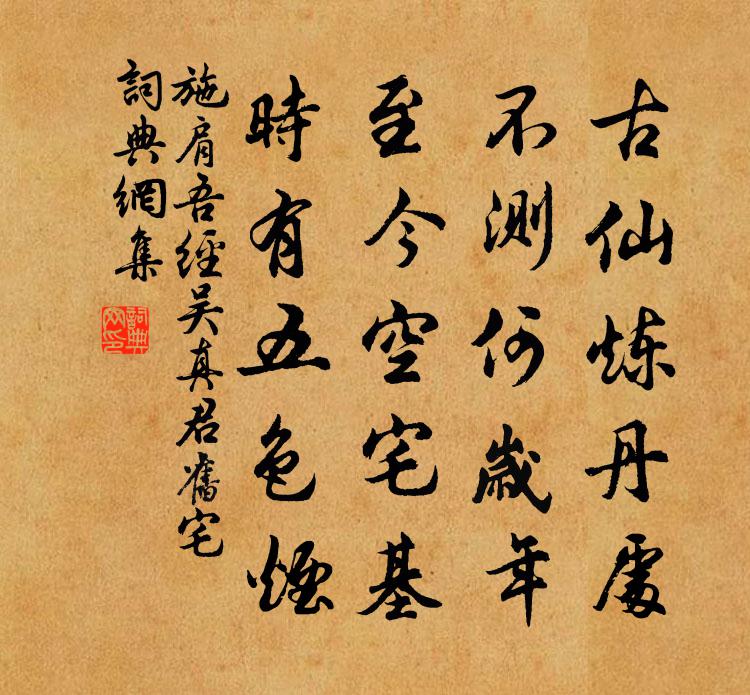 詩詞名句歷史字典書法欣賞書法字典國語詞典說文解字康熙字典古漢語字典標 題 作 者 詩 句 經吳真君舊宅作者:施肩吾 朝代:唐代經吳真君舊宅原文古仙煉丹處,不測何歲年。至今空宅基,時有五色煙。詩詞問答問:經吳真君舊宅的作者是誰?答:施肩吾問:經吳真君舊宅寫於哪個朝代?答:唐代問:經吳真君舊宅是什麼體裁?答:五絕施肩吾經吳真君舊宅書法欣賞經吳真君舊宅書法作品注釋全唐詩:卷494-34詩詞推薦早寒白居易〔唐代〕黃葉聚牆角,青苔圍柱根。被經霜後薄,鏡遇雨來昏。半卷寒檐幕,斜開暖閣門。迎冬兼送老,只仰酒盈尊。次韻王起宗勉為高子明繪松岩圖方回〔宋代〕松下客攜琴,岩中人讀書。聲氣相應求,妙寫人畫圖。灑落真意趣,冷淡閒工夫。體中脫不佳,明窗時自娛。誰方頌古釋道顏〔宋代〕十年海上覓冤讎,不得冤讎未肯休。芍藥花開菩薩面,棕櫚吾散夜叉頭。次韻方蒙仲高人亭方岳〔宋代〕老子可林壑,諸公自煙霄。緬懷歸耕歸,底用招隱招。贈彥清洪皓〔宋代〕好生惡殺號蒼天,天憫斯民欲息肩。自是大邦後不戢,在於南國使無{左亻右替日換心}。論功弗用矜三捷,寺勝又呈吳郎杜甫〔唐代〕堂前撲棗任西鄰,無食無兒一婦人。不為困窮寧有此,只緣恐懼轉須親。即防遠客雖多事,使插疏籬卻甚真。已訴送祝八之江東,賦得浣紗石李白〔唐代〕西施越溪女,明艷光雲海。未入吳王宮殿時,浣紗古石今猶在。桃李新開映古查,菖蒲猶短出平沙。昔時紅粉照流庭竹唐求〔唐代〕月籠翠葉秋承露,風亞繁梢暝掃煙。知道雪霜終不變,永留寒色在庭前。乳燕飛/賀新郎汪莘〔宋代〕曉趁西湖約。到湖頭,煙消日出,波生雨腳。日挈白魚攜碧酒,要與詩人共酌。把樓上、珠簾卷卻。坐對荷花三萬山中贈諸暨丹丘明府秦系〔唐代〕荷衣半破帶莓苔,笑向陶潛酒瓮開。縱醉還須上山去,白雲那肯下山來。九張機佚名〔宋代〕六張機。行行都是耍花兒。花間更有雙蝴蝶,停梭一晌,閒窗影里。獨自看多時。踏歌詞四首·其一劉禹錫〔唐代〕春江月出大堤平,堤上女郎連袂行。唱盡新詞歡不見,紅霞映樹鷓鴣鳴。臨江仙·昨夜個人曾有約納蘭性德〔清代〕昨夜個人曾有約,嚴城玉漏三更。一鉤新月幾疏星。夜闌猶未寢,人靜鼠窺燈。原是瞿唐風間阻,錯教人恨無情。滿江紅 登石頭城清涼寺翠微亭張野〔元代〕翠微秋晚,試閒登絕頂,徘徊凝佇。一片清涼兜率界,幾度風雷貔虎。鍾阜盤空,石城瞰水,形勢相吞吐。江山依牧豎崔道融〔唐代〕牧豎持蓑笠,逢人氣傲然。臥牛吹短笛,耕卻傍溪田。習馬長楊詩樓鑰〔宋代〕強漢承平後,兢兢武不忘。整師臨五柞,習馬向長楊。冀野來騏驥,天閒出驌驦。驤騰射熊館,馳驟華山陽。輦路宣上人遠寄和禮部王侍郎放榜後詩,因而繼和劉禹錫〔唐代〕禮闈新榜動長安,九陌人人走馬看。一日聲名遍天下,滿城桃李屬春官。自吟白雪詮詞賦,指示青雲借羽翰。借問日李嶠〔唐代〕旦出扶桑路。遙升若木枝。雲間五色滿。霞際九光披。東陸蒼龍駕。南郊赤羽遲。傾心比葵藿。朝夕奉光曦。遠山釋斯植〔宋代〕萬里色蒼然,春煙夕照邊。舊過南嶽寺,曾向雨中看。杜鵑梅堯臣〔宋代〕蜀帝何年魄,千春化杜鵑。不如歸去語,亦自古來傳。月樹啼方急,山房客未眠。還將口中血,滴向野花鮮。名句推薦春草細還生,春雛養漸成。揭傒斯《畫鴨》 猶傶則疏之,毋使人圖之,猶疏則數之,毋使人曲之管仲《管子·侈靡》 吹燈窗更明,月照一天雪。袁枚《十二月十五夜》 不愁屋漏床床濕,且喜溪流岸岸深曾幾《蘇秀道中》 人問誰,對以名。吾與我,不分明。李毓秀《弟子規·謹》 細柳開營揖天子,始知灞上為嬰孩李白《司馬將軍歌》 過能改,歸於無。倘掩飾,增一辜。李毓秀《弟子規·信》 五更櫪馬靜無聲。鄰雞猶怕驚。吳文英《醉桃源·元日》 獨立寒秋,湘江北去,橘子洲頭。 * 《沁園春·長沙》 支離東北風塵際,漂泊西南天地間。杜甫《詠懷古蹟五首·其一》