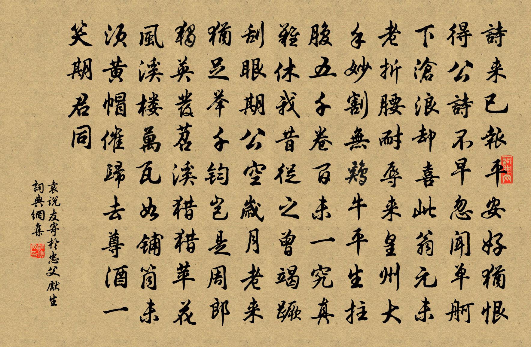 詩詞名句歷史字典書法欣賞書法字典國語詞典說文解字康熙字典古漢語字典標 題 作 者 詩 句 寄於忠父先生作者:袁說友 朝代:宋代寄於忠父先生原文詩來已報平安好,猶恨得公詩不早。忽聞單舸下滄浪,卻喜此翁元未老。折腰耐辱來皇州,大手妙割無雞牛。平生拄腹五千卷,百未一究真難休。我昔從之曾竭蹶,刮眼期公空歲月。老來猶足舉千鈞,豈是周郎獨英發。苕溪獵獵苹花風,溪樓萬瓦如鋪筒。未須黃帽催歸去,尊酒一笑期君同。詩詞問答問:寄於忠父先生的作者是誰?答:袁說友問:寄於忠父先生寫於哪個朝代?答:宋代袁說友寄於忠父先生書法欣賞寄於忠父先生書法作品詩詞推薦柳梢青(茶)李處全〔宋代〕九天圓月。香塵碎玉,素濤翻雪。石乳香甘,松風湯嫩,一時三絕。清宵好盡歡娛,奈明日、扶頭怎說。整頓頹山席上分韻賦梅花得知字李彌遜〔宋代〕寒梅獨笑野人扉,只有春風許自知。蠟屐追芳輸我輩,著鞭持酒記安時。白霓行處玉妃從,明月光中寶璐垂。更與即事張嵲〔宋代〕屐齒休令破紫苔,柴門無客不須開。雨余籬菊埋光去,木落前山獻體來。送真上人還蘭若崔峒〔唐代〕得道雲林久,年深暫一歸。出山逢世亂,乞食覺人稀。半偈初傳法,中峰又掩扉。愛憎應不染,塵俗自依依。和南安余宰題翠陰亭致爽軒二首黃公度〔宋代〕碩勢揖孤峙,交柯藏伯勞。日臨公館寂,人與此軒高。對酒屢中聖,題詩應仆騷。喬林思舊隱,咫尺聽風號。寄柳舍人宗元賈島〔唐代〕格與功俱造,何人意不降。一宵三夢柳,孤泊九秋江。擢第名重列,沖天字幾雙。誓為仙者仆,側執馭風幢。寄馮著韋應物〔唐代〕春雷起萌蟄,土壤日已疏。胡能遭盛明,才俊伏里閭。偃仰遂真性,所求惟斗儲。披衣出茅屋,盥漱臨清渠。吾道游石橋黃炏〔宋代〕橫石圓峰豈偶然,上懸又瀑下澄淵。我來不為橋難過,待了區中未盡緣。樂天寄重和晚達冬青一篇,因成再答劉禹錫〔唐代〕風雲變化饒年少,光景蹉跎屬老夫。秋隼得時凌汗漫,寒龜飲氣受泥塗。東隅有失誰能免,北叟之言豈便無。振臂與腖禪人釋正覺〔宋代〕白苹風作江頭秋,青鳥夢隨沙水流。清興十分蓬上月,滿船載入蘆華洲。斯適意,去來休。六鰲合負歸來也,煙浪和微之林亭王安石〔宋代〕為有檀欒占雒陽,憶歸杖策此徜徉。觀魚得意還知樂,入鳥忘機肯亂行。未敢許君輕去國,不應如我漫為郎。中園登寶林佛閣次韻黃庚〔宋代〕曳杖陟高閣,登臨思渺然。閒身空歲月,老眼幾山川。落照明秋浦,飛帆濕暮煙。倚閣悵今昔,余恨付吟篇。予前後守、倅餘杭,凡五年。夏秋之間,蒸熱蘇軾〔宋代〕忠孝王家千柱宮,東坡作吏五年中。中和堂上東南頰,獨有人間萬里風。書懷王之望〔宋代〕海邊寂寞村,春半芳菲月。東風所至處,陋境亦佳絕。壠麥已翻芒,山花自成列。愁腸不堪斷,預畏柳飛雪。更憂秋日遣懷陸游〔宋代〕今年秋氣早,風露應時令;晨起換熟衣,殘暑已退聽。松聲滿庭戶,蕭然失衰病。人眾何足言,天固不可勝。馬德駿微恙既平作此勞之李流謙〔宋代〕內寇非陰陽,窮愁因緣之。堅壘自卻走,不藥亦不龜。夫子樂唐虞,短褐蔭茅莰。塵不上幾闥,何物作伺窺。或丐句胡澹翁〔宋代〕赤魚白蟹何足數,風味未可松江鈣。江城子 歌者張氏,戴仲德仲本時以茶謁其家舒頔〔元代〕戴郎昆仲太風流。翠娥愁。解貂裘。醉中摸索玉搔頭。繡被*香肌粉滑,雲作帳,月為鉤。茅庵權當小秦樓。意綢八三侄借半山詩因以示之陳宓〔宋代〕我讀半山詩,瞠乎不可及。風騷融老腹,取次有攝拾。清放太白章,悲壯杜陵集。爭雄而競秀,鼎峙高頁岌。譬將和毛國鎮白雲莊五詠其二平溪堂蘇轍〔宋代〕清溪似與隱君謀,故入堂前漫不收。盥手從今休汲井,浮觴取意便臨流。花漂澗谷來應遠,石激琴箏久未休。莫把名句推薦運籌帷幄之中,制勝於無形司馬遷《史記·七十列傳·太史公自序》 寬柔以教,不報無道,南方之強也。君子居之。子思《中庸·第十章》 運退黃金失色,時來鐵也生光。馮夢龍《醒世恆言·卷三》 何處合成愁。吳文英《唐多令·惜別》 空獨倚東風,芳思誰寄。周密《繡鸞鳳花犯·賦水仙》 短綆不可以汲深井之泉,知不幾者不可與及聖人之言。荀子《荀子·榮辱》 轡搖銜鐵。蹴踏平原雪。張炎《清平樂·平原放馬》 寥落古行宮,宮花寂寞紅。元稹《行宮》 微風起,清芬醞藉,不減酴醿。李清照《多麗·詠白菊》 欲系青春,少住春還去。朱淑真《蝶戀花·送春》