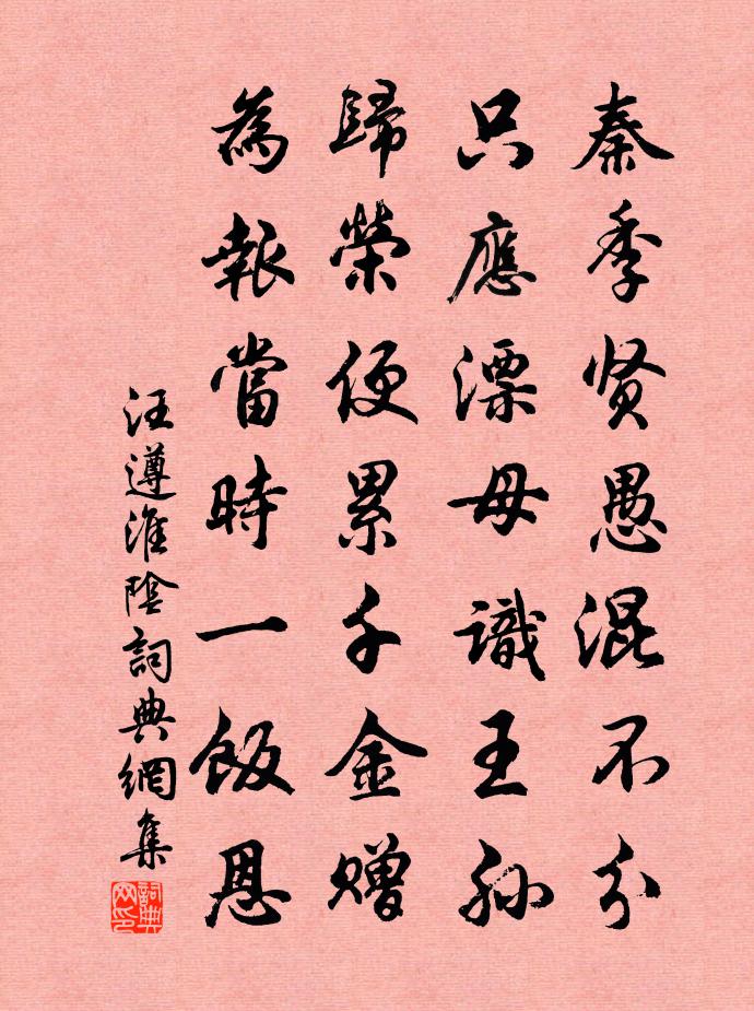 詩詞名句歷史字典書法欣賞書法字典國語詞典說文解字康熙字典古漢語字典標 題 作 者 詩 句 淮陰作者:汪遵 朝代:唐代淮陰原文秦季賢愚混不分,只應漂母識王孫。歸榮便累千金贈,為報當時一飯恩。詩詞問答問:淮陰的作者是誰?答:汪遵問:淮陰寫於哪個朝代?答:唐代問:淮陰是什麼體裁?答:七絕汪遵淮陰書法欣賞淮陰書法作品注釋全唐詩:卷602-27詩詞推薦危語權德輿〔唐代〕被病獨行逢乳虎,狂風駭浪失棹櫓。舉人看榜聞曉鼓,孱夫孽子遇妒母。杭州春望白居易〔唐代〕望海樓明照曙霞,護江堤白踏晴沙。濤聲夜入伍員廟,柳色春藏蘇小家。紅袖織綾夸柿蒂,青旗沽酒趁梨花。誰開張徐州席送岑秀才孟郊〔唐代〕振振芝蘭步,升自君子堂。泠泠松桂吟,生自楚客腸。羈鳥無定棲,驚蓬在他鄉。去茲門館閒,即彼道路長。雨餘虞美人張炎〔宋代〕修眉刷翠春痕聚。難翦愁來處。斷絲無力綰韶華。也學落紅流水、到天涯。那回錯認章台下。卻是陽關也。待將新馬郎婦贊釋法薰〔宋代〕聲色純真,見聞不礙。宴坐經行,得大自在。腳頭腳底黑漫漫,又逐春風婦馬郎。過京口王冕〔元代〕瓜洲正對西津渡,金山焦山江水中。過客放船忌險阻,何人擊楫問英雄?白雲渺渺生秋樹,黃葉蕭蕭落晚風。鐵瓮和王治臣新定即事張伯玉〔宋代〕碧泉千脈瀉金溝,名是東南俗阜州。任昉舊詩題縣石,賀齊高疊照江流。月明幾處游歸客,春色何人醉倚樓。我是喜遷鶯程珌〔宋代〕少年意氣,腦燕兵胡,虜王區脫。眼底朦朧,腹中空洞,不著曹劉元白。聞道殊科八中,也要彩盧連擲。收拾盡和河南白尹西池北新葺水齋招賞十二韻雍陶〔唐代〕二室峰前水,三川府右亭。亂流深竹徑,分繞小花汀。池角通泉脈,堂心豁地形。坐中寒瑟瑟,床下細泠泠。雨夜題李君亮義概堂葉適〔宋代〕分飧人所能,多至逾萬億。一朝可趣具,寒暑三十易。古之轑釜者,其始蓋未惜。懷哉西方士,義重見寡特。招呼示瞭然居士釋宗杲〔宋代〕長樂沙坑鄭瞭然,不依本分要參禪。自言已到無參處,歌羅管爾米疆年。送師相陳大觀文喻良能〔宋代〕頻年秋稔穀相因,八郡恩波著處勻。長樂城中家幾萬,家家生子總名陳。西湖晚泛釋紹嵩〔宋代〕蘇堤一帶柳陰長,柳長西風特地狂。晚泊孤舟古祠下,自彈別鶴送斜陽。吊朱給事李復〔宋代〕筮仕西州佐邑時,高才不厭簿書卑。清修與眾初難合,真節當朝晚始知。諫苑塵埃多舊藁,佛宮粉繪有生祠。與君蝶戀花彭元遜〔宋代〕微雨燒香餘潤氣,新綠愔愔,乳燕相依睡。無復捲簾知客意,楊柳更欲因風起。舊夢蒼茫雲海際。強作歡娛,不覺詩一首楊蟠〔宋代〕詩魂躔斗壁,醉力撼蓬萊。剖山無鵲印,傾廄盡龍媒。頌證道歌證道歌釋印肅〔宋代〕淨五眼,得五力,五通曾告瞿曇覓。證知見覺不相干,因邪打正連天碧。送鄧秘丞知德安縣余靖〔宋代〕里閈俊游心久降,越台成政俗敦龐。香爐山下重為縣,閶闔風高還渡江。且喜恩威長及物,莫嫌功業未經邦。公齋川撥棹王哲〔元代〕酆都路。定置個、凌遲所。便安排了,鐵床鑊湯,刀山劍樹。造惡人有緣覷。造亞人有緣覷。鬼使勾名持黑簿。沒巽上人以竹閒自采新茶見贈,酬之以詩柳宗元〔唐代〕芳叢翳湘竹,零露凝清華。復此雪山客,晨朝掇靈芽。蒸煙俯石瀨,咫尺凌丹崖。圓方麗奇色,圭璧無纖瑕。呼兒名句推薦借問酒家何處有?牧童遙指杏花村。杜牧《清明》 得不為喜,去不為恨。司馬遷《史記·日者列傳》 朱門沉沉按歌舞,廄馬肥死弓斷弦。陸游《關山月》 焉知後之視今,不如今之視昔也?王通《中說·卷七·述史篇》 秋風夜渡河,吹卻雁門桑。王昌齡《塞下曲·秋風夜渡河》 有三秋桂子,十里荷花。柳永《望海潮·東南形勝》 莫道桑榆晚,為霞尚滿天。劉禹錫《酬樂天詠老見示》 見善如不及,見不善如探湯孔子弟子《論語·季氏篇》 生死有命,富貴在天。佚名《增廣賢文·上集》 故國傷心,新亭淚眼,更灑瀟瀟雨。王瀾《念奴嬌·避地溢江書於新亭》