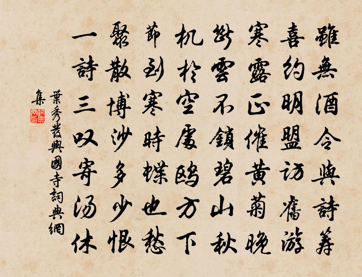 詩詞名句歷史字典書法欣賞書法字典國語詞典說文解字康熙字典古漢語字典標 題 作 者 詩 句 興國寺作者:葉秀髮 朝代:宋代興國寺原文雖無酒令與詩籌,喜約明盟訪舊遊。寒露正催黃1/1菊晚,斷雲不鎖碧山秋。機於空處鷗方下,節到寒時蝶也愁。聚散博沙多少恨,一詩三嘆寄湯休。詩詞問答問:興國寺的作者是誰?答:葉秀髮問:興國寺寫於哪個朝代?答:宋代葉秀髮興國寺書法欣賞興國寺書法作品詩詞推薦曉發褚載〔唐代〕貪路貪名須早發,枕前無計暫裴回。才聞雞唱呼童起,已有鈴聲過驛來。衣濕乍驚沾霧露,馬行仍未見塵埃。朝朝九日二首曾幾〔宋代〕儋耳重陽菊滿頭,恰如佳月即中秋。歸來唱著中原句,卻道黃花蝶也愁。木蘭花慢 送張夢符治書赴召魏初〔元代〕正江南二月,春色里、送君行。對芳草晴煙,海棠細雨,不盡離情。思量漢皋城上,共當時、飛盡人青冥。醉後嘉誨子游酢〔宋代〕三十年前宿草廬,五年三第世間無。門前獬豸公裳在,只恐兒孫不讀書。山花子·欲話心情夢已闌納蘭性德〔清代〕欲話心情夢已闌,鏡中依約見春山。方悔從前真草草,等閒看。環佩只應歸月下,鈿釵何意寄人間。多少滴殘紅蠟西江月王哲〔元代〕酒飲清光滑辣,肉餐軟美香甜。世間迷誤總無厭。個個臨頭路險。獨我悟來口遠,唯余省後心嫌。十分戒行愈精嚴枕上聞風王義山〔宋代〕風撼林間萬竅開,耳邊雨帶暮潮來。似知書困難為寬,剛把天聲為喚回。江外思鄉韋莊〔唐代〕年年春日異鄉悲,杜曲黃鶯可得知。更被夕陽江岸上,斷腸煙柳一絲絲。次韻呂浩然四首張鎡〔宋代〕小築茅堂亦有廳,規摹林野自然清。仙風道骨真人後,過我應除喝道聲。南征回京至界上驛先呈城中諸友歐陽修〔宋代〕朝雲來少室,日暮向箕山。本以無心出,寧隨倦客還。春歸伊水綠,花晚洛橋閒。誰有餘◇酒,相期一解顏。嚴陵道上雜詠七首洪咨夔〔宋代〕玄英范老聞風起,俱為羊裘一釣絲。堂扁三賢非本意,何如只號子陵祠。宗人大著令問通判廣州楊億〔宋代〕蘭台大著作,族派共關西。南海分憂寄,東門敘解攜。離城衝臘雪,宿館聽晨雞。畫鷁江波遠,鳴騶嶺路迷。陸梅送錢寺正出守廣德軍二首楊萬里〔宋代〕辛卯中書落筆年,曾陪學士堵牆間。看渠手把州麾去,故里春迎晝繡還。我似青蒿君玉樹,君方綠鬢我蒼顏。一尊春夜書懷釋紹嵩〔宋代〕海內艱難各飽更,鬢毛寧與化工爭。春宵思極蘭燈暗,曉角初吹客夢驚。壯思不逢韓吏部,絕交益愧孔方兄。到頭華山文同〔宋代〕石蓮峨峨橫紫霄,中瀉萬丈銀河水。安得大箭長八尺,欲與天神博於此。戰掉醜奴兒 本名添字醜奴兒 紫極宮加持,馬鈺〔元代〕萊州道眾修黃,各各虔誠。無不專精。邀我加持默念經。救亡靈。奈何鄰舍屠魁劊,不顧前程。宰殺為生。豬痛酬朗州崔員外與任十四兄侍御同過鄙人舊居…時守吳郡劉禹錫〔唐代〕昔日居鄰招屈亭,楓林橘樹鷓鴣聲。一辭御苑青門去,十見蠻江白芷生。自此曾沾宣室召,如今又守闔閭城。何人水調歌頭魏了翁〔宋代〕尚記春歸日,錦繡裹江城。誰推日馭西去,水認故鄉痕。魚鳥自飛自躍。紅紫誰開誰落。天運渺無聲。四序鎮如此定風波 次高左藏使君韻黃庭堅〔宋代〕萬里黔中一漏天。屋居終日似乘船。及至重陽天也霽。催醉。鬼門關外蜀江前。莫笑老翁猶氣岸。君看。幾人 * 梅花王梅窗〔宋代〕月淡碧雲籠野水,稜稜瘦聲吟肩起。一天寒氣霞衣裳,人在石橋春影里。名句推薦回首故山千里外,別離心緒向誰言?楊徽之《寒食寄鄭起侍郎》 水急客舟疾,山花拂面香李白《秋浦歌十七首》 君馬黃,我馬白。李白《君馬黃》 自古驕兵多致敗,從來輕敵少成功。羅貫中《三國演義·第六十九回》 一場幽夢同誰近,千古情人獨我痴。曹雪芹《紅樓夢·第五回》 吳絲蜀桐張高秋,空山凝雲頹不流李賀《李憑箜篌引》 丈夫不能再辱。班固《漢書·傳·李廣蘇建傳》 大樹無枝向北風,十年遺恨泣英雄。高啟《吊岳王墓》 不種閒花,池亭畔、幾竿修竹。陸容《滿江紅·詠竹》 大丈夫處世,當埽除天下范曄《後漢書·列傳·陳王列傳》