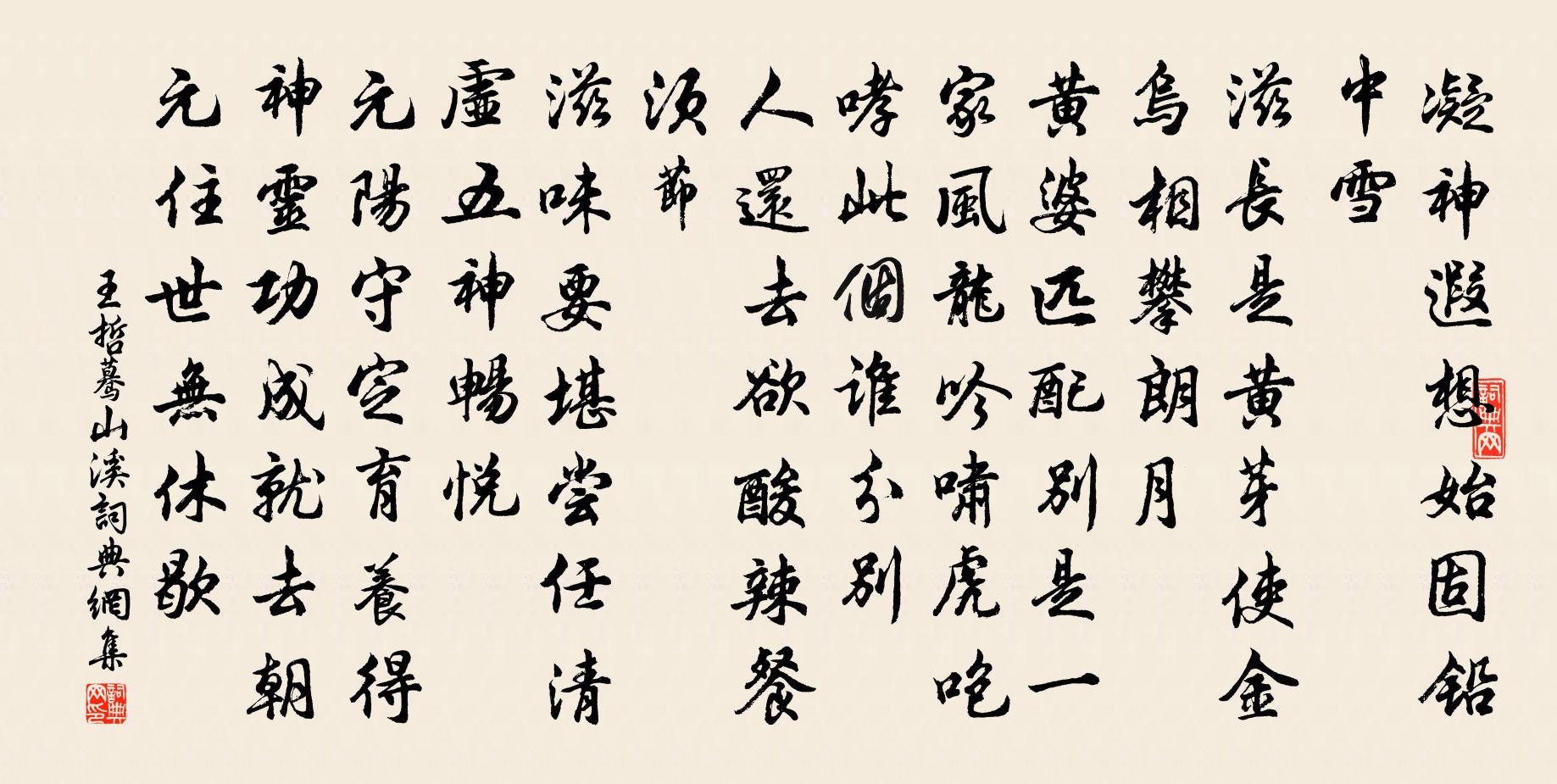 詩詞名句歷史字典書法欣賞書法字典國語詞典說文解字康熙字典古漢語字典標 題 作 者 詩 句 驀山溪作者:王哲 朝代:元代驀山溪原文凝神遐想,始固鉛中雪。滋長是黃芽,使金烏、相攀朗月。黃婆匹配,別是一家風,龍吟嘯,虎咆哮,此個誰分別。人還去欲,酸辣餐須節。滋味要堪嘗,任清虛、五神暢悅。元陽守定,育養得神靈,功成就,去朝元,住世無休歇。詩詞問答問:驀山溪的作者是誰?答:王哲問:驀山溪寫於哪個朝代?答:元代問:驀山溪是什麼體裁?答:詞王哲驀山溪書法欣賞驀山溪書法作品詩詞推薦次韻邵公濟尋梅三首郭印〔宋代〕天與幽姿自不同,凌寒獨秀雪霜中。山茶未許方高潔,故使千花立下風。酬別致用元稹〔唐代〕風行自委順,雲合非有期。神哉心相見,無眹安得離。我有懇憤志,三十無人知。修身不言命,謀道不擇時。達則偈頌四十一首釋慧暉〔宋代〕今宵分歲限陰陽,賓主交和曾不藏。寒雪苦辛霜後路,明朝明旭露春芳。道上口占喻良能〔宋代〕隴北麥苗初覆塊,舍南梅蕊已含須。小春似有芳菲意,憑仗何人為寫圖。頌古一百二十一首釋宗杲〔宋代〕夜半明星當午現,愚夫猶待曉雞鳴。可憐自屎不知臭,又欲得新牛似人。汾陰十首真宗〔宋代〕至哉物祖,設象隆脽。動靜之德,翕闢攸宜。嘉粟以薦,精禱洪釐。茂宣陰貺,五觳蕃滋。宴清都袁去華〔宋代〕暮雨消煩暑。房櫳□、頓覺秋意如許。天高雲杳,山橫紺碧,桂華初吐。空庭靜掩桐陰,更苒苒、流螢暗度。記那朝中措(人日蟆頤席間和韻)李壁〔宋代〕東風歌吹髮重闉。飛旆入山新。小雨不妨酥潤,江頭一併霜晴。年年心似,輸他釵燕,蟠帶迎春。怎得尊前避酒,胡少明兩書索二程先生畫像寄小詩二首陳長方〔宋代〕牛首蒙倛兩誤傳,與人同處最難言。孟軻出語不驚坐,熟複方能知委源。十二月十六日後殿朝謁孔武仲〔宋代〕晨光先到帝王州,別殿珠簾不上鉤。萬歲聲齊山獻壽,九門朝退海分流。參差雉尾回丹陛,杳遠雞聲下禁樓。年少和潘叔治題劉道士房畫薛稷六鶴圖六首其三唳梅堯臣〔宋代〕引吭向層霄,聲聞期在耳。鼓吻意豈疏,知音何已矣。安得九皋同,流響入萬里。送酇縣董明府之任於武陵〔唐代〕南北行已久,憐君知苦辛。萬家同草木,三載得陽春。東道聽遊子,夷門歌主人。空持語相送,應怪不沾巾。浪淘沙張炎〔宋代〕寒食不多時。燕燕才歸。杏花零落水痕肥。淺碧分山初過雨,一霎晴暉。閒折小桃枝。蝶也相隨。晚妝不合整蛾眉壽范潔齋二首吳泳〔宋代〕明河耿高樹,素月流澄瀛。裊裊來金風,秋意浩以盈。美人自西方,鍾此一氣清。如潭貯皎潔,如室生虛靈。姱節寄石泉雲間明府叔陳必復〔宋代〕臥念相從樂,杜門岑寂中。曙窗報晴色,寒葉語秋風。別去詩難穩,愁來酒易空。相看渚數驛,好為寄書筒。次韻黃魯直寄題郭明父府推潁州西齋二首蘇軾〔宋代〕寂寞東京月旦州,德星無復綴珠旒。莫嗟平興空神物,尚有西齋接勝流。春夢屢尋湖十頃,家書新報橘千頭。雪堂題花光畫黃庭堅〔宋代〕湖北山無地,湖南水徹天。雲沙真富貴,翰墨小神仙。句釋方會〔宋代〕漁翁未擲釣,躍鱗衝浪來。木蘭花(汝陰湖上同東坡用六一韻)陳師道〔宋代〕湖平木落搖空闊。葉底流泉鳴復咽,酒邊清漏往時同,花里朱弦縴手抹。風光過手春冰滑。十事違人常七八。不將立秋釋道璨〔宋代〕碧樹蕭蕭涼氣回,一年懷抱此時開。槿花籬下占秋事,早有牽牛上竹來。名句推薦日暮征帆何處泊,天涯一望斷人腸。孟浩然《送杜十四之江南 / 送杜晃進士之東吳》 強國戰兵,霸國戰智,王國戰義,帝國戰德,皇國戰無為。王通《中說·卷五·問易篇》 主人有酒歡今夕,請奏鳴琴廣陵客。李頎《琴歌》 上無威,下生亂。來俊臣《羅織經·治下卷第三》 傷心橋下春波綠,曾是驚鴻照影來。陸游《沈園二首》 知否,知否?應是綠肥紅瘦。李清照《如夢令·昨夜雨疏風驟》 好學深思,心知其意。司馬遷《史記·五帝本紀》 青冥浩蕩不見底,日月照耀金銀台。李白《夢遊天姥吟留別 / 別東魯諸公》 清秋幕府井梧寒,獨宿江城蠟炬殘。杜甫《宿府》 疑人勿使,使人勿疑脫脫《金史·本紀·卷四》