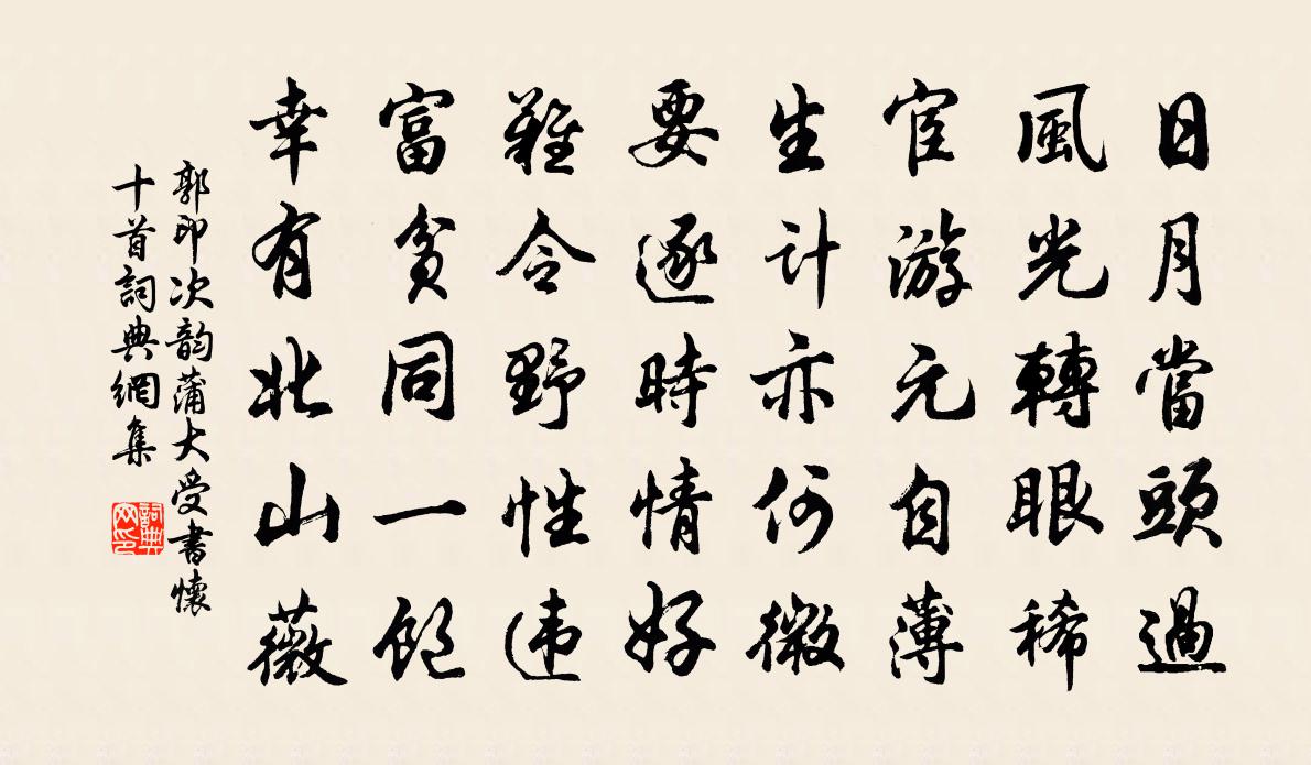 詩詞名句歷史字典書法欣賞書法字典國語詞典說文解字康熙字典古漢語字典標 題 作 者 詩 句 次韻蒲大受書懷十首作者:郭印 朝代:宋代次韻蒲大受書懷十首原文日月當頭過,風光轉眼稀。宦遊元自薄,生計亦何微。要逐時情好,難令野性違。富貧同一飽,幸有北山薇。詩詞問答問:次韻蒲大受書懷十首的作者是誰?答:郭印問:次韻蒲大受書懷十首寫於哪個朝代?答:宋代郭印次韻蒲大受書懷十首書法欣賞次韻蒲大受書懷十首書法作品詩詞推薦寄源大師釋慧遠〔宋代〕學佛以悟為則,虛詞不入公門。君看羲之草聖,一點入石三分。享太廟樂章李回〔唐代〕受天明命,敷祐下土。化時以儉,衛文以武。氛消夷夏,俗臻往古。億萬斯年,形於律呂。答謝法曹劉克莊〔宋代〕二詩簡澹掃穠華,作者幾無以復加。璧十五城方定價,桃三千歲一開花。選騷意度卑唐體,晉宋文章讓謝家。莫道川撥棹王哲〔元代〕一更里,瞥看參羅萬象列。搜出那坐正曇,內中位貌偏別。向北方也,玉花結。銀素將來細得熱。把烏龜牢纏紲。到馬塍哭堯章蘇泂〔宋代〕南宮垂上鬢星星,畢竟襴衫不肯青。除卻樂書誰殉葬,一琴一硯一蘭亭。臨江仙晁端禮〔宋代〕今夜征帆何處落,煙村幾點人家。莫驚雙淚向風斜。漁人西塞曲,商女後庭花。從此五湖歸去好,一杯酒送生涯。賦墨鷺陳著〔宋代〕山林以為家兮,出而與風煙之為縹緲。水之湄素所狎兮,專一嗜而謀飽。紛紛下而上兮,若不能以終日。矯靜潔以聞雁陸游〔宋代〕過盡梅花把酒稀,熏籠香冷換春衣。秦關漢苑無訊息,又在江南送雁歸。小舟過吳江風雨大作夜泊三家村翌日風回到家孫應時〔宋代〕短篷僅容坐,一滴不通雨。不料西南風,滂沛遽如許。盪搖首屢觴,跧彎背欲僂。筆經四橋側,心動不敢語。茫洋送蕃叟弟赴江西帥幕分韻得獨字陳傅良〔宋代〕生平未省友松竹,愛言從宦輸幽獨。子也諸侯老賓客,襆被僅緣升斗祿。為問江神何世情,霽月光風送帆幅。天意關中言懷黃滔〔唐代〕三秦五嶺意,不得不依然。跡寓枯槐曲,業蕪芳草川。花當落第眼,雨暗出城天。層閣浮雲外,何人動管弦。長生草樓鑰〔宋代〕玻璃擢葉玉蟠根,千里提攜寄海濱。雨澤不霑仍自潤,土膏無著自長春。歲寒秀色鎮依舊,日暖素英能一新。我欲放歌行陸機〔魏晉〕容華夙夜零。無故自消歇。 過吳門釋永頤〔宋代〕故苑煙花百草香,五湖人去事茫茫。浮雲幾度春陰合,猶見西山白鷺行。八聲甘州·靈岩陪庾幕諸公游吳文英〔宋代〕渺空煙、四遠是何年,青天墜長星?幻蒼崖雲樹,名娃金屋,殘霸宮城。箭徑酸風射眼,膩水染花腥。時靸雙鴛響人日出遊湖上十首楊萬里〔宋代〕放閘冷泉亭,抽動一天碧。平地跳雪山,晴空下霹靂。句南鄭殿丞〔宋代〕青鳥幾傅王母信,白鵝曾換右軍書。早入朝書事竇牟〔唐代〕紫陌紛如畫,彤庭郁未晨。列星沈騎火,殘月暗車塵。隱軫排霄翰,差池跨海鱗。玉聲繁似樂,香澤散成春。嘆息即事韋莊〔唐代〕亂世時偏促,陰天日易昏。無言搔白首,憔悴倚東門。和王安撫六言十首項安世〔宋代〕從來賜達由果,不說島瘦郊寒。政譽追還小范,詩名壓倒方乾。名句推薦春田龜坼苗不滋,猶賴立春三日雪。王士禎《春不雨》 治國者,必以奉法為重。羅貫中《三國演義·第九十六回》 塞垣多少思歸客,留著長條贈遠遊。朱栴《官橋柳色》 若順吾皇意,即無臣子心。棲蟾《送遷客》 輕舟泛月尋溪轉,疑是山陰雪後來李白《東魯門泛舟二首》 民惟邦本,本固邦寧。佚名《尚書·夏書·五子之歌》 八年十二月,五日雪紛紛。白居易《村居苦寒》 清明過了,不堪回首,雲鎖朱樓。朱淑真《眼兒媚·風日遲遲弄輕柔》 恨無千日酒,空斷九迴腸。劉彤《臨江仙·千里長安名利客》 愛棄發之費,而忘長發之利,不知權者也。韓非及後人《韓非子·六反》
