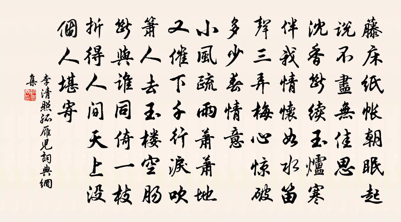 “藤床紙帳朝眠起,說不盡,無佳思 。”開門見山,傾訴寡居之苦。藤床,乃今之藤躺椅。據明高濂《遵生八箋》記載,藤製,上有倚圈靠背,後有活動撐腳,便於調節高低。紙帳,亦名梅花紙帳。據宋林洪《山家清供》雲,其上作大方形帳頂,四周用細白布製成帳罩,中置布單、楮衾、菊枕、蒲褥。在宋人詞作中 ,這種陳設大都表現淒涼慵怠情景 。朱敦儒《念奴嬌》云:“照我藤床涼似水。”意境相似,寫一榻橫陳,日高方起,心情孤寂無聊“沉香斷續玉爐寒”,使人想起詞人《醉花陰》中的“瑞胸銷金獸 ”。然而著一“寒”字 ,更突出了環境的淒冷與心境之痛苦。