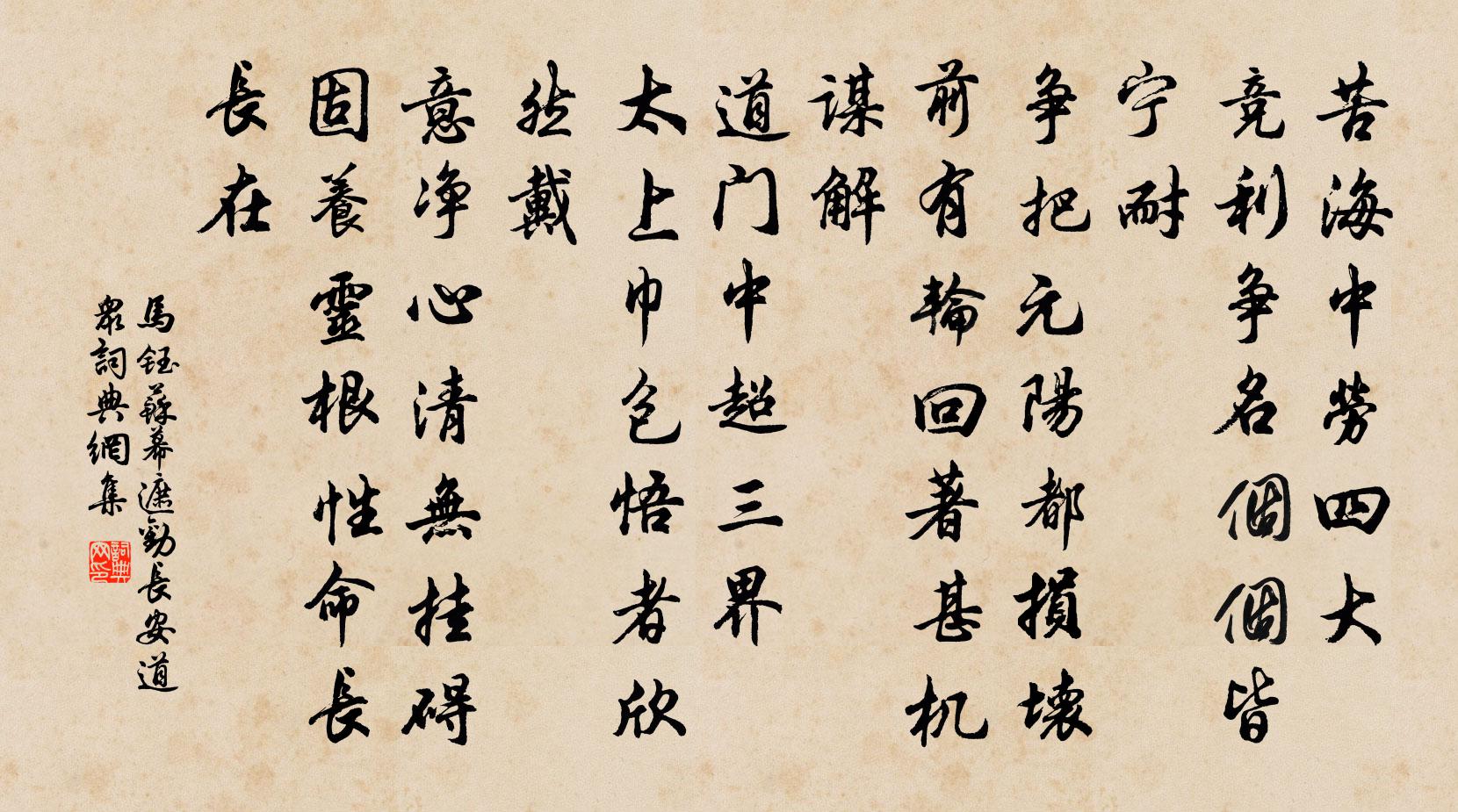 詩詞名句歷史字典書法欣賞書法字典國語詞典說文解字康熙字典古漢語字典標 題 作 者 詩 句 蘇幕遮 勸長安道眾作者:馬鈺 朝代:元代蘇幕遮 勸長安道眾原文苦海中,勞四大。競利爭名,個個皆寧耐。爭把元陽都損壞。前有輪迴,著甚機謀解。道門中,超三界。太上巾包,悟者欣然戴。意淨心清無掛礙。固養靈根,性命長長在。詩詞問答問:蘇幕遮 勸長安道眾的作者是誰?答:馬鈺問:蘇幕遮 勸長安道眾寫於哪個朝代?答:元代問:蘇幕遮 勸長安道眾是什麼體裁?答:詞馬鈺蘇幕遮 勸長安道眾書法欣賞蘇幕遮 勸長安道眾書法作品詩詞推薦鷓鴣天姚述堯〔宋代〕昨夜東風到海涯。繁紅簇簇吐胭脂。恍疑仙子朝天罷,醉面勻霞韻更宜。歡未足,困相依。羞將蘭麝污天姿。少陵句張耒〔宋代〕須看遠山相對蹙,莫欺病齒惱衰翁。錢塘懷古率堵無傲同賦楊維楨〔元代〕天山乳鳳飛來小,南渡衣冠又六朝。劫火 * 楊璉塔,箭鋒猶抵伍胥潮。磷光夜附山精出,龍氣秋隨海霧消。惟有金蓮出玉花 本名減字木蘭花 贈大畢先生馬鈺〔元代〕畢公好志。官障私魔心不二。決烈修持。能可移山志不移。塵緣一削。世上榮華無染著。可稱仙徒。堪許完全大藥次陳仲文八月十二八韻潘牥〔宋代〕痴雲吹盡月行天,新琢冰輪欠半邊。須信缺中元不缺,便教圓處可長圓。寒生沙渚雁初下,冷浸紗窗人未眠。萬事榴皮題壁朱景行〔宋代〕白酒延賓出自如,收書養性務三餘。山人醉吐驚人句,卻向東庵素壁書。感事陸游〔宋代〕捫虱當時頗自奇,功名遠付十年期。酒澆不下胸中恨,吐向青天未必知。頌古三十一首釋安永〔宋代〕九曲那容眨眼看,操舟誰解別波瀾。文殊曾展回天手,直得朝宗萬派乾。南亭曉坐因以示璩權德輿〔唐代〕隱几日無事,風交松桂枝。園廬含曉霽,草木發華姿。跡似南山隱,官從小宰移。萬殊同野馬,方寸即靈龜。弱質秋日西湖朱浚〔宋代〕幾州陵變谷,經月雨為霖。世事今如此,西風動客心。詠史下夏侯令女陳普〔宋代〕諸公競起滅彝倫,特立當年一女身。盡付輕塵棲弱草,便從正始斷無人。潦雨排悶二首仇遠〔宋代〕淫雨喧中夜,羈人積隱憂。葵傾那有日,麥腐欲無秋。小市渾如洗,前溪漫不流。林鳩兼垤鸛,聒聒幾時休。次韻眉山胡宰喜雪魏了翁〔宋代〕龍公試手發陰機,瑣定愁雲陣不飛。老樹垂垂低欲壓,穉苗薿爛生輝。窮冬莫厭詩筒數,富歲先占訟缿稀。擬待明禁火日(第七句缺一字)溫庭筠〔唐代〕駘蕩清明日,儲胥小苑東。舞衫萱草綠,春鬢杏花紅。馬轡輕銜雪,車衣弱向風。□愁聞百舌,殘睡正朦朧。壽東師楊尚書程公許〔宋代〕去年拜公北定堂,中秋玩月喧絲簧。長風趣駕泝江艇,恨不初度{奭斗}一觴。轉頭玉鑒秋又滿,北定風景遙相望晚春真山民〔宋代〕有恨青春老,無營白晝長。葉新林換綠,花落地生香。雨意一番足,人家百事忙。為儒竟成誤,悔不早農桑。次韻李晦父炎早梅曹彥約〔宋代〕華顛淡色催人老,造化無功春不早。翰林風月恣推排,萬馬一空三峽倒。冷暖從渠入世情,孤真為我參幽抱。單于湘中旅泊寄閻九司戶防①孟浩然〔唐代〕桂水通百越,扁舟期曉發。②荊雲蔽三巴,夕望不見家。③襄王夢行雨,才子謫長沙。長沙饒瘴癧,胡為苦留滯。偈頌七十八首釋正覺〔宋代〕同聲相應,同氣相求。同風千里,不隔絲頭。脫盡情塵訊息在,蘆花江上月明秋。安西館中思長安岑參〔唐代〕家在日出處,朝來起東風。風從帝鄉來,不異家信通。絕域地欲盡,孤城天遂窮。彌年但走馬,終日隨飄蓬。寂寞名句推薦弱柳青槐拂地垂,佳氣紅塵暗天起。盧照鄰《長安古意》 二月賣新絲,五月糶新谷。聶夷中《詠田家 / 傷田家》 臨下以簡,御眾以寬;罰弗及嗣,賞延於世。佚名《尚書·虞書·大禹謨》 且就洞庭賒月色,將船買酒白雲邊。李白《游洞庭湖五首·其二》 垓下美人泣楚歌,定陶美人泣楚舞,真龍亦鼠虎亦鼠。王象春《書項王廟壁》 蓬生麻中,不扶而直;白沙在涅,與之俱黑。荀子《荀子·勸學》 遠信入門先有淚,妻驚女哭問何如。元稹《得樂天書》 還卿一缽無情淚,恨不相逢未剃時。蘇曼殊《本事詩十首·選二》 春愁凝思結眉心,綠綺懶調紅錦薦。顧敻《玉樓春·拂水雙飛來去燕》 歌聲未盡處,先淚零周邦彥《綺寮怨·上馬人扶殘醉》