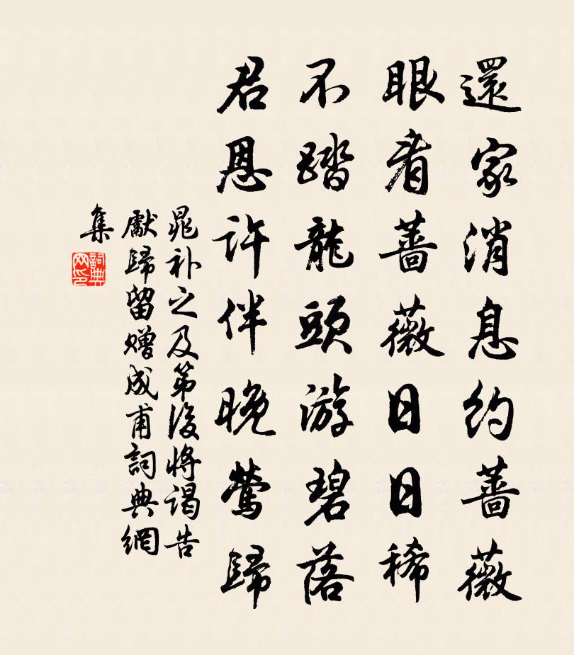 詩詞名句歷史字典書法欣賞書法字典國語詞典說文解字康熙字典古漢語字典標 題 作 者 詩 句 及第後將謁告先歸留贈成甫作者:晁補之 朝代:宋代及第後將謁告先歸留贈成甫原文還家訊息約薔薇,眼看薔薇日日稀。不踏龍頭游碧落,君恩許伴晚鶯歸。詩詞問答問:及第後將謁告先歸留贈成甫的作者是誰?答:晁補之問:及第後將謁告先歸留贈成甫寫於哪個朝代?答:宋代問:晁補之的名句有哪些?答:晁補之名句大全晁補之及第後將謁告先歸留贈成甫書法欣賞及第後將謁告先歸留贈成甫書法作品詩詞推薦高竹八首邵雍〔宋代〕高竹逾冬青,四月方易葉。抽萌如止戈,解籜若脫甲。脩靜信可愛,繞行不知匝。嗟哉凡草木,徒自費鋤鍤。太尉王公以九錫命大將軍讓公將還京邑祖餞贈陸雲〔魏晉〕悠悠征人。四牡騑騑。發軫北京。振策紫微。昔乃雲來。春林方輝。歲亦暮止。之子言歸。道塗興戀。伏載稱徽。詩二首王梵志〔唐代〕我有一方便, 價值百匹練。相打長伏弱, 至死不入縣。他人騎大馬, 我獨跨驢子。回顧擔柴漢, 心下較些臨江仙(離果州作)陸游〔宋代〕鳩雨催成新綠,燕泥收盡殘紅。春光還與美人同。論心空眷眷,分袂卻匆匆。只道真情易寫,那知怨句難工。水流草 / 賦得古原草送別白居易〔唐代〕離離原上草,一歲一枯榮。野火燒不盡,春風吹又生。遠芳侵古道,晴翠接荒城。又送王孫去,萋萋滿別情。青春韓偓〔唐代〕眼意心期卒未休,暗中終擬約秦樓。光陰負我難相遇,情緒牽人不自由。遙夜定嫌香蔽膝,悶時應弄玉搔頭。櫻桃秋日登美美亭張詠〔宋代〕野人官職與心違,何況經年未得歸。一夕秋風無限思,偶來憑檻到斜暉。偈頌一百二十三首釋崇岳〔宋代〕一方一所,叢林保社。或廢或興,截鐵斬釘。推倒嘉州大像,扶起迦葉師史,管取曹源一派清。五月二十三日懷歸二首方回〔宋代〕拔茅猶在盍歸休,何事清河日倚樓。百歲四分三已過,十朝九醉一無愁。獨遺蕙帳容逋客,誰向瓜田識故侯。定是送友人之京孟浩然〔唐代〕君登青雲去,余望青山歸。雲山從此別,淚濕薜羅衣。題趙有翼叢桂小山仲並〔宋代〕剩引桂枝叢小山,鶩行姑去自余閒。人懷昆玉未當價,花與萊衣相映斑。佳樹非煙曉蔥鬱,幽泉不雨夜潺湲。頓移東湖鄭清之〔宋代〕誰將東湖光,斂作大圓鑒。千峰就妝束,萬旬互窺瞰。紅消日腳明,綠淨山影蘸。我來一登臨,扁舟隱可纜。寄灃州張舍人笛杜牧〔唐代〕發勻肉好生春嶺,截玉鑽星寄使君。檀的染時痕半月,《落梅》飄處響穿雲。樓中威鳳傾冠聽,沙上驚鴻掠水分。頌古一百首釋智愚〔宋代〕生平未審何言句,得似羚羊掛角時。拊擊自然皆率舞,不須羌管隔雲吹。卜運算元陳三聘〔宋代〕雪後竹枝風,醉夢風吹醒。瘦立寒階滿地春,淡月梅花影。門外轆轤寒,曉汲喧金井。長笛何人更倚樓,玉指風前郊園聞蟬,寄諸弟韋應物〔唐代〕去歲郊園別,聞蟬在蘭省。今歲臥南譙,蟬鳴歸路永。夕響依山谷,餘悲散秋景。緘書報此時,此心方耿耿。吉水作尉酬高援秀才見贈李中〔唐代〕佐邑慚無術,敢言貧與清。風騷誰是主,煙月自關情。自惜身薄祜行曹叡〔魏晉〕出身秦川。爰居伊洛。閒居雜詠三十二首目陳淳〔宋代〕目所以司視,視正乃為明。非禮謹勿睹,睹之則為盲。薊門不遇王之渙、郭密之,因以留贈高適〔唐代〕適遠登薊丘,茲晨獨搔屑。賢交不可見,吾願終難說。迢遞千里游,羈離十年別。才華仰清興,功業嗟芳節。曠盪名句推薦湘江千歲未為陵,水底魚龍應識字。鮑溶《襄陽懷古》 向來吟秀句,不覺已鳴鴉。韓翃《酬程延秋夜即事見贈》 野店垂楊步,荒祠苦竹叢。范成大《寒食郊行書事》 病骨支離紗帽寬,孤臣萬里客江乾。陸游《病起書懷》 正是浴蘭時節動。菖蒲酒美清尊共。歐陽修《漁家傲·五月榴花妖艷烘》 母別子,子別母,白日無光哭聲苦。白居易《母別子》 水溢芙蓉沼,花飛桃李蹊。薛道衡《昔昔鹽》 曾經滄海難為水,除卻巫山不是雲。元稹《離思五首·其四》 隋堤上、曾見幾番,拂水飄綿送行色。周邦彥《蘭陵王·柳》 郵亭無人處,聽檐聲不斷,困眠初熟。周邦彥《大酺·越調春雨》