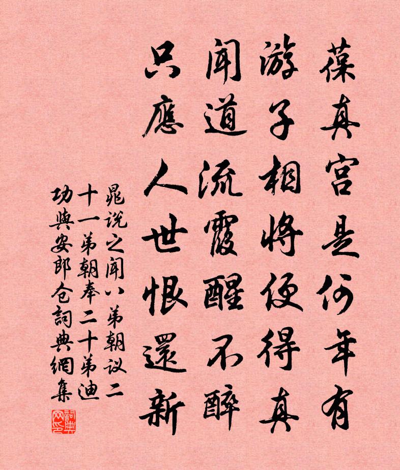 詩詞名句歷史字典書法欣賞書法字典國語詞典說文解字康熙字典古漢語字典標 題 作 者 詩 句 聞八弟朝議二十一弟朝奉二十弟迪功與安郎倉作者:晁說之 朝代:宋代原文葆真宮是何年有,遊子相將便得真。聞道流霞醒不醉,只應人世恨還新。詩詞問答問:《聞八弟朝議二十一弟朝奉二十弟迪功與安郎倉》的作者是誰?答:晁說之問:該詩寫於哪個朝代?答:宋代書法欣賞聞八弟朝議二十一弟朝奉二十弟迪功與安郎倉書法作品詩文賞析【原題】:聞八弟朝議二十一弟朝奉二十弟迪功與安郎倉部謝郎比部諸人集於葆真宮戲作絕句詩詞推薦辛卯滿散天基節即事六首劉克莊〔宋代〕聞說都人競出嬉,御街簫鼓倍年時。相公入奏天顏喜,半夜揚州送捷旗。蜀綿州越王樓詩樊宗師〔唐代〕危樓倚天門,如星辰宮。!榱薄龍虎怪,洄洄繞雷風。徂秋試登臨,大靄屯喬空。不見西北路,考懷益雕窮。石瀨春行次韻洪咨夔〔宋代〕拂開芳草碧,坐斷落花紅。世味觥籌外,年華帶眼中。六州空鑄角,萬物任為銅。有鷕桑疇雉,逢時會長雄。再會薛黃庭白玉蟾〔宋代〕別來真夢耳,相對各潸然。一向於湖海,如今更市廛。知心能有幾,顧影獨興憐。自歡吾衰矣,猶期子勉旃。宮女圖高啟〔明代〕 * 扶醉踏蒼苔,明月西園侍宴回。小犬隔花空吠影,夜深宮禁有誰來?義副寺求釋堅璧〔宋代〕拈卻義,除卻法,過現未來,不消一劄。大海波騰河四流,激湍袞袞吞三峽。須彌山王拊掌笑,江神河神俱{左足次韻方教采芹亭方岳〔宋代〕終日看山自一奇,寒溪更與月相宜。採芹人去夜岑寂,政是先生得意時。賀新郎葉夢得〔宋代〕睡起流鶯語。掩青苔、房櫳向晚,亂紅無數。吹盡殘花無人見,惟有垂楊自舞。漸暖靄、初回輕暑。寶扇重尋明月隔浦蓮(春行用美成韻)趙必〔宋代〕東風吹長嫩葆。花塢穿青窈。玉管新聲,金鈴顫響驚青鳥。行樂莫草草。春光鬧。鴛浴垂楊沼。紅嬌小。梳宮樣、湖闊李群玉〔唐代〕楚色籠青草,秋風洗洞庭。夕霏生水寺,初月盡雲汀。棹響來空闊,漁歌發杳冥。欲浮闌下艇,一到斗牛星。送嵩上人住庵釋正覺〔宋代〕世間塵雜長人癭,歸臥蘿龕霜月影。里許離微妙轉功,玉壺夜汲瑠璃井。吾家語味嚼枯硬,醉飽回來雙眼冷。雲水書龍頭義約簿二首李昴英〔宋代〕桂菊風香造榜天,門標捷幟地流錢。筆端快便行年順,騎鶴纏腰身兩全。送任畹評事赴沂海姚合〔唐代〕擲筆不作尉,戎衣從嫖姚。嚴冬入都門,仆馬氣益豪。沂州右鎮雄,士勇旌旗高。洛東無憂虞,半夜開虎牢。丈夫次韻和原甫陪永叔景仁聖徒飲余家題庭中枯菊梅堯臣〔宋代〕九月車馬過,我庭 * 鮮。重來踰七旬,枯萼無復妍。自非凌霜操,枝葉徒相連。衰敗未忍去,根荄尚翹然。不意三月十三日步至杏亭黃彥平〔宋代〕禪房幽討有誰期,竹徑穿花蝶不知。山擁暮寒斜照里,樹含芳思欲開時。和風第放千林喜,勝日閒成一段奇。何必送明甫初筮十首劉克莊〔宋代〕記取元城語,南州熱異常。別無衛生訣,止酒是丹方。別歲蘇軾〔宋代〕故人適千里,臨別尚遲遲。人行猶可復,歲行那可追。問歲安所之,遠在天一涯。已逐東流水,赴海歸無時。東鄰八六子(次篔房韻)李演〔宋代〕乍鷗邊、一番腴綠,流戲又怨苹花。看晚吹、約晴歸路,夕陽分落漁家。輕雲半遮。縈情芳草無涯。還報舞香一曲酹江月(春日)葛長庚〔宋代〕桃花開盡,正溪南溪北,春風春雨。寒食清明都過了,愁殺一聲杜宇。醉跨蹇驢,踏翻芳草,滿滿斟鸚鵡。遊仙夢亂山曾鞏〔宋代〕亂山深處轉山多,此地棲身奈遠何。莫問吾親在何處,舉頭東岸是新羅。名句推薦寵柳嬌花寒食近,種種惱人天氣。李清照《念奴嬌·春情》 易漲易退山溪水,易反易覆小人心。佚名《增廣賢文·上集》 利之所在,雖千仞之山無所不上,深源之下,無所不入焉。管仲《管子·禁藏》 俊眼修眉,顧盼神飛,文彩精華,見之忘俗。曹雪芹《紅樓夢·第三回》 朕以天下為憂,豈直一 方耶?脫脫《宋史·本紀·卷六》 自見者不明;自是者不彰老子《老子·道經·第二十四章》 野幕敞瓊筵,羌戎賀勞旋。盧綸《和張僕射塞下曲·其四》 夢回人遠許多愁,只在梨花風雨處。辛棄疾《玉樓春·風前欲勸春光住》 金風細細。葉葉梧桐墜。晏殊《清平樂·金風細細》 朱弦已為佳人絕,青眼聊因美酒橫。黃庭堅《登快閣》
