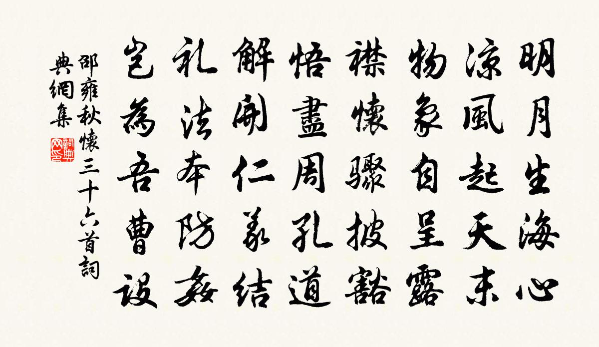 詩詞名句歷史字典書法欣賞書法字典國語詞典說文解字康熙字典古漢語字典標 題 作 者 詩 句 秋懷三十六首作者:邵雍 朝代:宋代秋懷三十六首原文明月生海心,涼風起天末。物象自呈露,襟懷驟披豁。悟盡周孔道,解開仁義結。禮法本防奸,豈為吾曹設。詩詞問答問:秋懷三十六首的作者是誰?答:邵雍問:秋懷三十六首寫於哪個朝代?答:宋代邵雍秋懷三十六首書法欣賞秋懷三十六首書法作品詩詞推薦黃潁州輓詞三首黃庭堅〔宋代〕臨民次公老,論事長輿通。袖有投虛刃,時無斲鼻工。風流前輩近,名實後人公。不謂三日別,今成萬事空。瑞鶴仙(立春)趙聞禮〔宋代〕凍痕消夢草。又招得春發,舊家池沼。園扉掩寒悄。倩誰將花信,偏傳深窈。追游趁早。便裁卻、春衫短帽。任殘送王景文入制幕二首李流謙〔宋代〕繾綣聯名第,飄零共塞垣。自知此事勝,更覺期文尊。欲別言萬苦,相期意略存。成都萬事好,只合近清樽。贈閭丘廣文趙汝鐩〔宋代〕奔走異軌轍,聚散水上萍。誰知風月夕,同登藕花亭。駒隙晝夜駃,塵埃鬢俱星。朋舊半埋玉,念此慨頹齡。天涯春日作李中〔唐代〕和氣來無象,物情還暗新。乾坤一夕雨,草木萬方春。染水煙光媚,催花鳥語頻。高台曠望處,歌詠屬詩人。南鄉子·歸夢寄吳檣陸游〔宋代〕歸夢寄吳檣,水驛江程去路長。想見芳洲初系纜,斜陽,煙樹參差認武昌。愁鬢點新霜,曾是朝衣染御香。重到故虞美人(贈蔡子因)葉夢得〔宋代〕梅花落盡桃花小。春事余多少。新亭風景尚依然。白髮故人相遇、且留連。家山應在層林外。悵望花前醉。半天煙尋梅道士(一作尋梅道士張山人)孟浩然〔唐代〕彭澤先生柳,山 * 士鵝。我來從所好,停策夏雲多。重以觀魚樂,因之鼓枻歌。崔徐跡未朽,千載揖清波。送琉書記還長樂釋崇岳〔宋代〕迢迢故國三千里,忽憶萓堂送別時。拄杖生風興何極,楚天遼邈遠山低。酬仲微以舍弟忝直螭階余近塵鳳署見慶之作宋庠〔宋代〕世隱東畿賦遂功,荊枝相樂本田廬。偶隨幽鳥同還俗,何意驚鼷並載車。浴殿封芝慚視草,史階簪筆玷成書。猶欣官居戲詠陸游〔宋代〕萬里飄然似斷蓬,桐廬江上又秋風。判余牘尾棲鴉濕,衙退庭中立雁空。燈火市樓知酒賤,歌呼村路覺年豐。誰言偈頌一百零九首釋可湘〔宋代〕祖翁閫域,撲地掀天。親切一回打透,不妨垂手入廛。游終南山孟郊〔唐代〕南山塞天地,日月石上生。高峰夜留景,深谷晝未明。山中人自正,路險心亦平。長風驅松柏,聲拂萬壑清。到此汝州南潭陪陸中丞公宴孟郊〔唐代〕一雨百泉漲,南潭夜來深。分明碧沙底,寫出青天心。遠客洞庭至,因茲滌煩襟。既登飛雲舫,願奏清風琴。高岸古詩十九首·涉江采芙蓉佚名〔兩漢〕涉江采芙蓉,蘭澤多芳草。采之欲遺誰?所思在遠道。還顧望舊鄉,長路漫浩浩。同心而離居,憂傷以終老。秋夜謝朓〔南北朝〕秋夜促織鳴,南鄰搗衣急。思君隔九重,夜夜空佇立。北窓輕幔垂,西戶月光入。何知白露下,坐視階前濕。誰能行止吟邵雍〔宋代〕時止則須止,時行則可行。時行與時止,人力莫經營。邊上行貫休〔唐代〕黑松林外路,風角遠嗈嗈。朔氣生荒堡,秋塵滿病容。豺掊沙底骨,人上月邊烽。休作西行計,西行地漸凶。游洞霄俞洵直〔宋代〕九折山圍五洞天,中間玉殿倚祥煙。隔雲雞犬聞清曉,鎖徑松篁認永年。野鹿獻花來石室,寒猿擲果飲溪泉。玉皇檐玉鳴施樞〔宋代〕曉窗風細響檐鈴,一曲雲璈枕上聞。夢斷不知仙路杳,鶴銜松露入青雲。名句推薦三日柴門擁不開,階平庭滿白皚皚。柳宗元《酬王二十舍人雪中見寄》 蚤是傷春夢雨天,可堪芳草更芊芊。韋莊《長安清明》 高情已逐曉雲空。不與梨花同夢。蘇軾《西江月·梅花》 宜如臨深淵,如履薄冰,戰戰慄栗,日慎一日。范曄《後漢書·本紀·光武帝紀上》 張而不弛,文武弗能也;弛而不張,文武弗為也。一張一弛,文武之道也。戴聖《禮記·雜記下》 遙知未眠月,鄉思在漁歌。杜荀鶴《送人游吳》 青海陣雲匝,黑山兵氣沖。高適《塞下曲》 風吹柳花滿店香,吳姬壓酒喚客嘗。李白《金陵酒肆留別》 今夜不知何處宿,平沙萬里絕人煙。岑參《磧中作》 親履艱難者知下情,備經險易者達物偽。范曄《後漢書·列傳·張衡列傳》